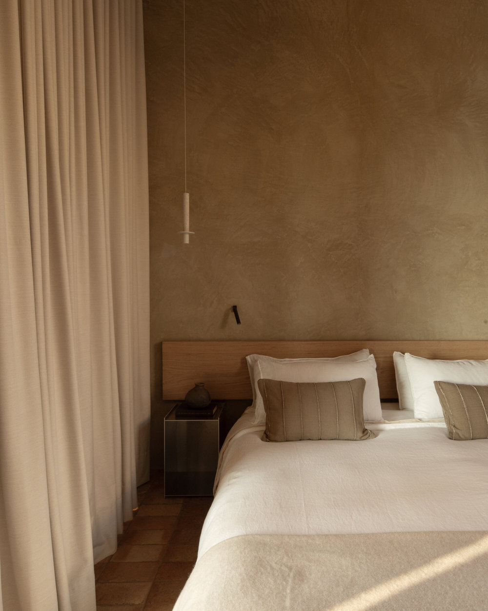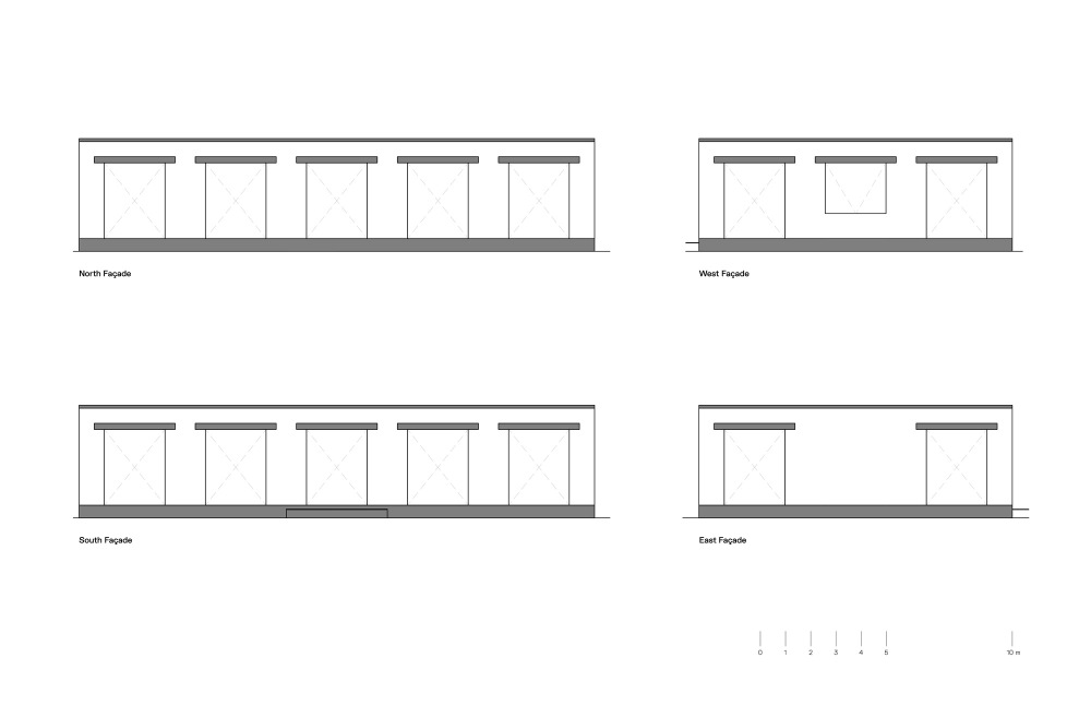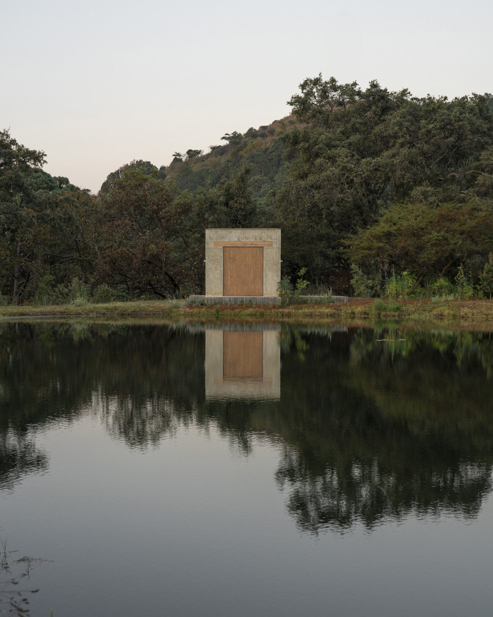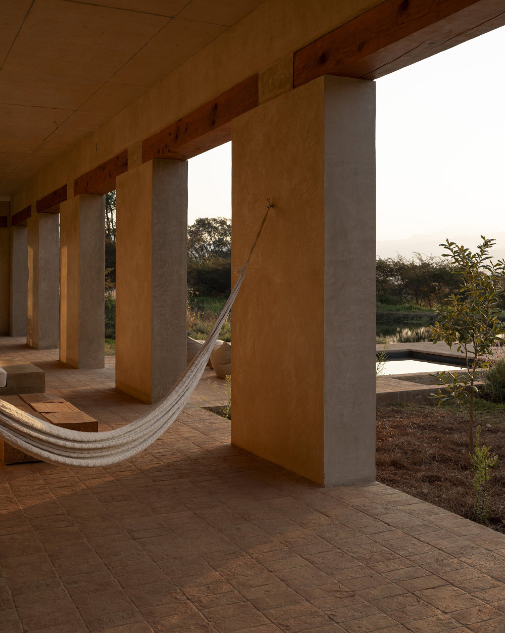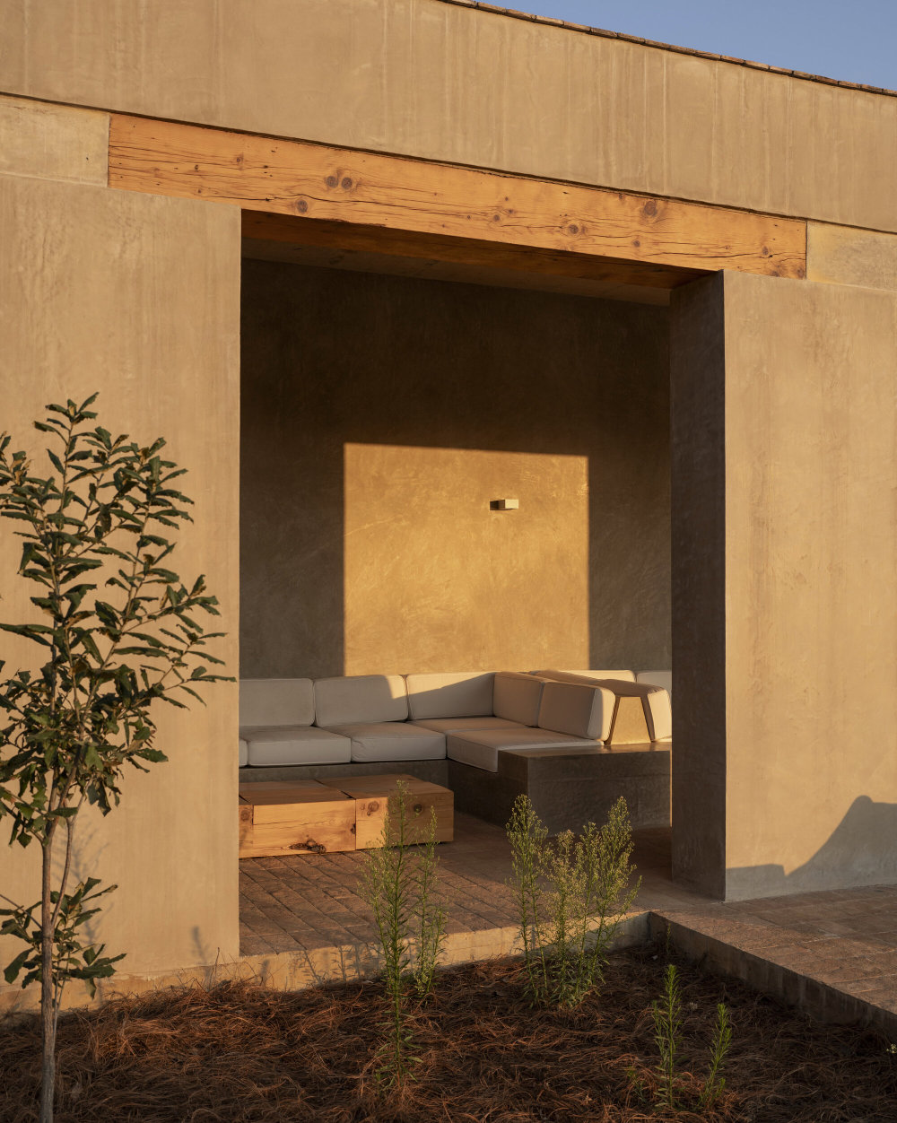 项目选址于地块的抬高区域,借由缓坡地形实现对乡野景致的 “全景式占有”。建筑主体以纵向形态沿场地边界排布,通过顺应地势起伏的绿色平台消弭建筑与大地的界限 —— 这种 “贴地生长” 的布局,既延续了乡土建筑的在地性,又以极简体量弱化了对自然景观的干预。面向湖面的一侧,建筑以无隔断的通透界面将水景纳入室内视野,湖面的波光与岸线的草木随四季流转,成为居住者抬眼可见的动态画卷;而车辆入口一侧则以厚重的土色墙体形成 “盲立面”,在隔绝外界纷扰的同时,以材质的质朴感呼应乡野环境的粗粝肌理。一闭一开之间,建筑既守护了内部空间的静谧,又实现了与自然的亲密对话。