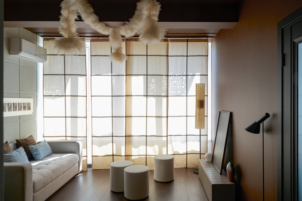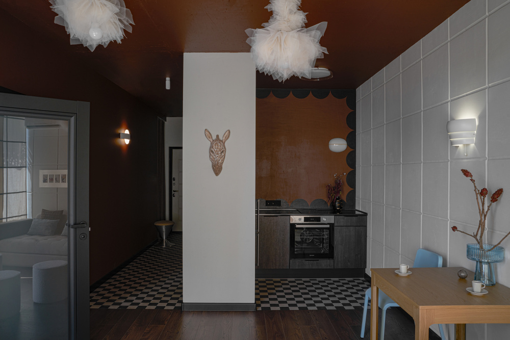 光影是空间的灵魂,为 “微奢” 空间赋予了灵动与层次。自然光的巧妙引入:大窗户设计搭配格纹窗帘,让自然光得以温柔地洒入室内。阳光透过窗帘的缝隙,在深棕墙面上投下斑驳的光影,为复古空间增添了一份动态的诗意;人工光的精致布局:人工照明根据不同区域的功能与氛围需求精心设计。客厅的羽毛造型吊灯,造型独特且光线柔和,营造出浪漫奢华的氛围;卧室的吊灯与壁灯组合,提供了多层次的照明,既满足了实用需求,又烘托出静谧、奢华的休憩氛围。小户型的布局设计,关键在于平衡功能与精致感。案例中采用了开放式与半开放式相结合的布局方式。公共区域的开放互动:客厅、餐厅与厨房区域采用开放式布局,打破了空间的界限,增强了区域间的互动性,让小空间显得更加开阔。同时,通过家具的摆放和材质的区分,又能在开放中形成功能分区,保证了空间的秩序感;私密区域的半开放设计:卧室等私密区域采用半开放式设计,既保证了空间的私密性,又通过玻璃等材质的运用,让空间视觉保持通透,避免了小空间的压抑感。