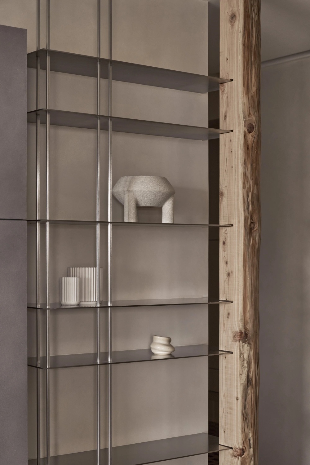 金属与玻璃的现代调和:金属与玻璃等现代材质的融入,为空间赋予了简洁利落的现代感。金属框架的玻璃展示架,既展现出精致的工艺,又以通透的视觉效果,让陈列其中的物品成为空间艺术的一部分,实现了自然与现代的和谐共生。