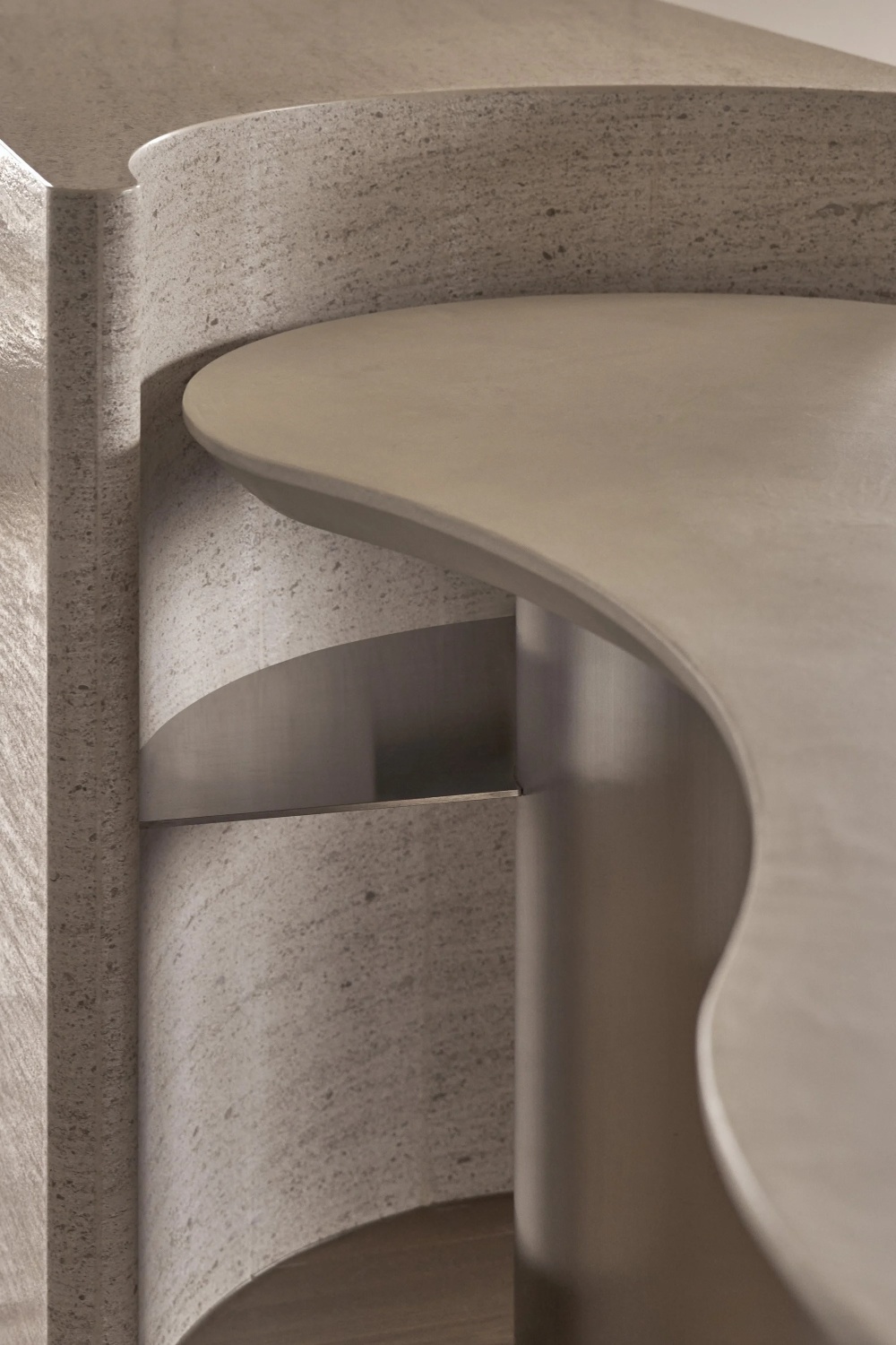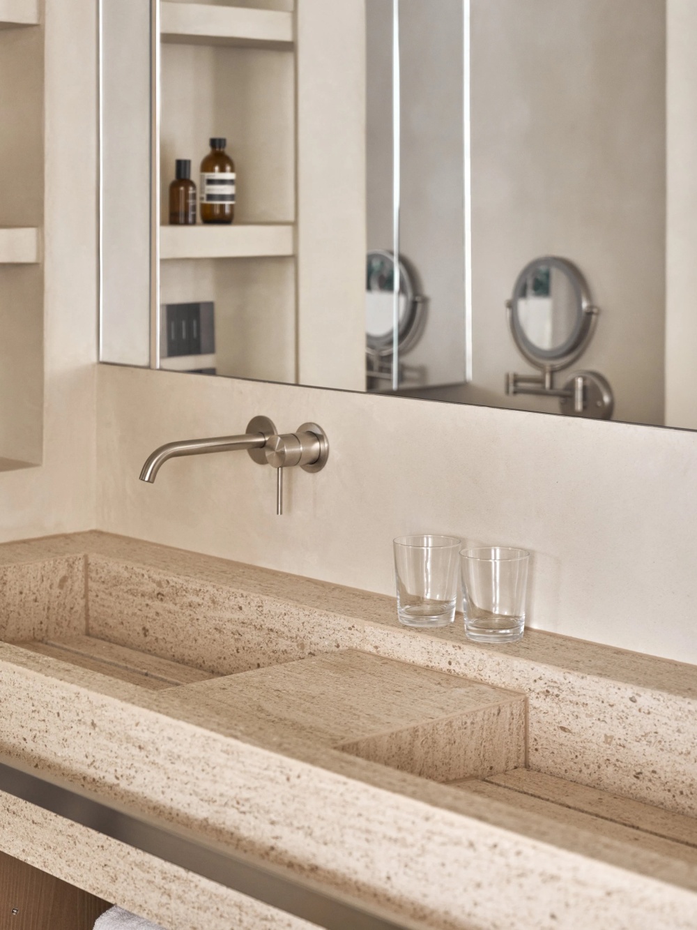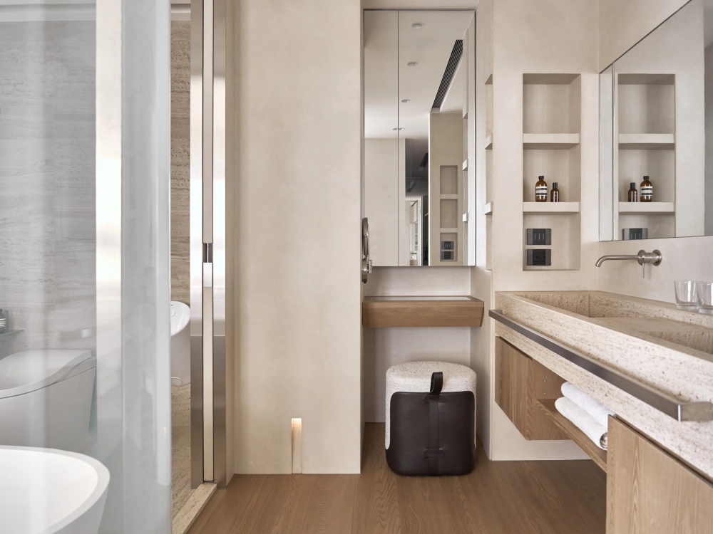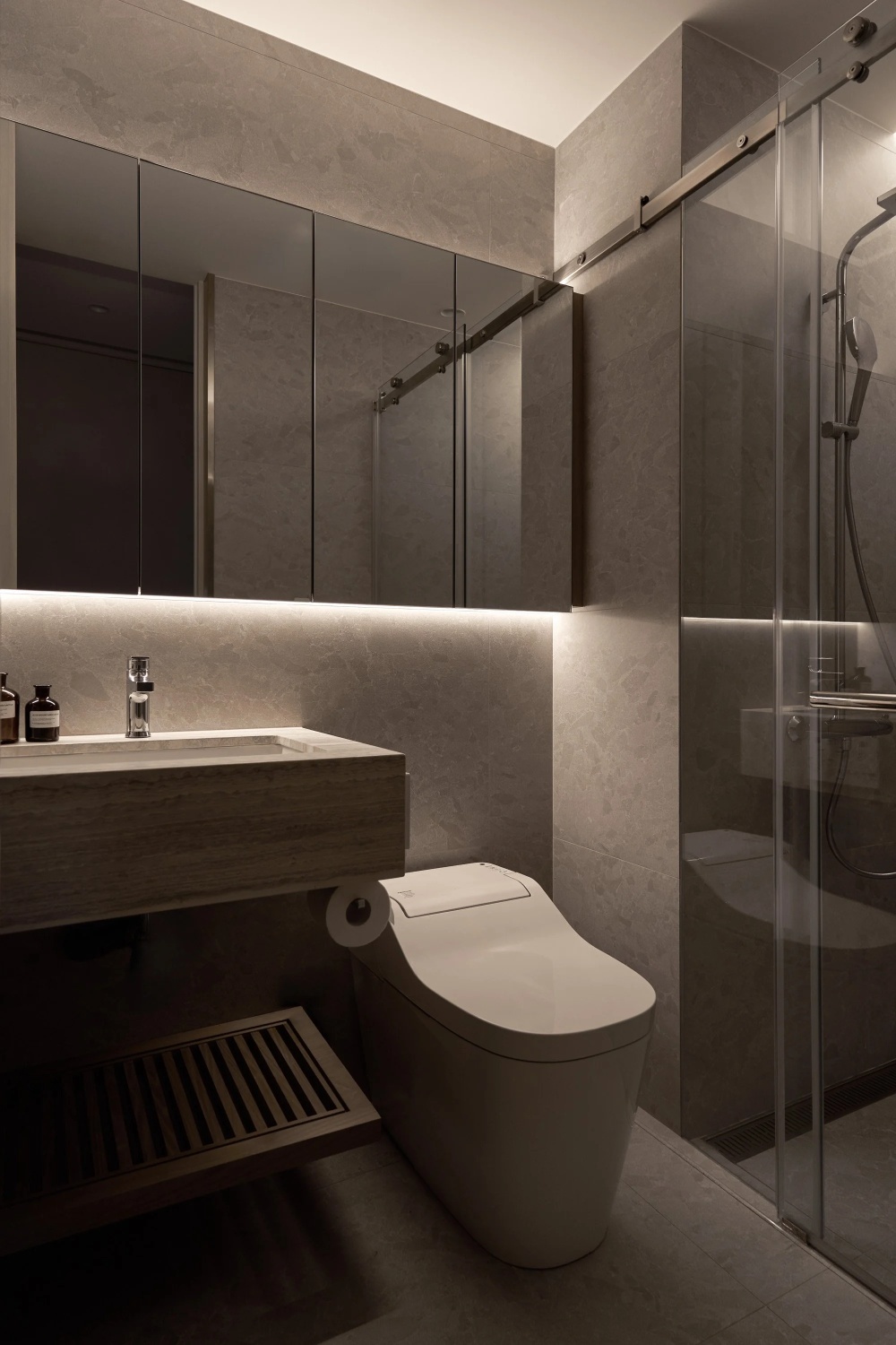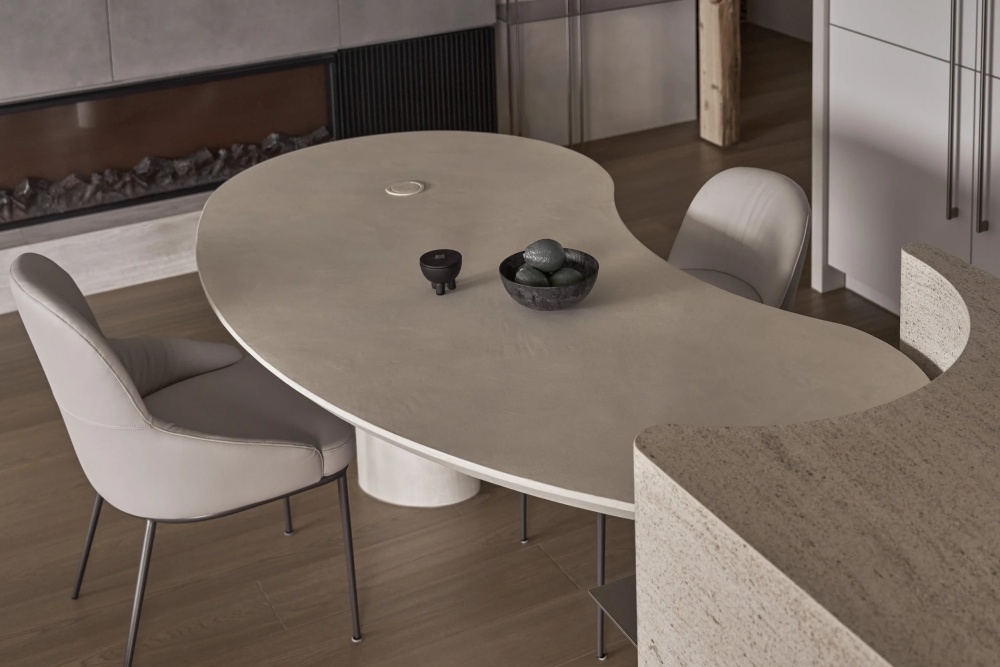 石材的雅致点缀:石材的运用则为空间增添了雅致与高级感。餐厅的石质餐桌,造型简约却质感十足,独特的肌理在灯光下若隐若现,成为空间中的视觉焦点;浴室的石材台面,兼具实用与美观,其冷峻中透着温润的质感,与木质元素相互映衬,丰富了空间的层次;