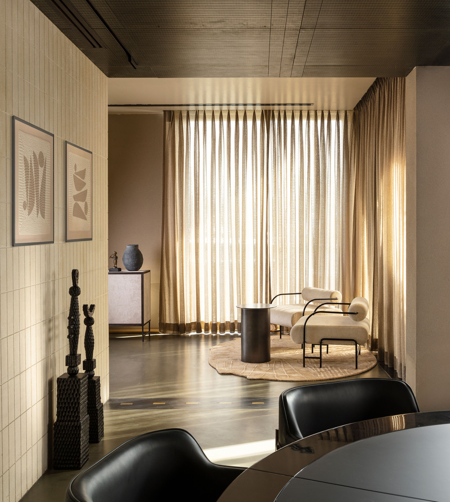 中层设有两间卧室和书房,各自独特的色调彰显出居住者的个性。这种对比在共享休息室中达到平衡,促进了两个空间之间的互动。露台层是一个宽敞开放的娱乐与接待区域,室内外空间在此无缝融合。室内被设计为一个游戏休闲区,一端是一面覆盖着瓜廖尔薄荷绿材质的弧形墙,另一端则是一个嵌入式吧台。脚下,深橄榄色的微水泥地面镶嵌着黄铜镶嵌物,色调对比鲜明。这些元素时而起到分隔空间的作用,时而又成为人们围坐在扑克桌旁的邀约。