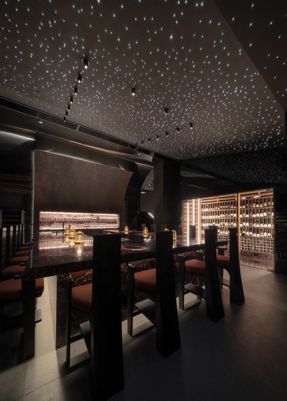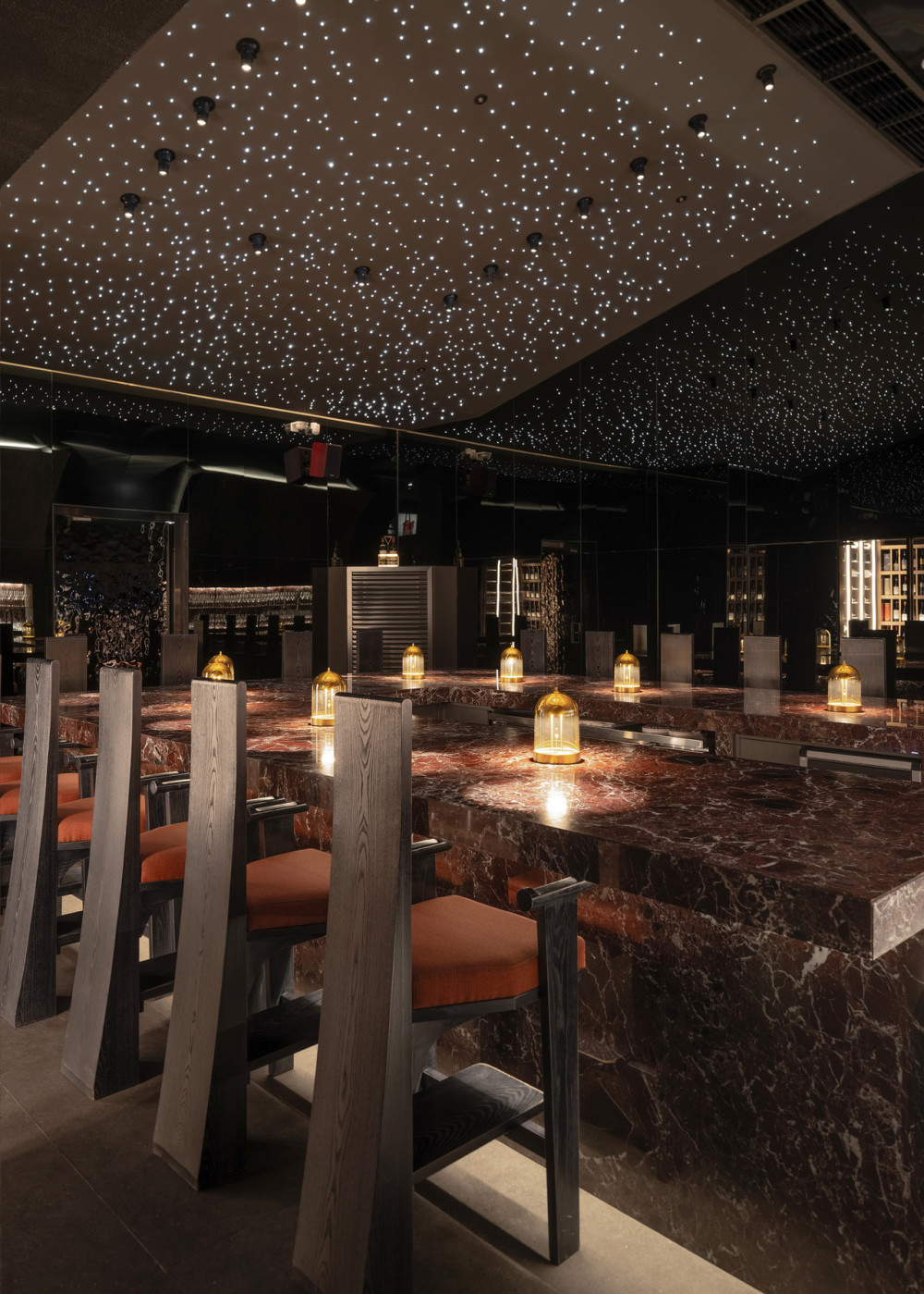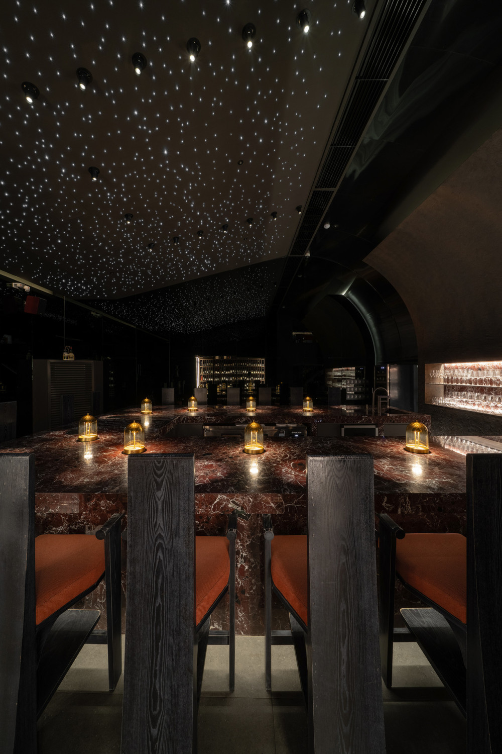 吧台台面选用深色红纹大理石,其天然的纹理如同星穹在地面的投影,既传递出奢华感,又与星空顶形成 “天地呼应”;墙面与家具则采用深炭色木材,经过做旧处理的肌理,为冷调空间注入了岁月的厚重感,避免了纯冷材质的疏离感。桌面的灯笼造型灯具,以黄铜为框架、玻璃为罩,暖黄色的光线透过玻璃晕染开来,如同星穹下的 “人造篝火”,中和了大理石与木材的冷硬;座椅的软包选用暖橙色织物,其细腻的触感与深色框架形成 “柔与刚” 的对比,让客座体验从 “视觉奢华” 延伸至 “触觉舒适”。