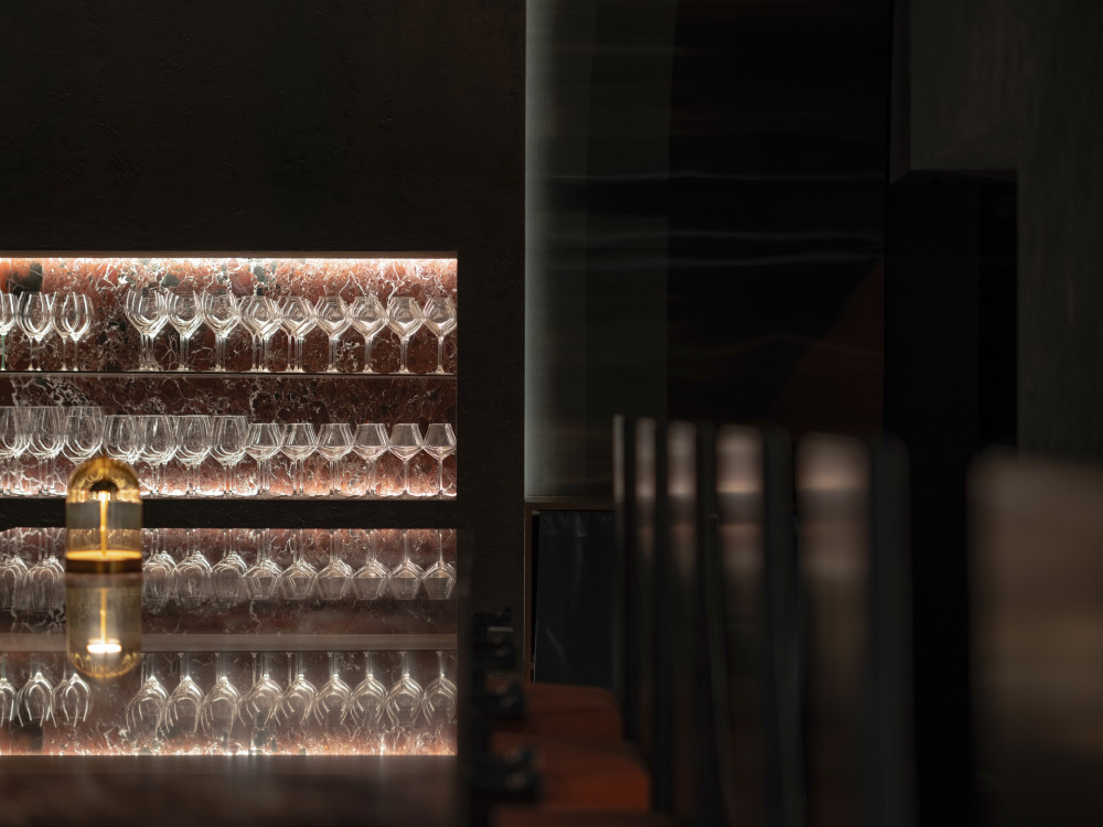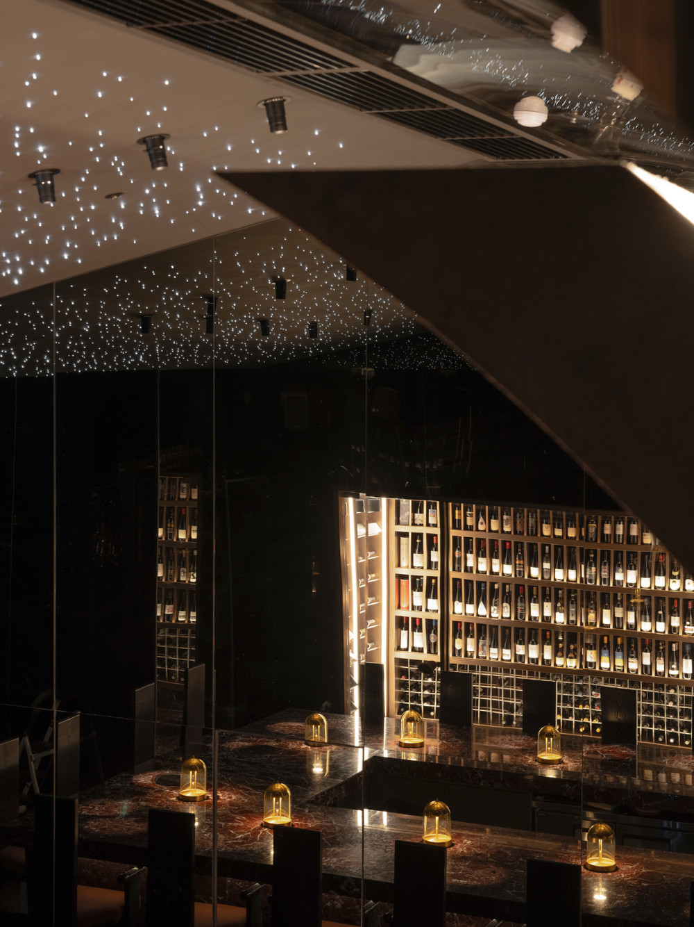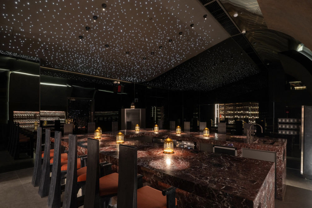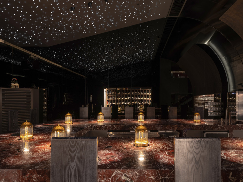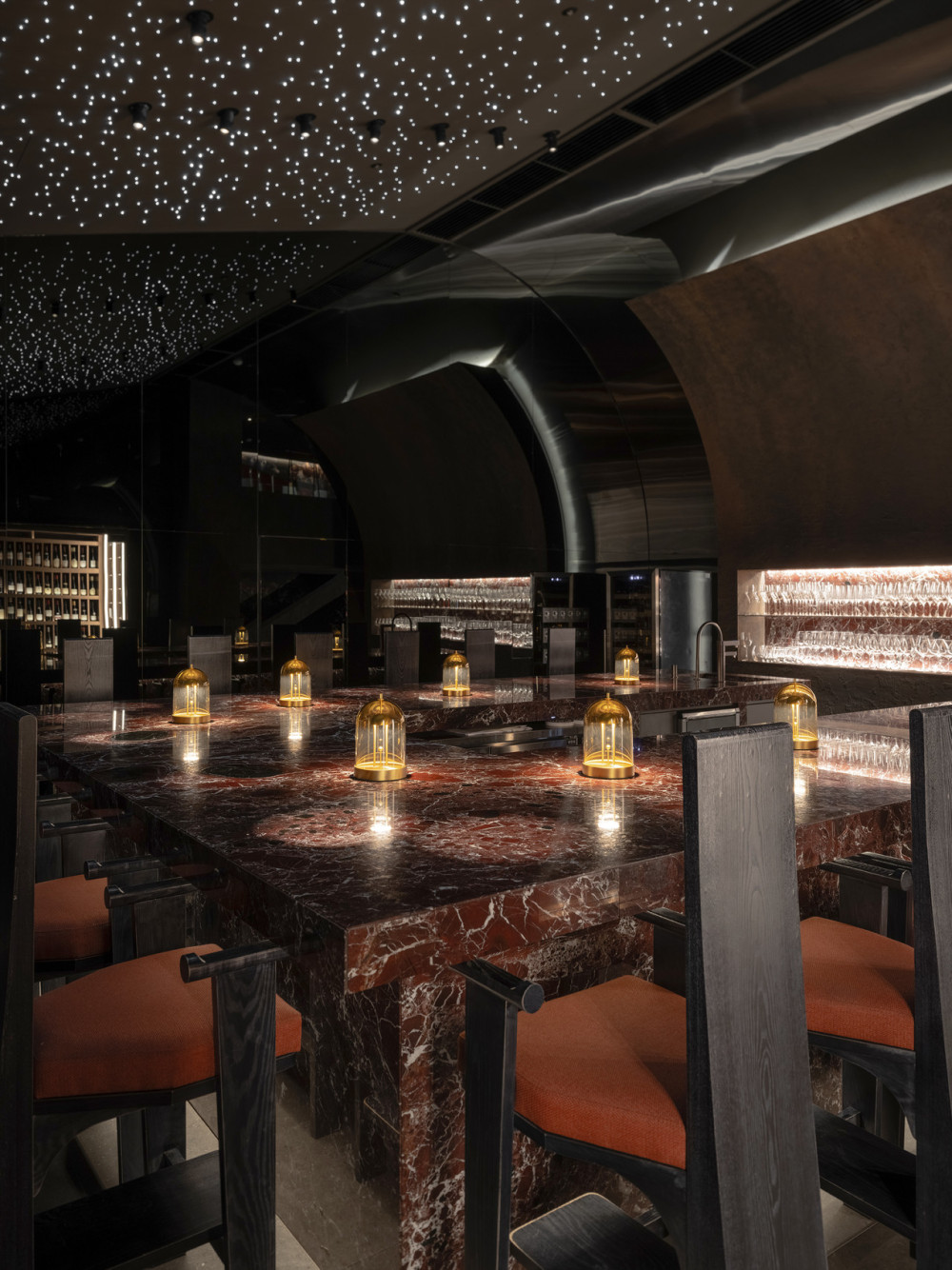 吧台台面选用深色红纹大理石,其天然的纹理如同星穹在地面的投影,既传递出奢华感,又与星空顶形成 “天地呼应”;墙面与家具则采用深炭色木材,经过做旧处理的肌理,为冷调空间注入了岁月的厚重感,避免了纯冷材质的疏离感。桌面的灯笼造型灯具,以黄铜为框架、玻璃为罩,暖黄色的光线透过玻璃晕染开来,如同星穹下的 “人造篝火”,中和了大理石与木材的冷硬;座椅的软包选用暖橙色织物,其细腻的触感与深色框架形成 “柔与刚” 的对比,让客座体验从 “视觉奢华” 延伸至 “触觉舒适”。