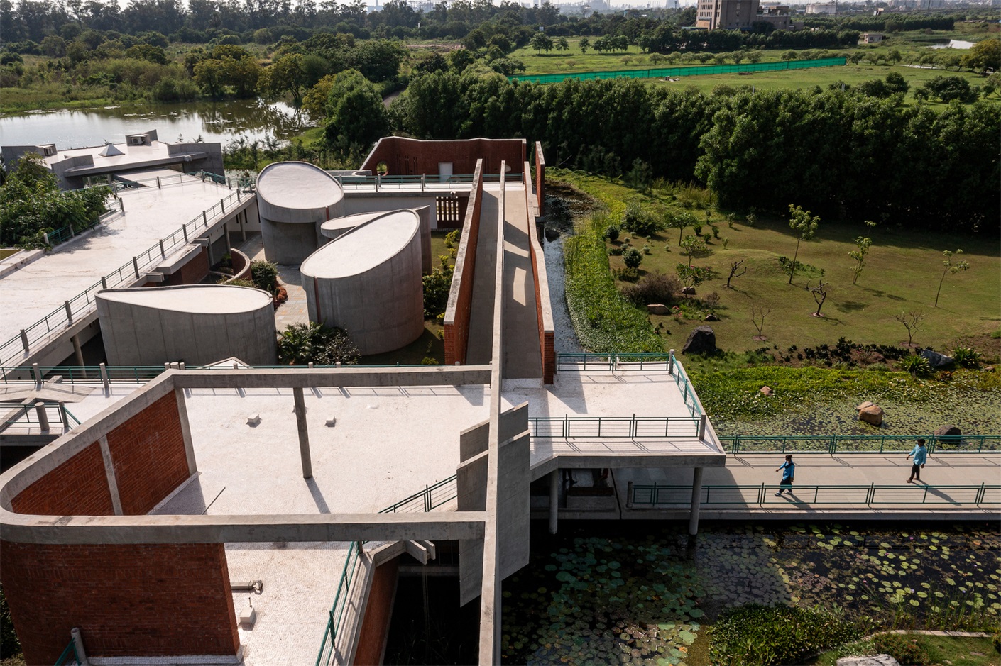设计融合了自然的五大元素,通过庭院、生物池塘,以及裸露砖块、混凝土和玻璃的搭配,构建出富有感官体验的空间叙事。雨水收集、种植本土植物等可持续实践,确保了与低洼场地的和谐共生。
