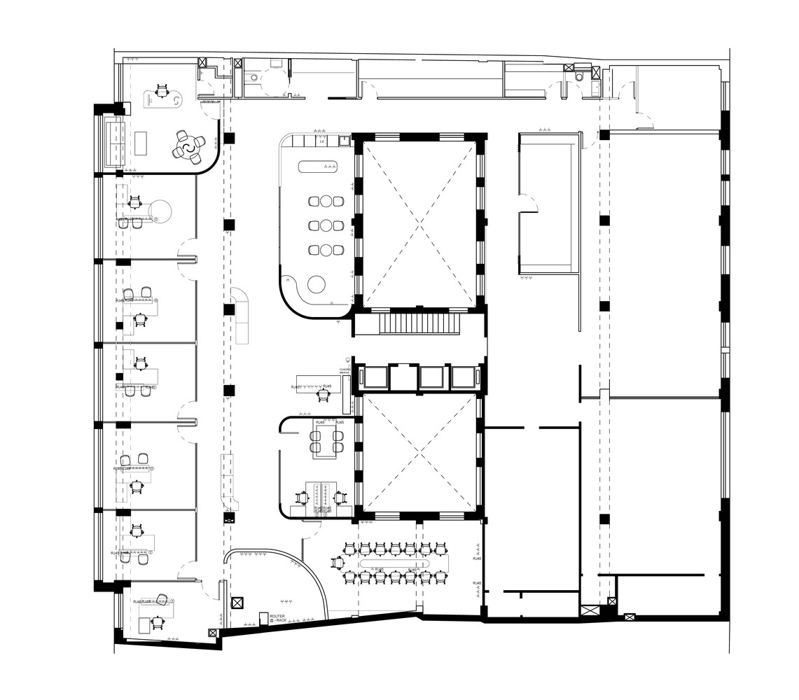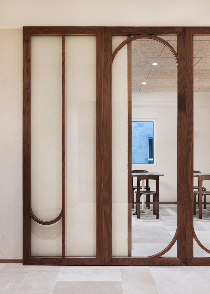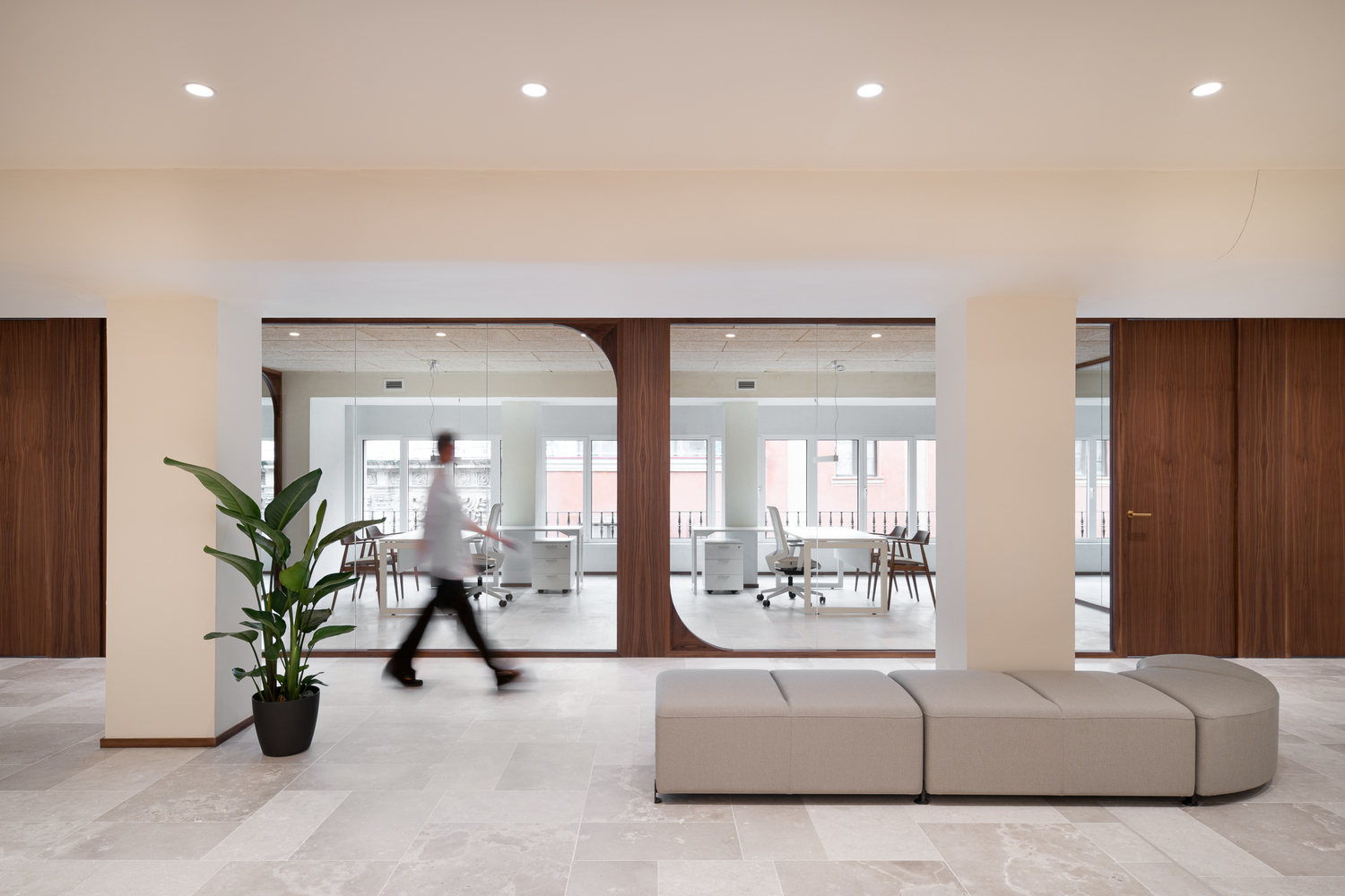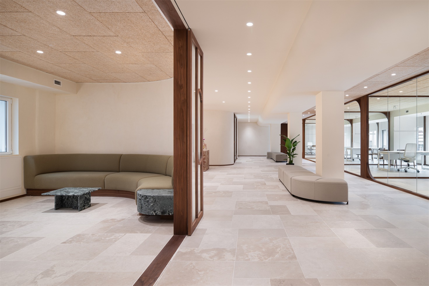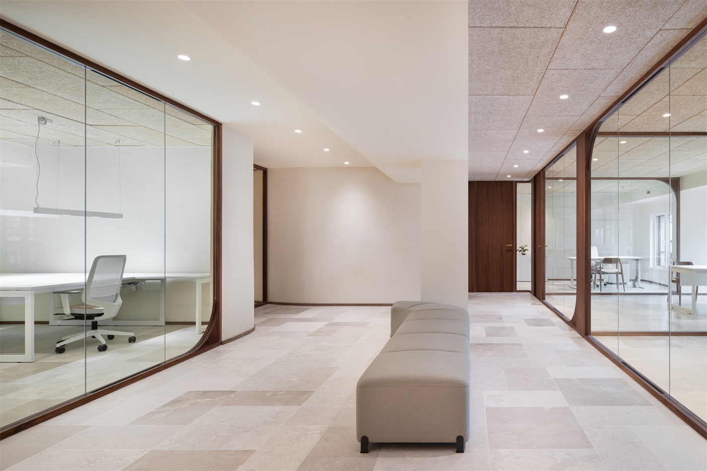 办公室以木质隔断为核心进行布局,结合建筑平面有机流畅的分布,在弱化物理边界、增添空间动感的同时,确保了功能完整性与私密性不受影响。最终呈现的空间兼具当代感、平衡性与静谧感 —— 既尊重了机构的历史记忆,又满足了当下的使用需求与舒适标准。