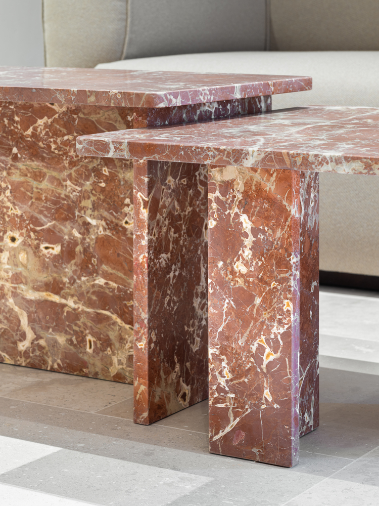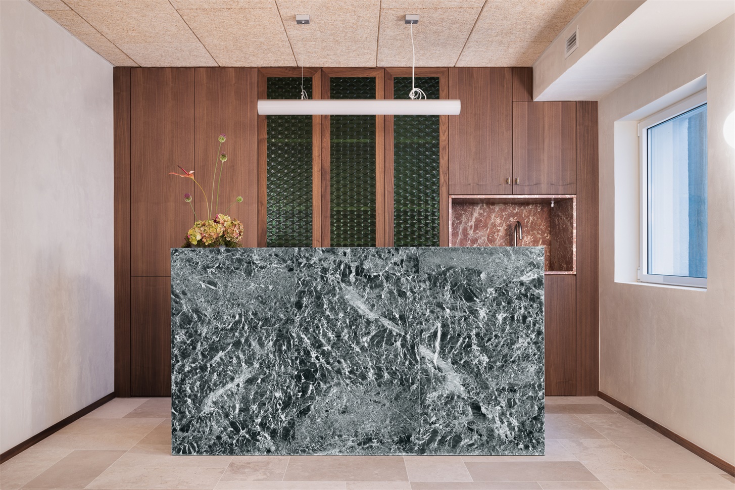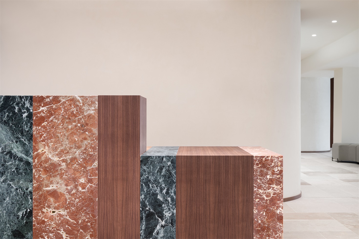 在拆除阶段,团队回收了具有浓厚象征意义的材料 —— 例如原接待台的红色与绿色大理石。这一构件最初是空间的核心连接元素,经过重新利用与创新诠释,被转化为全新的空间组件:新的入口接待台、吧台台面以及多张定制设计的桌子。其中,红色大理石被应用于机构性与私密性区域,如会议室和院长办公室;而绿色大理石则成为新吧台设计的视觉主角。