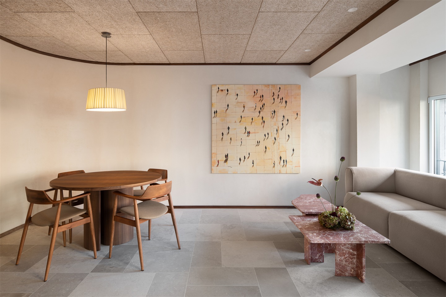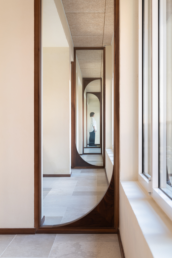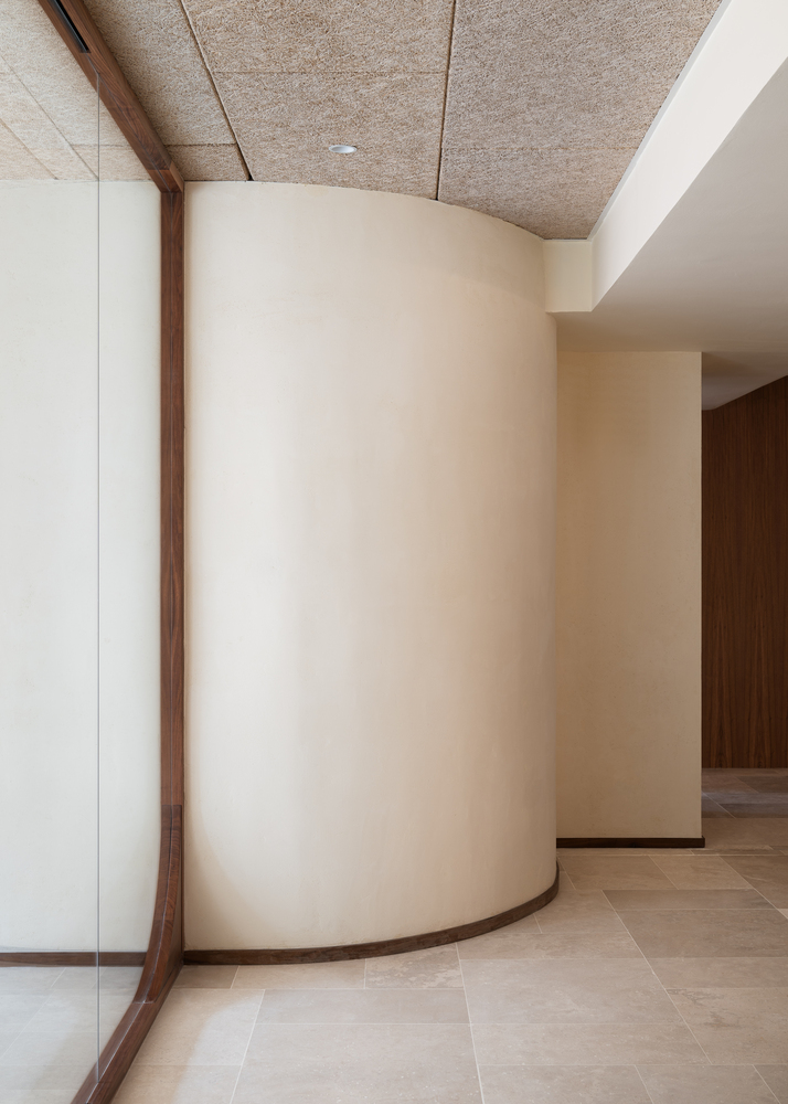 地面采用了产自当地省份的坎帕斯佩罗石材(piedra de Campaspero);墙面则以石灰砂浆饰面,这种透气材料有助于提升环境舒适度。室内木作与隔断均采用美国胡桃木设计 —— 深色木材为空间赋予独特个性与优雅质感,与整体温暖色调形成鲜明对比,其细微的圆润线条还让人联想到复古风格设计。此外,天然材料制成的吸音天花板与精心设计的照明系统,共同完善了整体设计,营造出宁静且宜人的空间氛围。