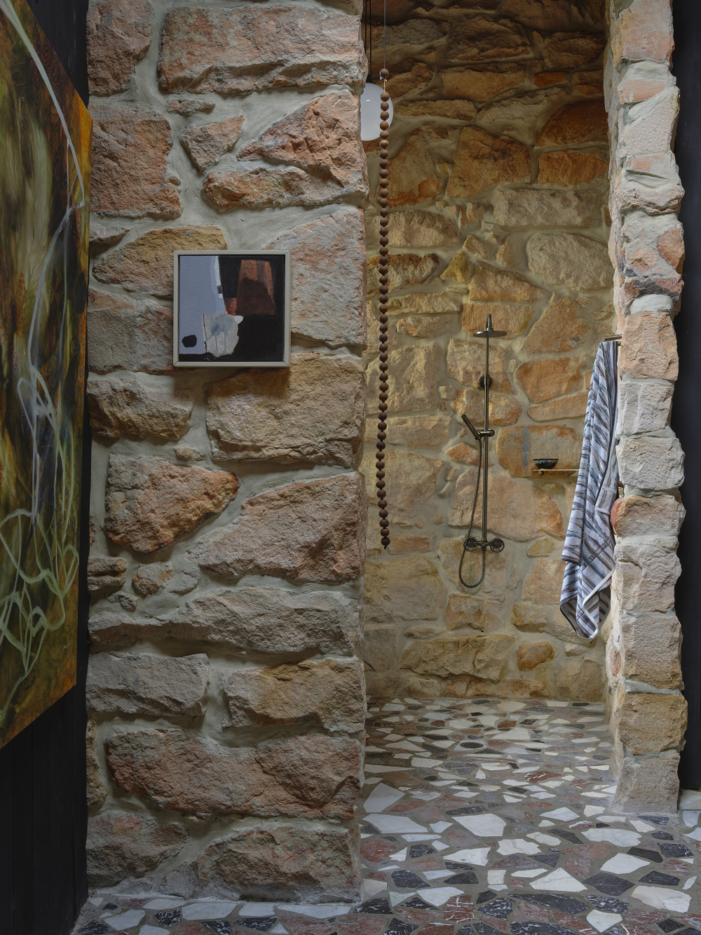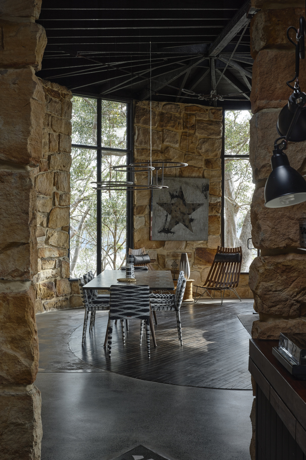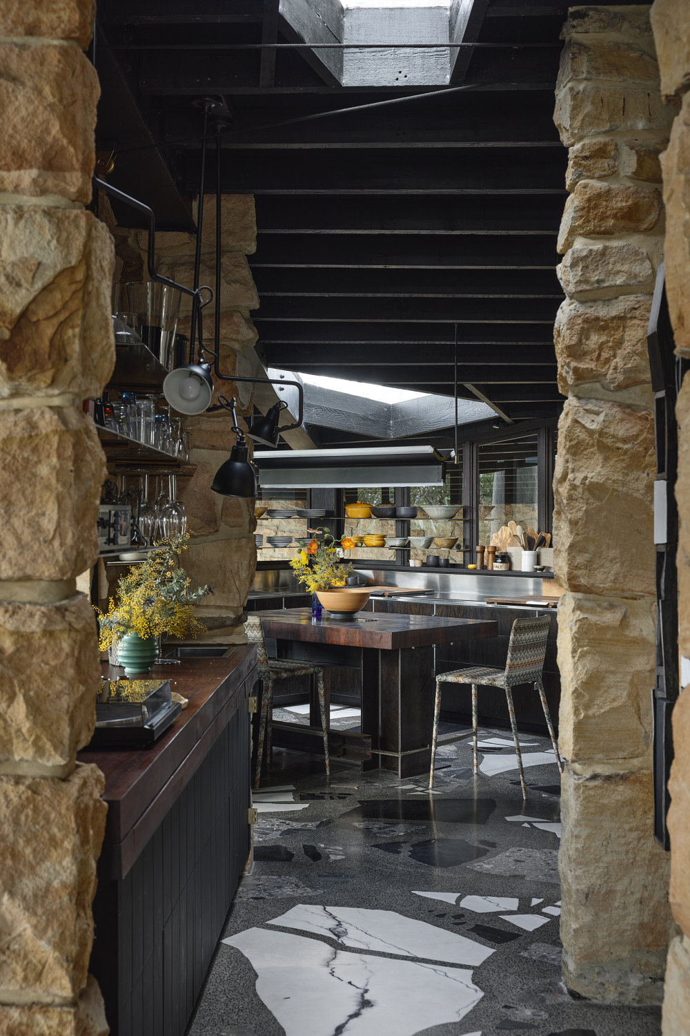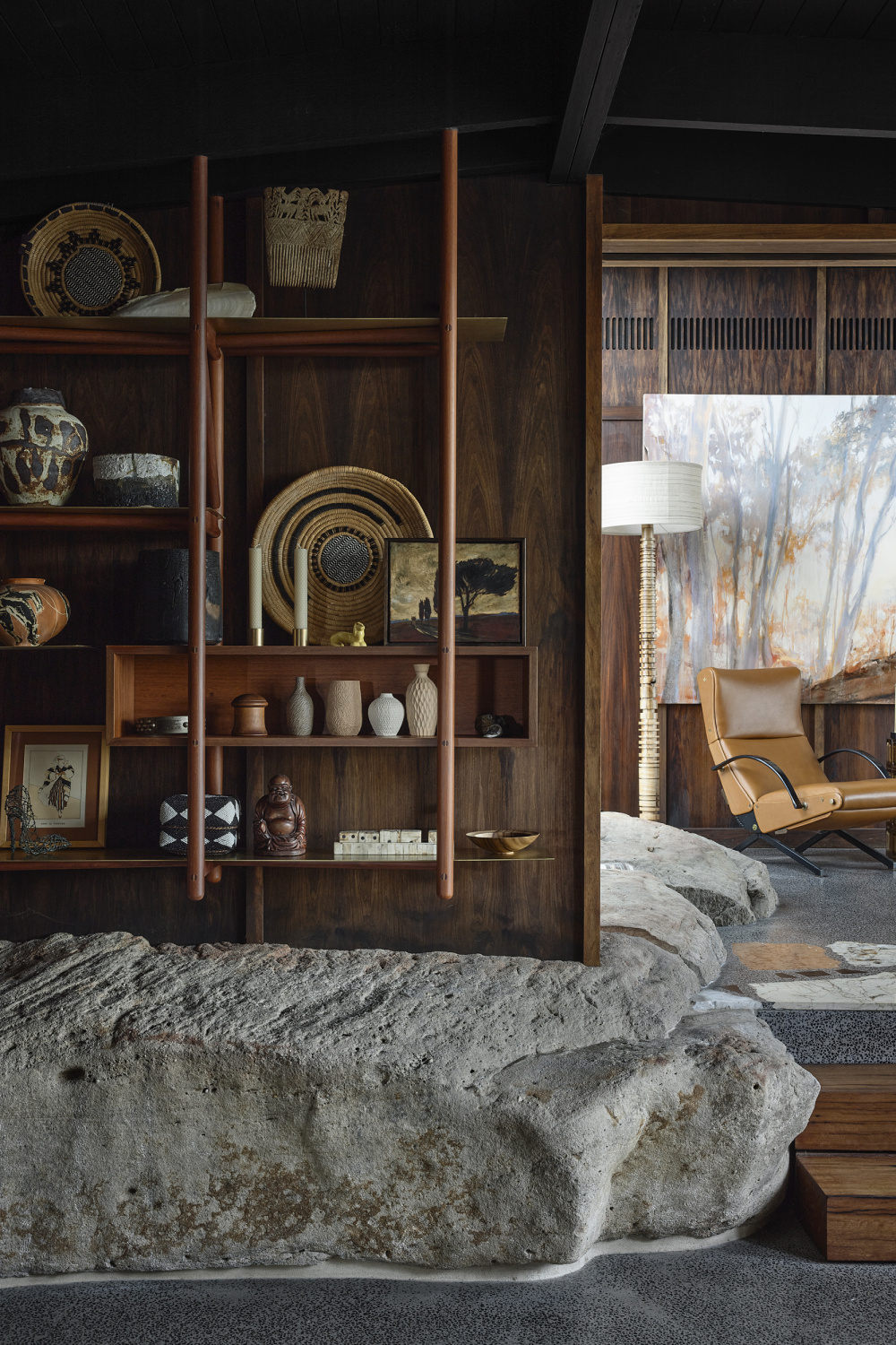 “尊重场地”是巴比伦住宅始终坚守的设计核心。原作中,建筑便与基岩无缝衔接,仿佛从山体中自然生长而出;翻新时,设计团队更是将这种与自然的共生推向极致。他们将场地原生的砂岩引入室内,化妆间的岩石分割窗成为设计的灵感起点,后续甚至围绕一块砂岩巨石建造空间,让自然以“慢动作侵入”的姿态,成为建筑不可分割的一部分。桉树环绕的布局、随四季变化的植被景观,更让住宅始终处于自然的怀抱之中。石材是贯穿住宅设计的核心主题,而斯彭斯与团队则赋予了这种坚硬材质灵动的趣味。空间中既有保留原始形态的砂岩巨石,带着自然的粗犷质感;也有浴室、厨房中精致的帕拉第奥式石材地板,展现石材的细腻一面。为了打造独特的质感,斯彭斯亲自试验,将大理石板现场敲碎,再以水磨石填充拼接,最终呈现出的地面,既带着不规则的自然韵律,又能在光线照射下折射出鲜活的光泽,让石材成为讲述空间故事的重要载体。