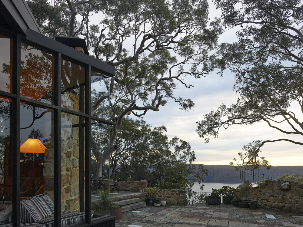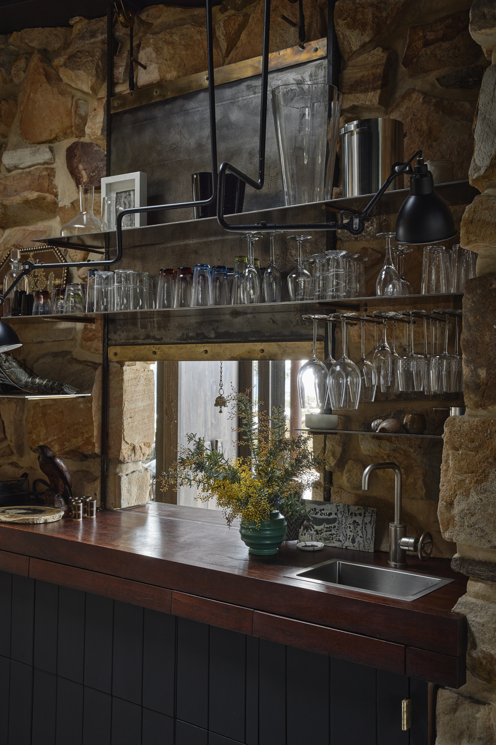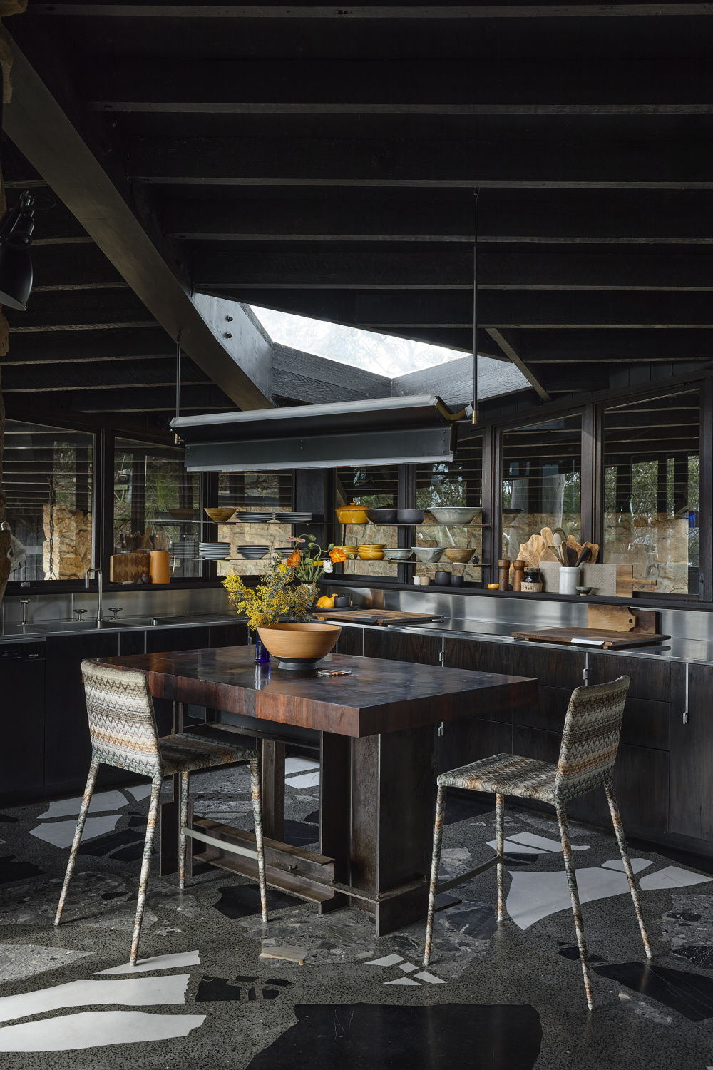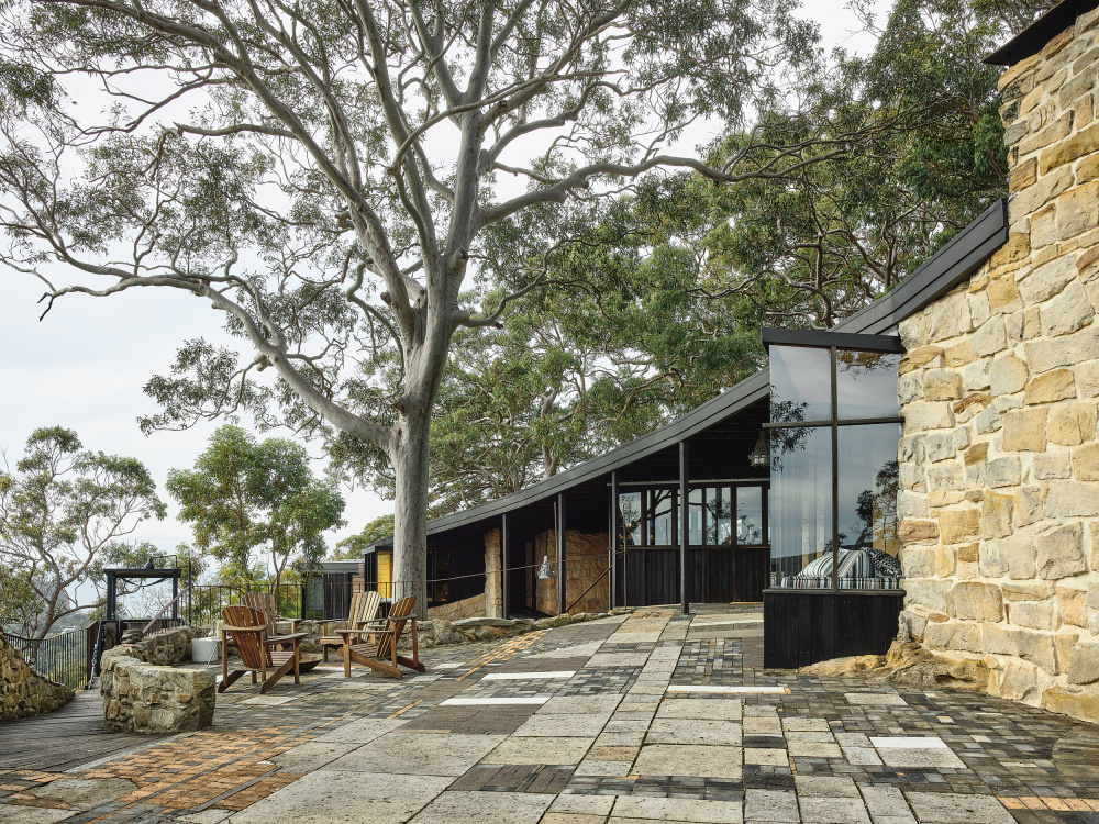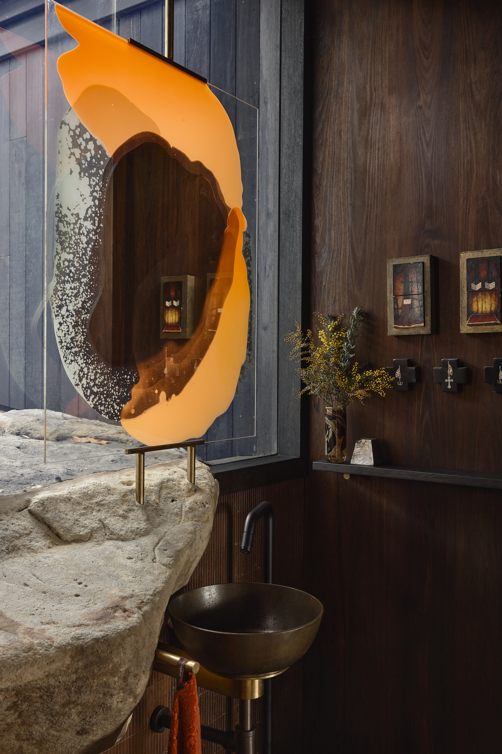 “尊重场地”是巴比伦住宅始终坚守的设计核心。原作中,建筑便与基岩无缝衔接,仿佛从山体中自然生长而出;翻新时,设计团队更是将这种与自然的共生推向极致。他们将场地原生的砂岩引入室内,化妆间的岩石分割窗成为设计的灵感起点,后续甚至围绕一块砂岩巨石建造空间,让自然以“慢动作侵入”的姿态,成为建筑不可分割的一部分。桉树环绕的布局、随四季变化的植被景观,更让住宅始终处于自然的怀抱之中。石材是贯穿住宅设计的核心主题,而斯彭斯与团队则赋予了这种坚硬材质灵动的趣味。空间中既有保留原始形态的砂岩巨石,带着自然的粗犷质感;也有浴室、厨房中精致的帕拉第奥式石材地板,展现石材的细腻一面。为了打造独特的质感,斯彭斯亲自试验,将大理石板现场敲碎,再以水磨石填充拼接,最终呈现出的地面,既带着不规则的自然韵律,又能在光线照射下折射出鲜活的光泽,让石材成为讲述空间故事的重要载体。