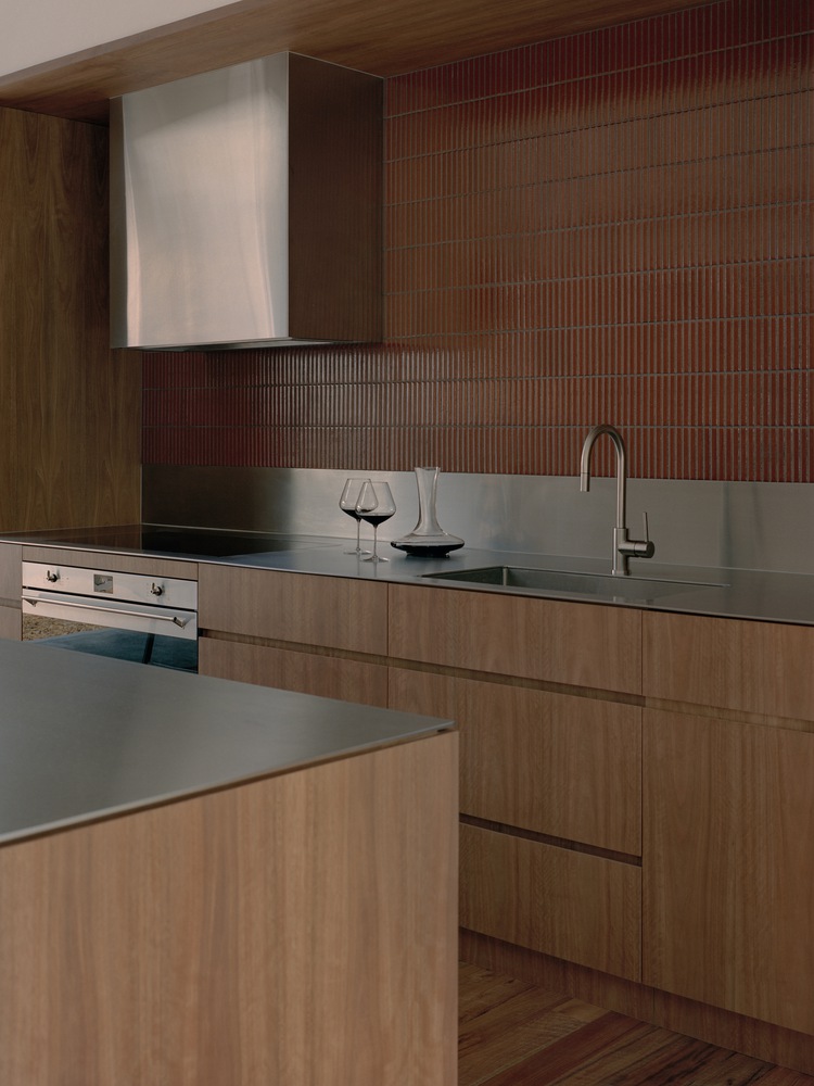 建筑外立面覆盖波纹锌铝钢板,其耐用性和捕捉海岸变幻光线的微妙特质使其成为首选。本地采购的斑桉木与直接从场地挖掘的砂岩,为空间带来温暖触感与扎根感。这些材料的选择不仅基于性能,更着眼于它们随时间流逝而风化演变的特性。