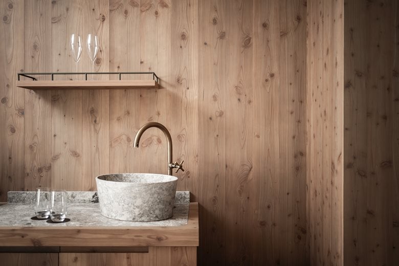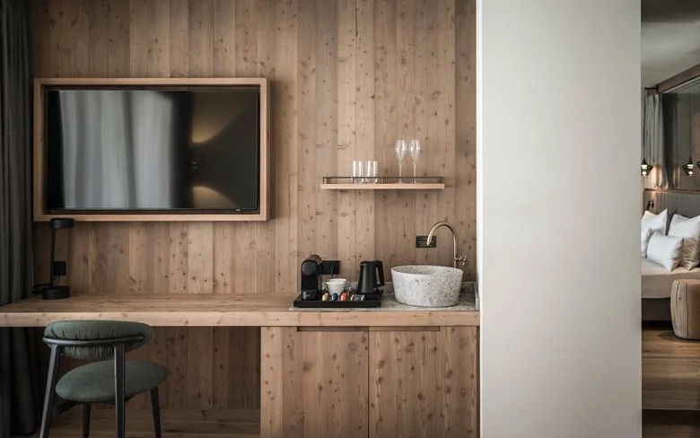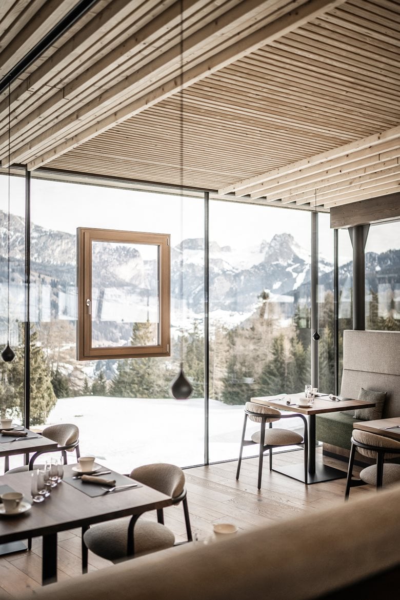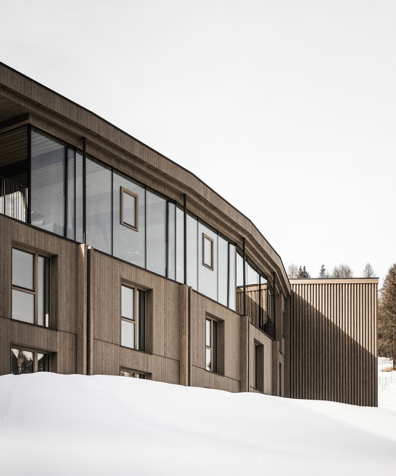 木材是核心设计元素,大面积的玻璃幕墙与简洁凝练的造型语言,共同塑造出一种兼具静谧感与优雅气质的建筑风格。新建筑通过地下通道与原有地下车库相连,内部设有 27 间光线充足的客房,其中包括一间面积超过 90 平方米的套房。开放式早餐区配有通高落地窗,客人可将阿尔卑斯山的景致尽收眼底,与自然形成紧密的视觉联结。