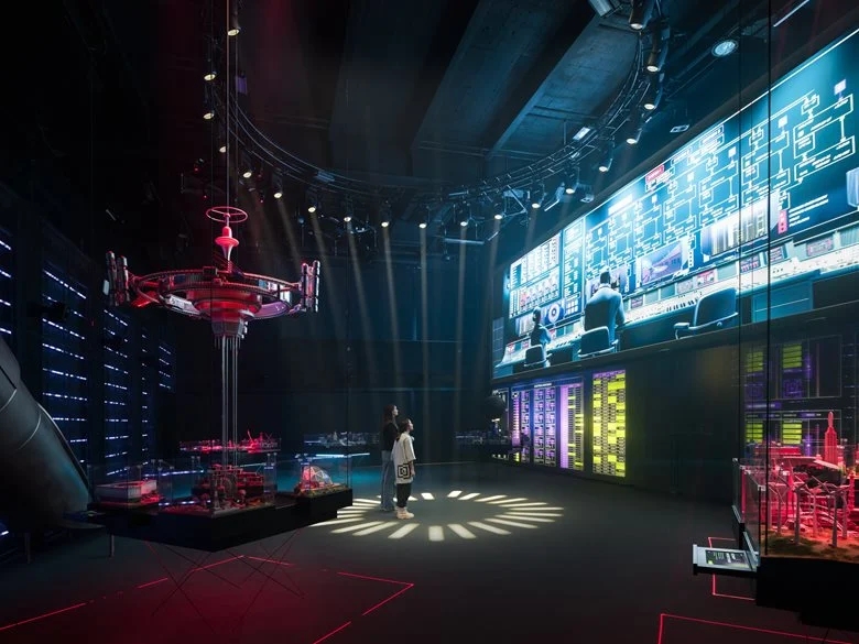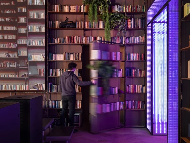 从一个世界到另一个世界的转换是双向的:在从数字空间通往模拟空间的走廊里,真实的砖砌结构变成了印在玻璃上的图像,而在休息区的图书馆里,门户就像书本中的像素屏幕一样打开。对于网络王国的年轻居民来说,从一个现实空间转换到另一个现实空间可以是一次远足和探险游戏。 你可以通过一个类似科幻电影中冷冻舱的 “宇宙电梯”“瞬移 ”到网络多边形上,也可以爬上一个秘密楼梯进入一个隐藏的隧道,然后滑到地面上。