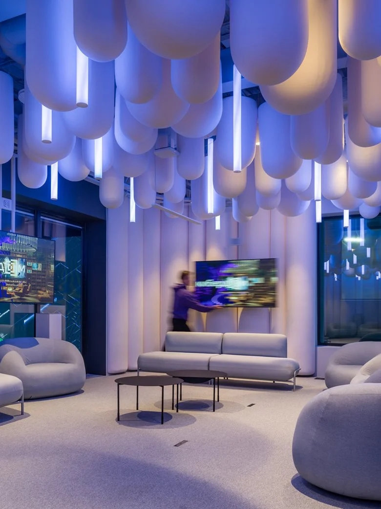 一楼有一间 “柔软 ”会议室:通过悬挂的充气圆柱体、隐藏在圆柱体之间的管状灯具、带有圆角和柔软填充物的表面来传达图像。在 “像素 ”会议室,空间像素化是通过方形面板和突出墙面的立方体装置来模拟的。所有会议室的 LED 照明系统都能以 RGBW 模式运行。 为了装备 “数字 ”会议室以及整个网络王国,客户发明了许多技术创新:微型金属探测器和人脸识别阅读器、用于在轨道天花板系统上移动已打开屏幕的独特框架、自动熄灭的会议摄像机以及许多其他专有技术。