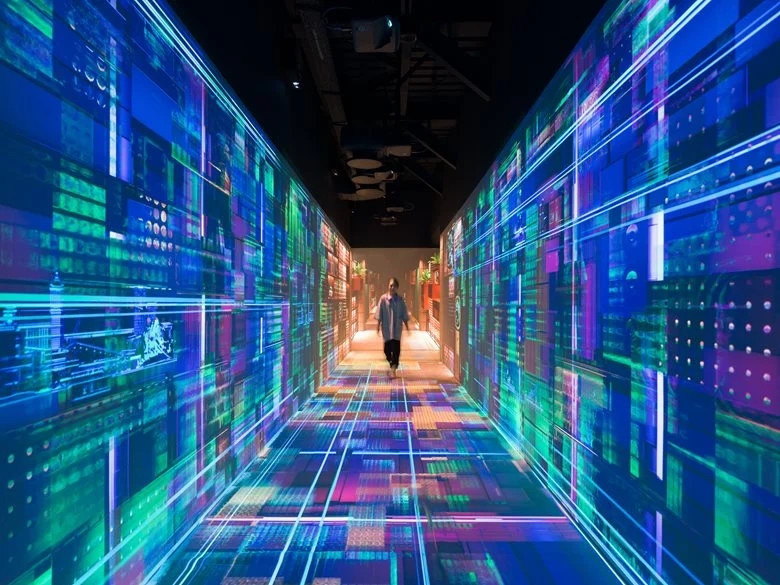VOX 建筑事务所提出,通过在网络王国的模拟部分和数字部分之间的墙壁上设置从一个世界到另一个世界的闪烁门户,来表达虚拟和物质混合的理念。巨大的光门营造出了边界消融的效果:首先,它是底层作为标志的入口,通过它可以到达网络多边形;在一楼,由无穷大镜面制成的闪烁门通向活动大厅。Sila Sveta 制作的从一楼大厅通往网络多边形的通道是对 “突变 ”效果的另一种诠释:投射在走廊墙壁上的大厅空间效果图突然开始旋转,形成一个光线漩涡,并碎裂成像素。柔软的地板表面增强了离开现实进入数字世界的感觉。