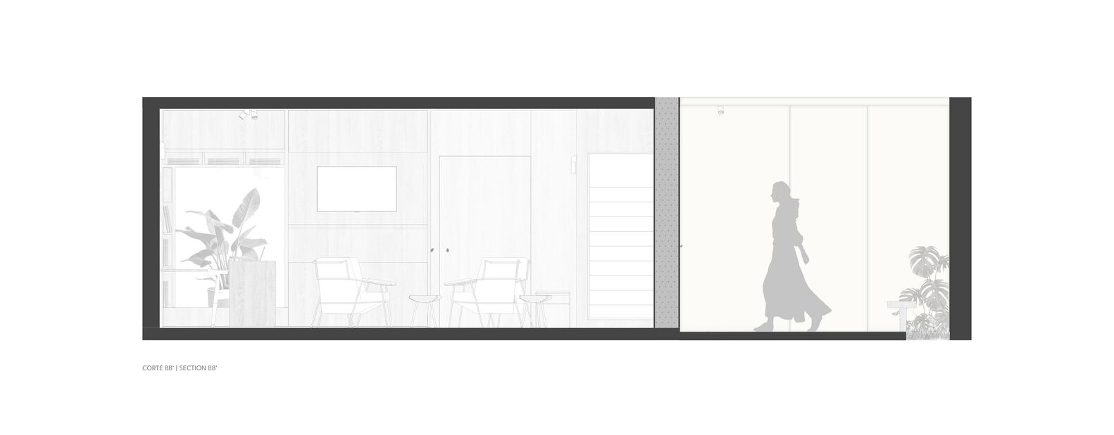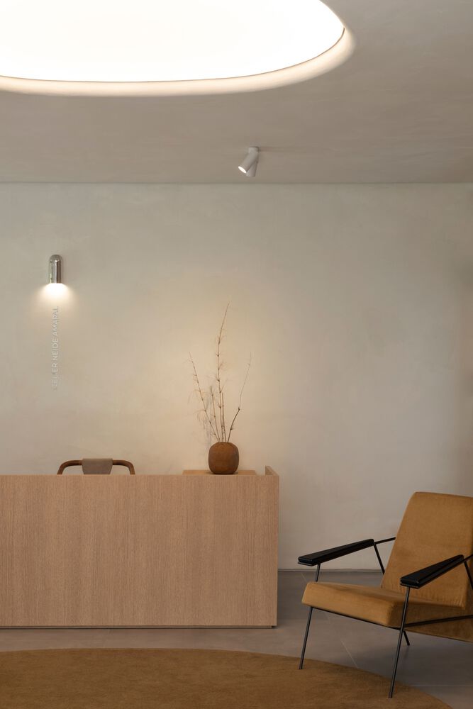 除了设有通往接待区的私人通道外,大厅还配备了服务入口,入口由与墙面同色的金属板遮蔽,确保了视觉上的连贯性。洞石长凳也是建筑设计的一部分,既起到界定景观区域的作用,又可供人等候和休憩。