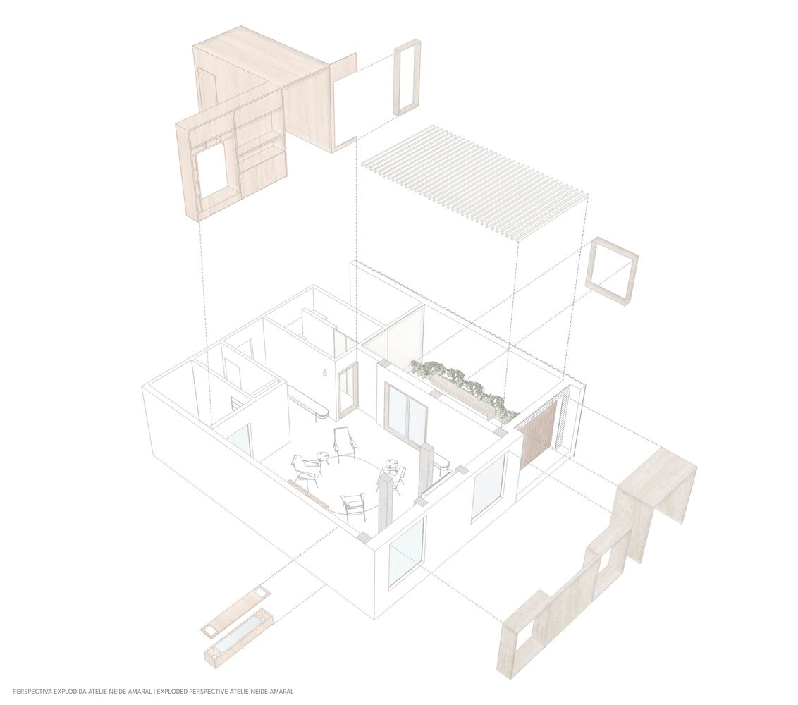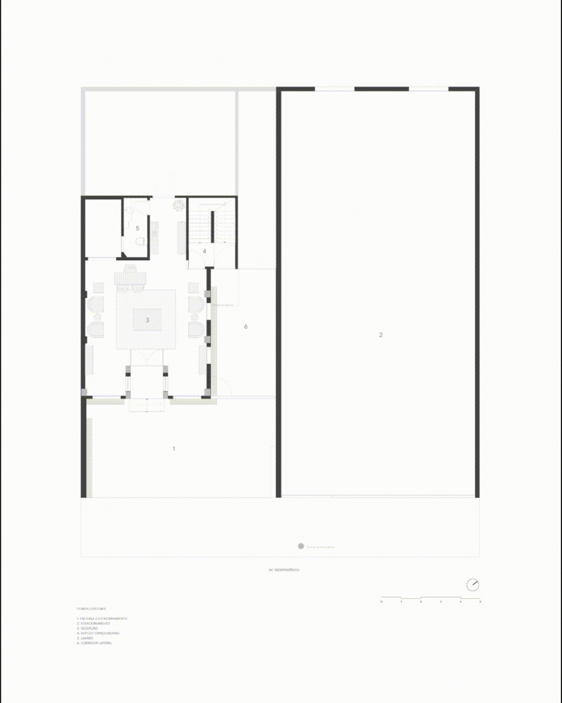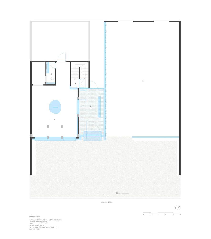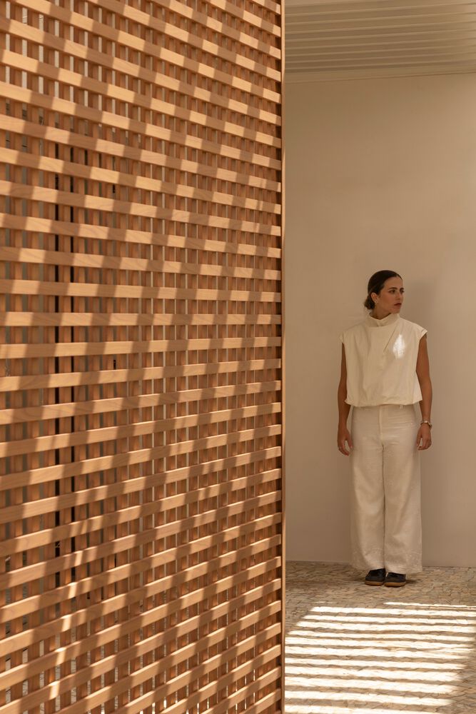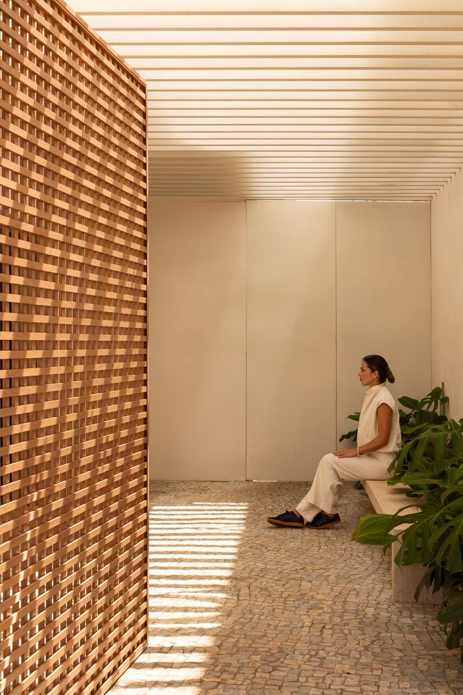 主入口被移至侧面,打破了以往的布局 —— 此前的中央入口被四根支柱所限制。新入口设在其中一个石材体量上,由一扇金属格纹旋转门构成,穿过门后,一个开阔的空间映入眼帘。 pergolas(棚架)带来的光影效果让这里充满自然光,而景观设计则与墙面纹理和洞石色调形成鲜明对比。