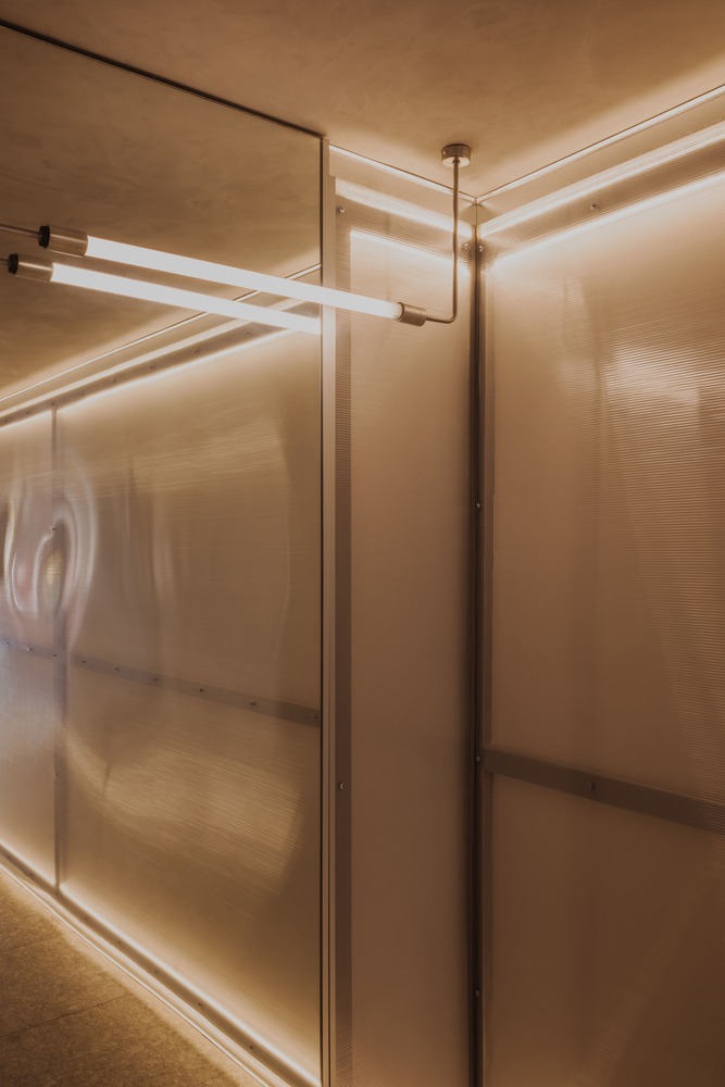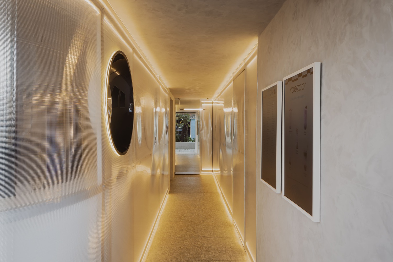 Yoozoo 的设计旨在为这家珍珠奶茶店打造独特的感官体验,其核心是采用聚碳酸酯作为主要的光线扩散材料。顾客的体验从在入口点单那一刻便已开始,并在整个空间中逐步展开。聚碳酸酯墙面本身具有半透明特性,与自然光和人工光巧妙互动:光影交错营造出动态氛围,其格调随一天中的时间流转而变化。