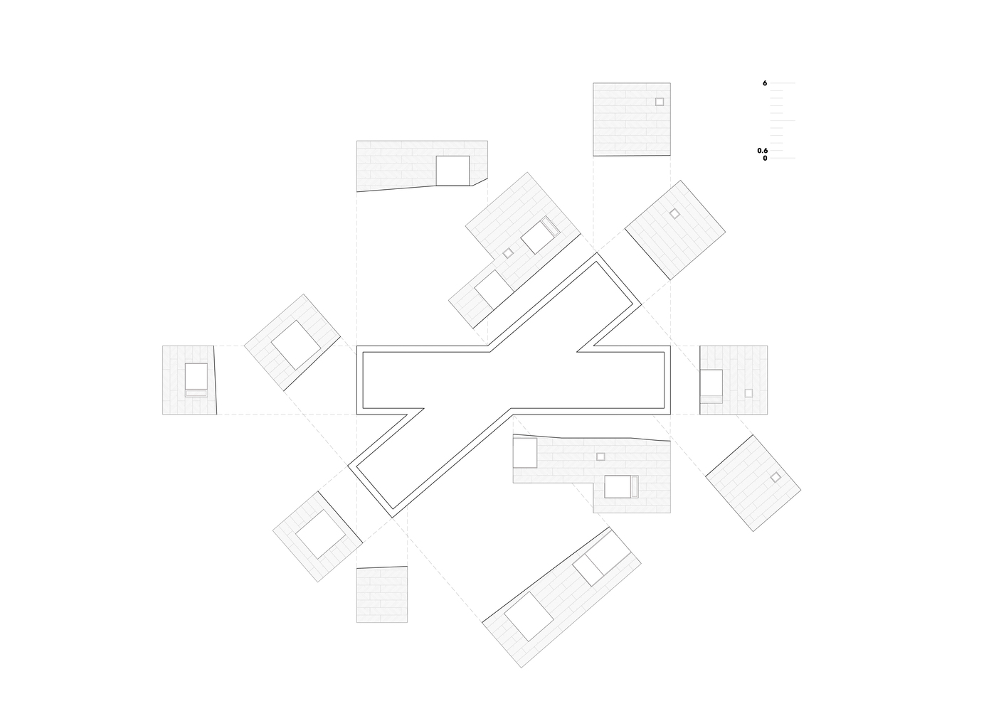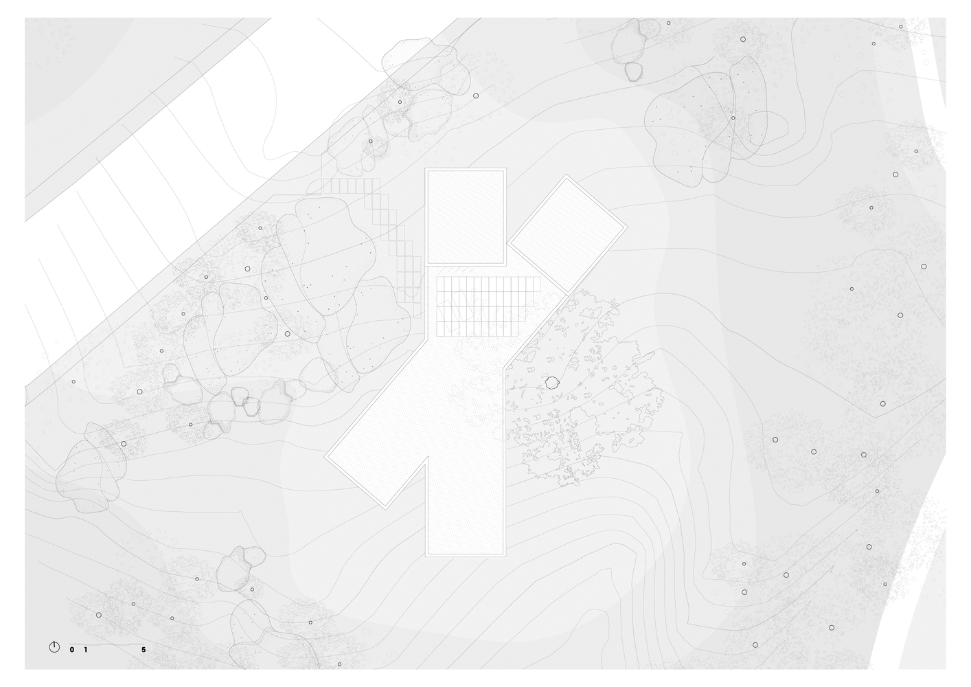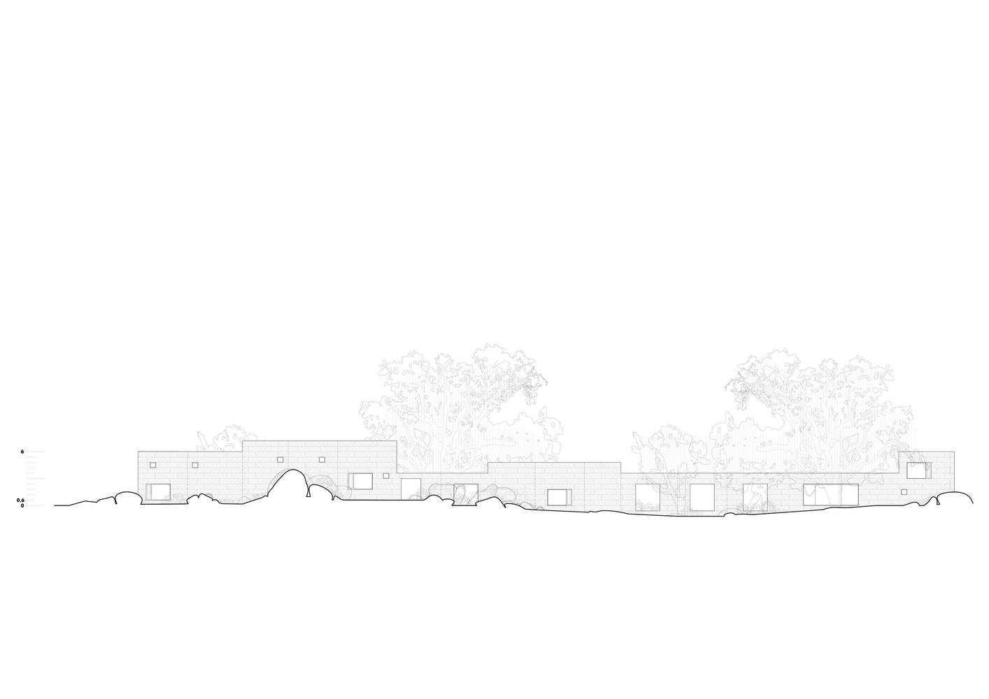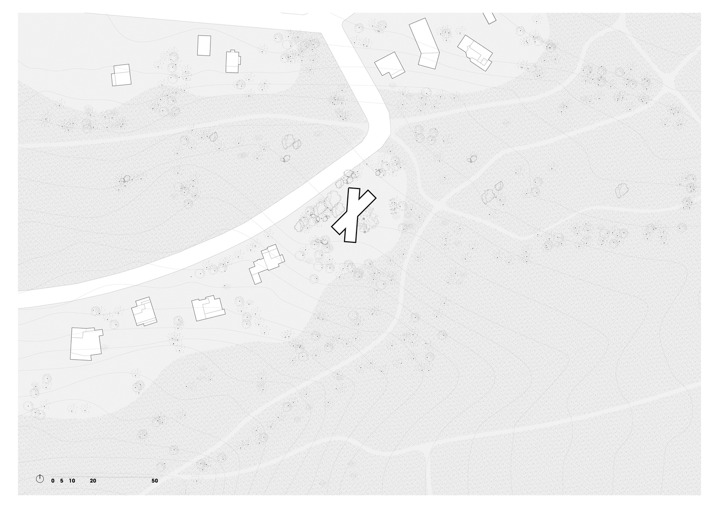 住宅坐落在岩石地形上,其特点是平缓的地形和百年橡树的壮观存在,周围是生长在大型花岗岩巨石中的霍尔姆橡树和软木橡树。在所有这些石头和植物元素中,从Coderch的Ugalde住宅中学习,房子设法找到了一个X形的布局,在崎岖的景观中容纳了项目,同时从内部构建了这些特征的视野。