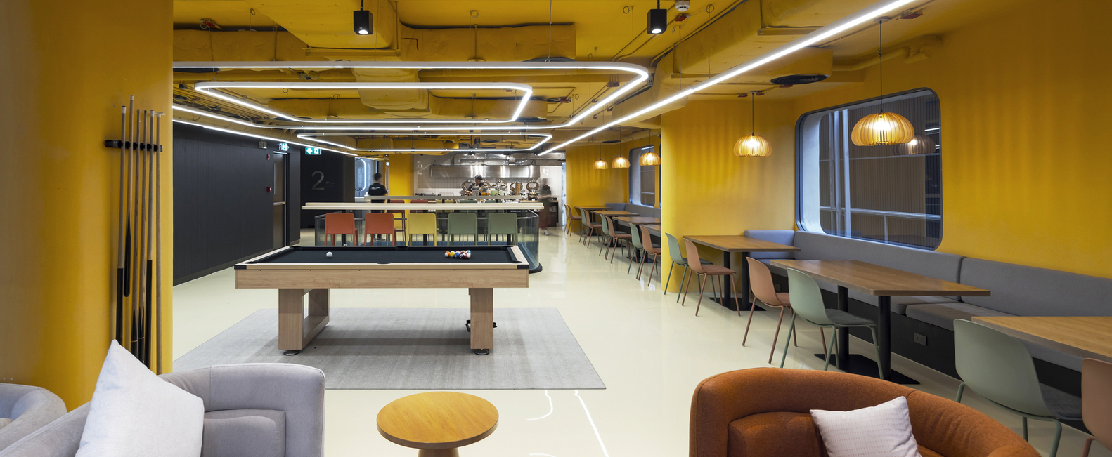 在主大堂,一个橙色调的贝壳形接待台在深绿色背景的衬托下格外醒目,从宾客抵达的那一刻起就营造出热情洋溢、活力四射的氛围。高挑的天花板拓展了空间感,让人能够看到二楼部分公共区域,该区域以黄黑两色装饰。这个多功能空间兼顾工作、用餐和休闲功能,进一步强化了酒店的社交氛围。
