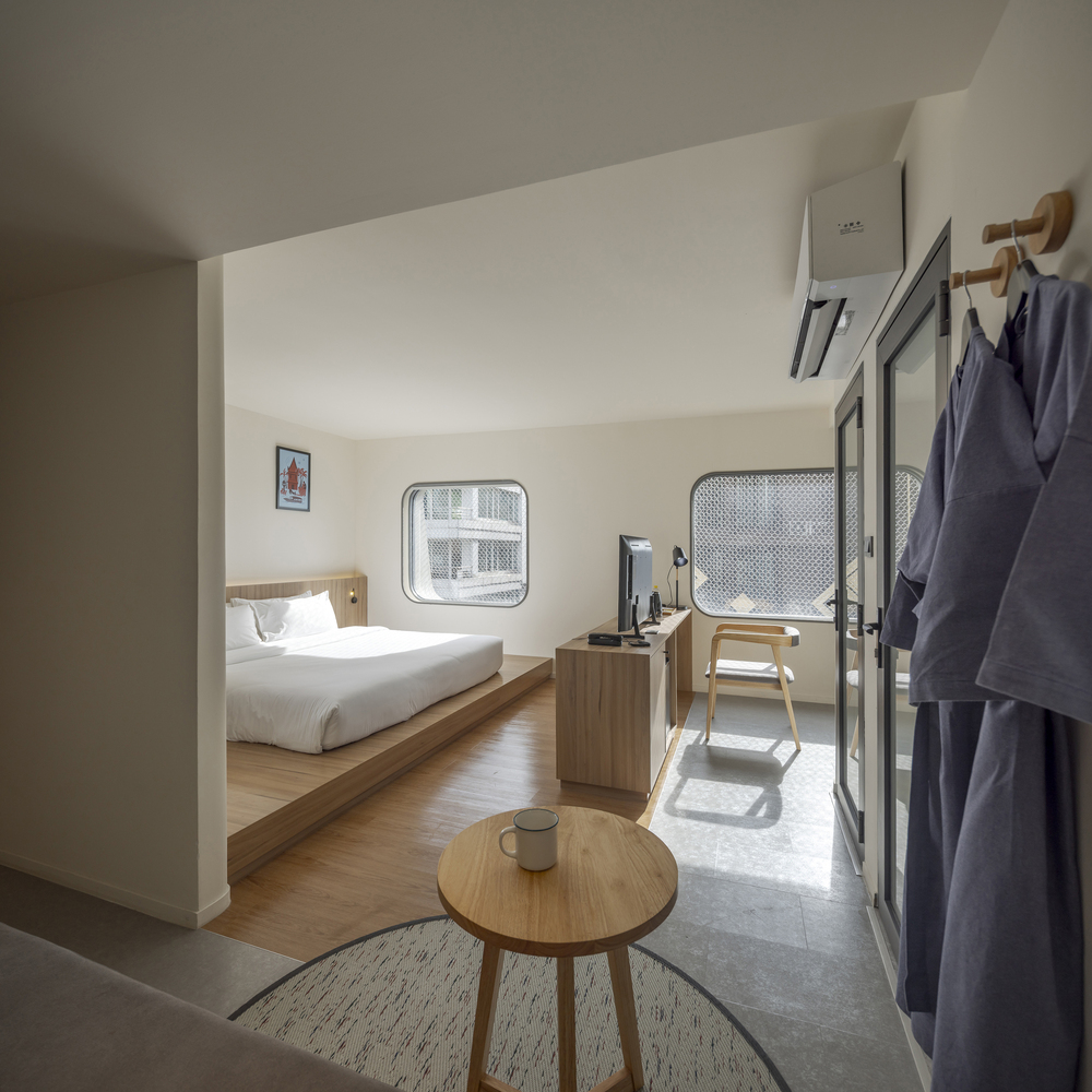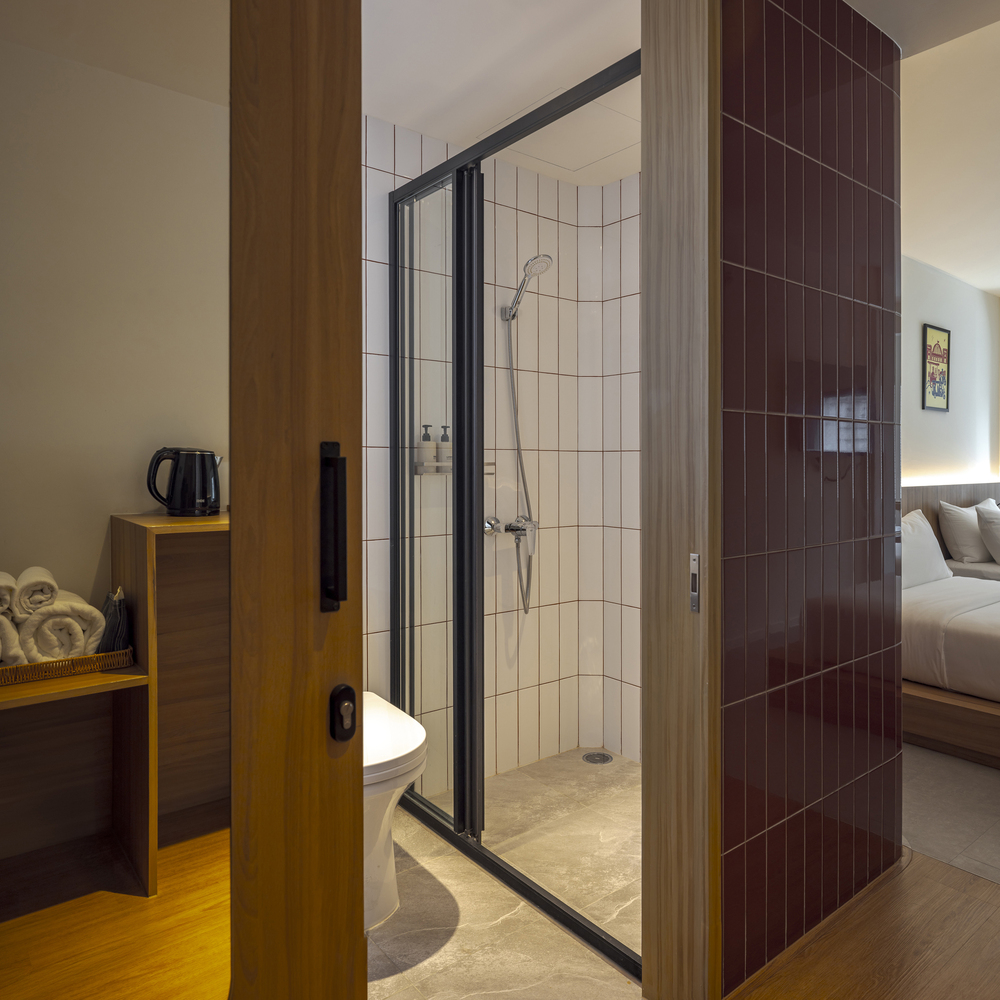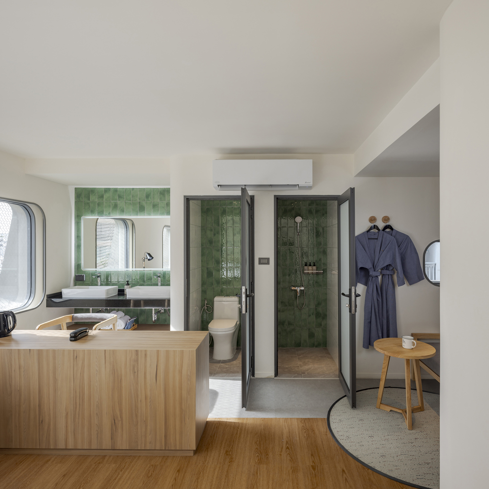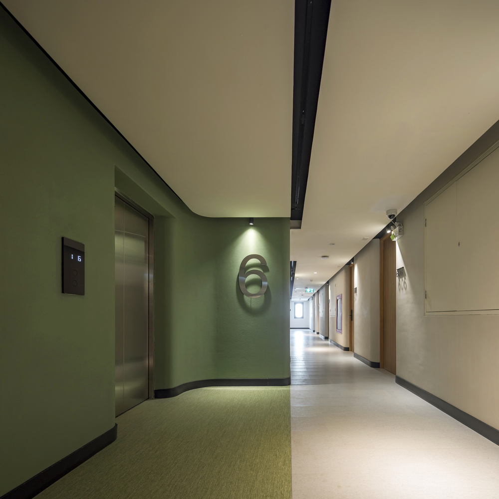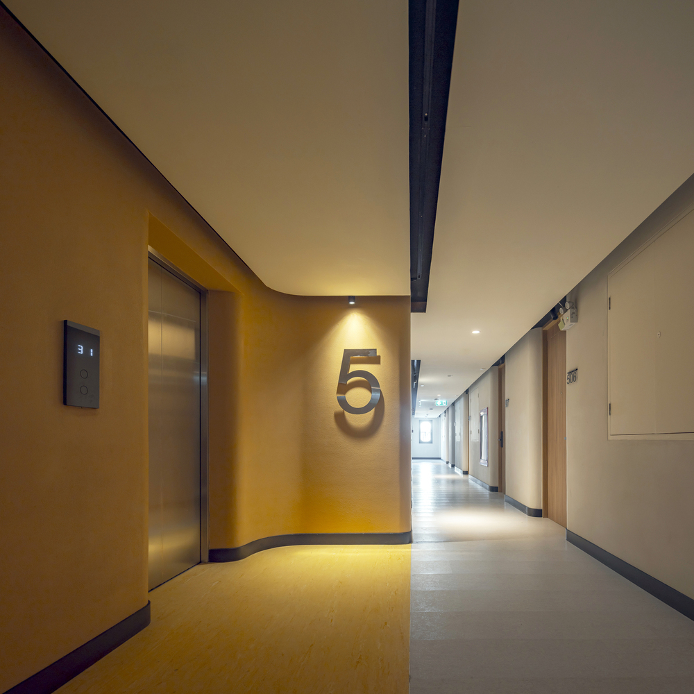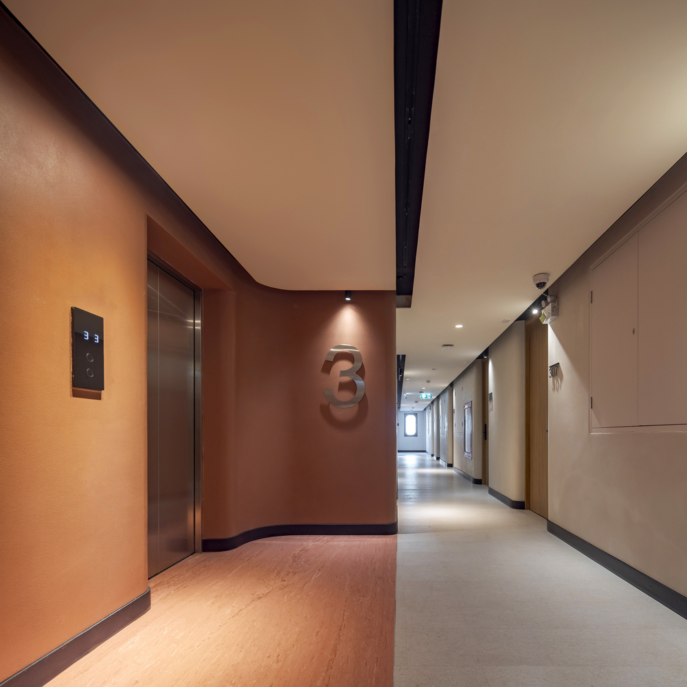 每一层都延续了这种充满活力的主题,电梯厅采用不同的颜色,以此标识楼层编号。当宾客走向客房时,鲜艳的色彩逐渐过渡为更为柔和的色调,营造出宁静舒适、适合休息的环境。即便在这些安静的空间里,也不乏有趣的设计元素 —— 比如浴室的外墙采用彩色瓷砖铺设,为空间增添了一丝趣味性。