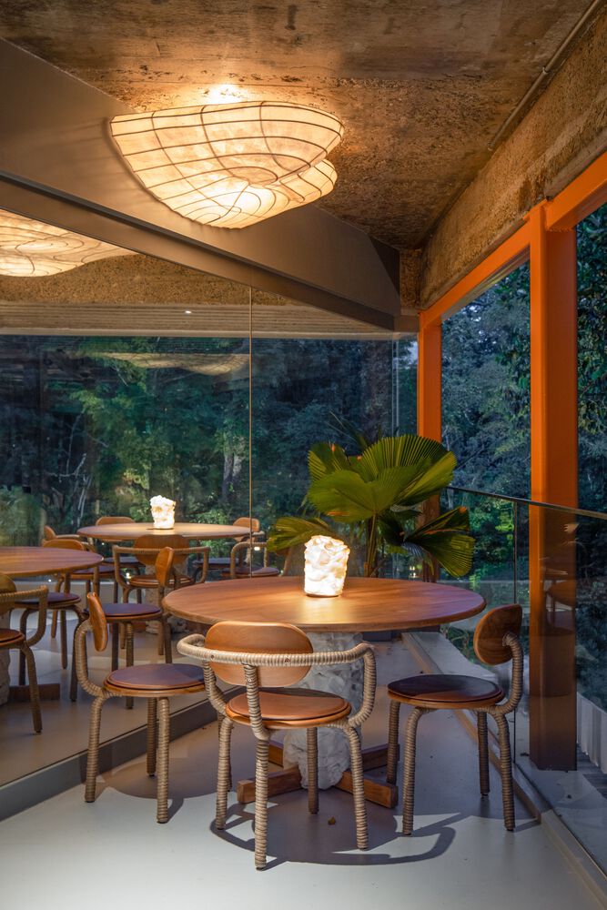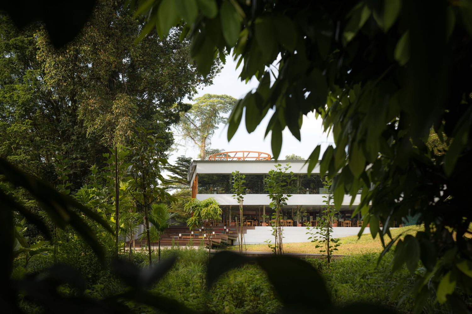 该会所是一栋具有现代主义风格的两层建筑,以带状窗户为特色。在一层,步道延伸至室内,界定出流通空间。主用餐区面朝草坪。借助可开启的正面立面,原本封闭的一层变成了半户外用餐空间,延伸出的露台与草坪相连,营造出轻松的用餐氛围。会所后部是开放式厨房,在这里,菜肴的制作过程对所有人都是透明可见的。二层用玻璃替代了原有的立面,打造出一个可俯瞰草坪的室内区域。访客在这里能找到一个更为私密的用餐区,以及用于食材实验(有时是一些出人意料的实验)的研究空间。该楼层后部的烹饪学校,让所有访客都能交流烹饪技巧以及有关花园食材的知识。