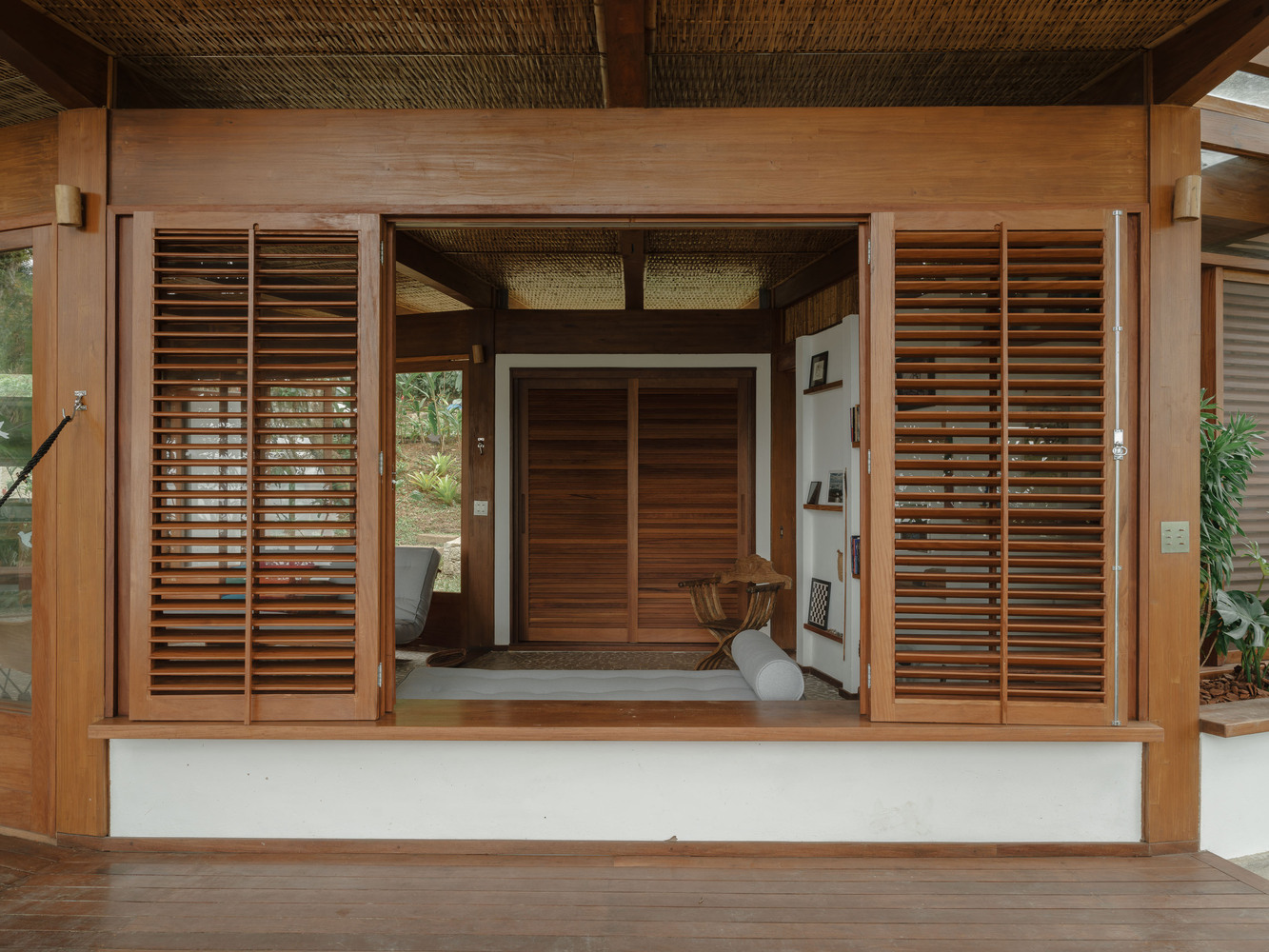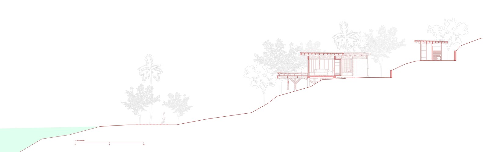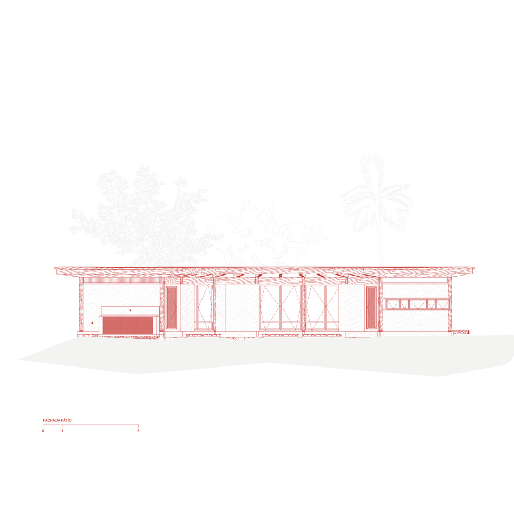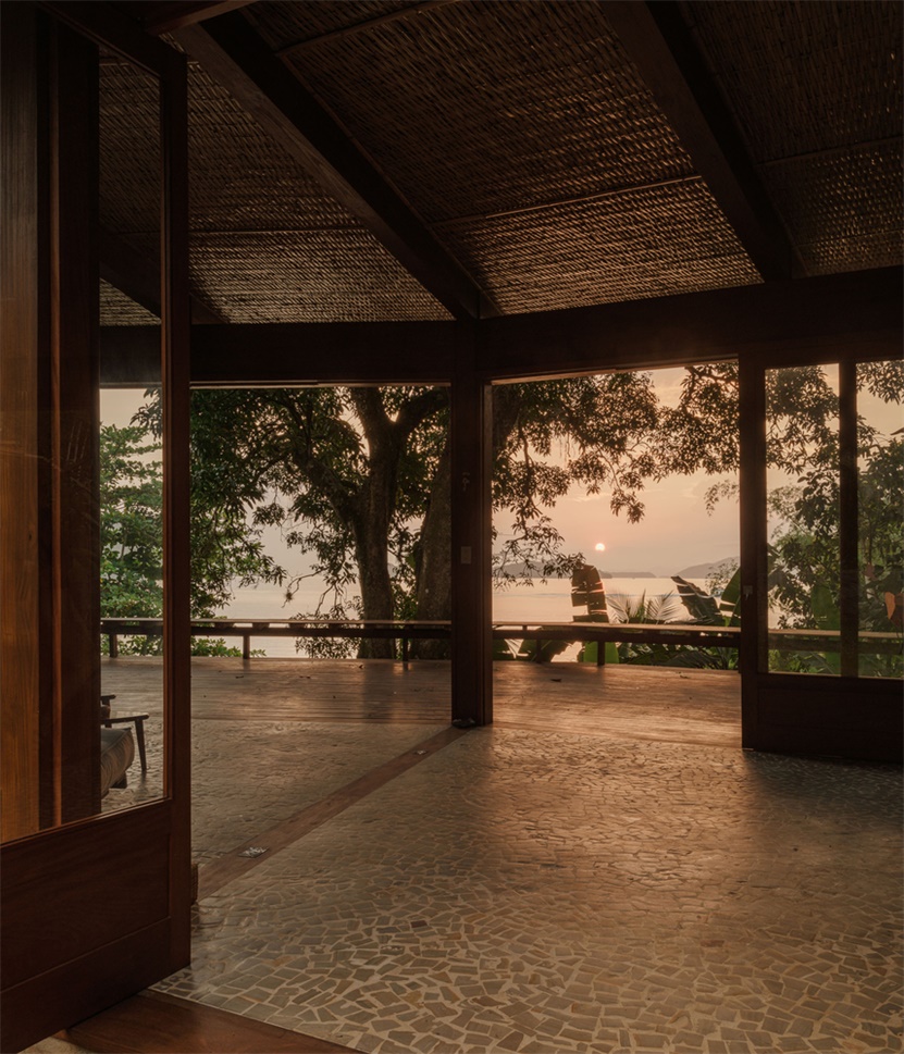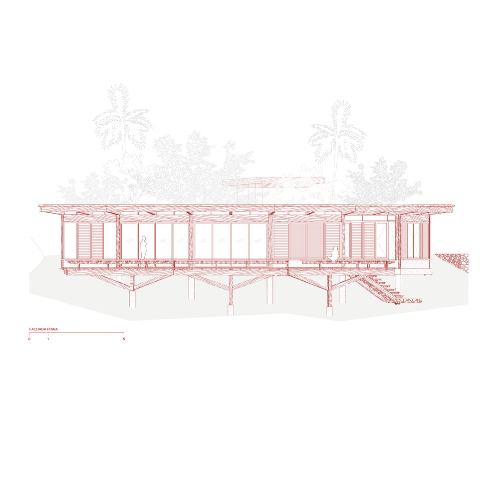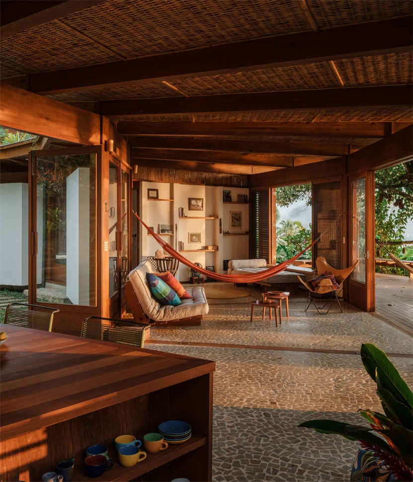 选择胶合层压木材(MLC)作为主要建筑材料,是菲盖拉之家实现自然共生的关键决策。这种高性能工程材料由多层木材粘合而成,兼具出色的机械强度、尺寸稳定性与形态灵活性,完美适配建筑的弧形形态与大跨度无柱空间需求,同时赋予建筑轻盈通透的质感,使其与茂密的雨林景观和谐共存。材料的可持续性与场地理念高度契合:胶合层压木材源自可再生资源,生产过程环境影响小,且能有效固定碳元素,践行了环保栖居的理念。住宅整体结构采用松木胶合层压木材打造,表面施以巴西铁木色着色剂,让人工建筑元素与周边雨林的深绿、海滩的沙色形成自然对话。配套材料的选择同样呼应自然主题:靠山侧的花岗岩挡土墙、葡萄牙石铺就的地面,传递出大地的厚重感;编织竹制天花板则增添了自然的肌理与暖意,让材料之间形成 “木、石、竹” 的自然交响。