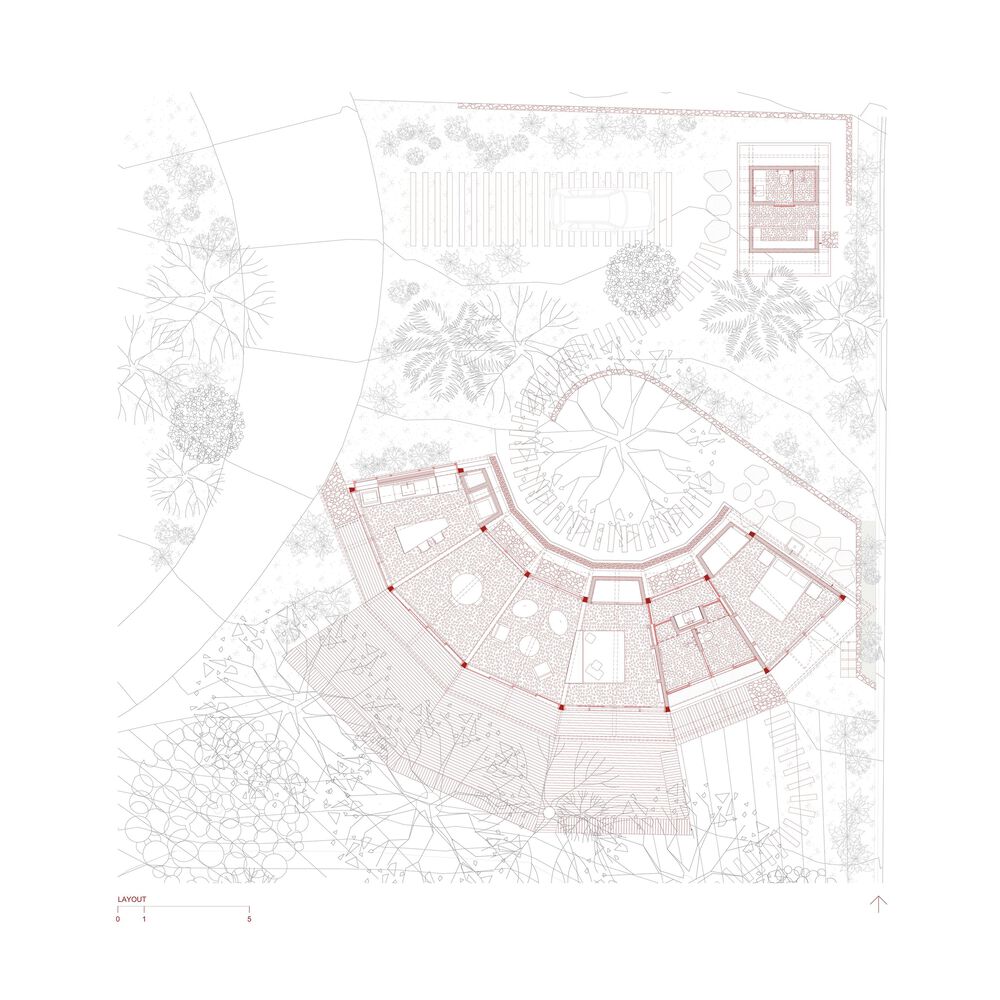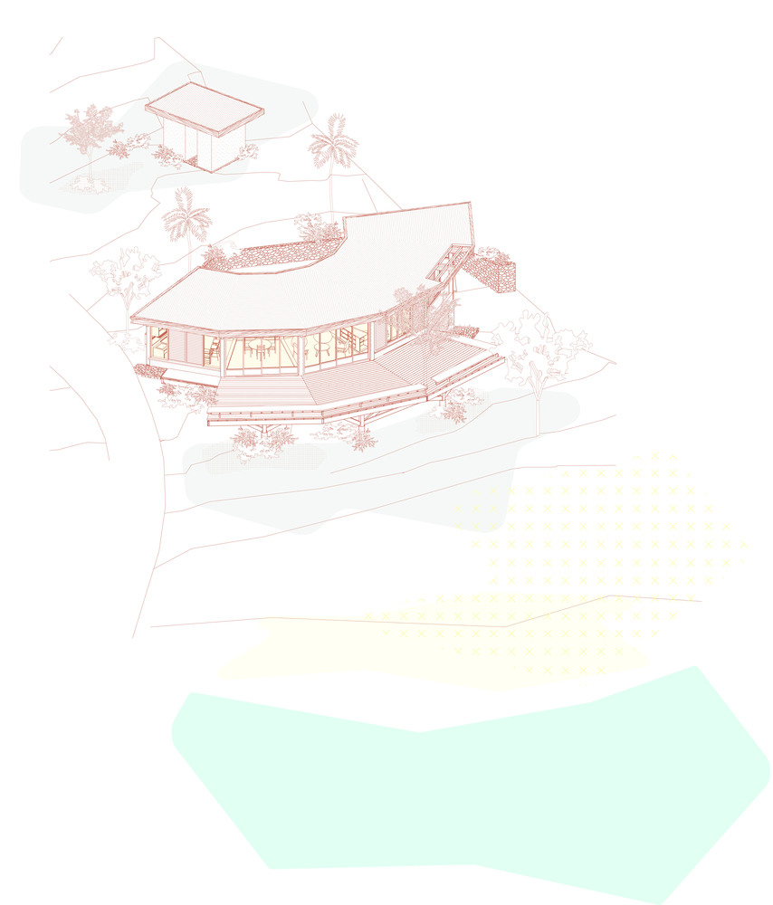 设计的核心突破,始于对场地自然条件的尊重与利用。针对地形坡度较大的特点,菲盖拉之家采用 “双平台 + 弧形延伸” 的策略,让建筑自然嵌入场地肌理。两个大型平台 / 露台顺应坡度分层排布,木质枕木划定的步道沿着建筑弧形形态蜿蜒延伸,既优化了地形利用,又让行走动线成为一场与自然的互动之旅。半圆形的建筑布局是设计的点睛之笔,其核心意图在于同时捕捉日落美景与经由吉波亚岛远眺的开阔海景。功能区沿弧形有序排布,面向一座宽阔的木质平台,平台环绕场地内现存的树木,背景则是宽敞的圆形庭院 —— 这种设计既避免了对原生植被的破坏,又让树木成为空间的天然景观,让居住者在室内外都能感受到雨林的环抱。“追踪太阳轨迹” 的理念贯穿其中,弧形布局让不同功能区在一天中获得均衡的采光,既满足生活需求,又让光影成为空间的动态装饰。