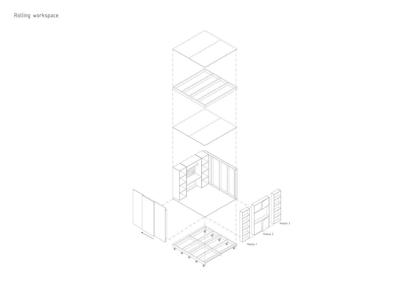 两个大型可移动木箱包含了私人空间:一个带衣柜和梳妆台的主卧室,以及一个兼具电视室功能(内有嵌入式沙发床)的工作室。这些木箱在建筑体量内移动,可形成不同的空间布局:打开用于聚会,关闭保障隐私,还能根据光线、气候或心情重新布置。