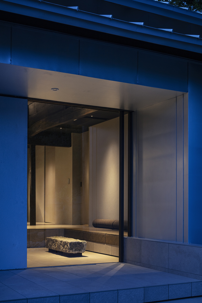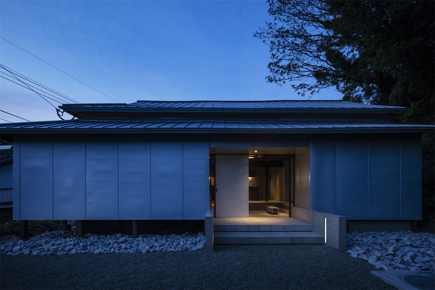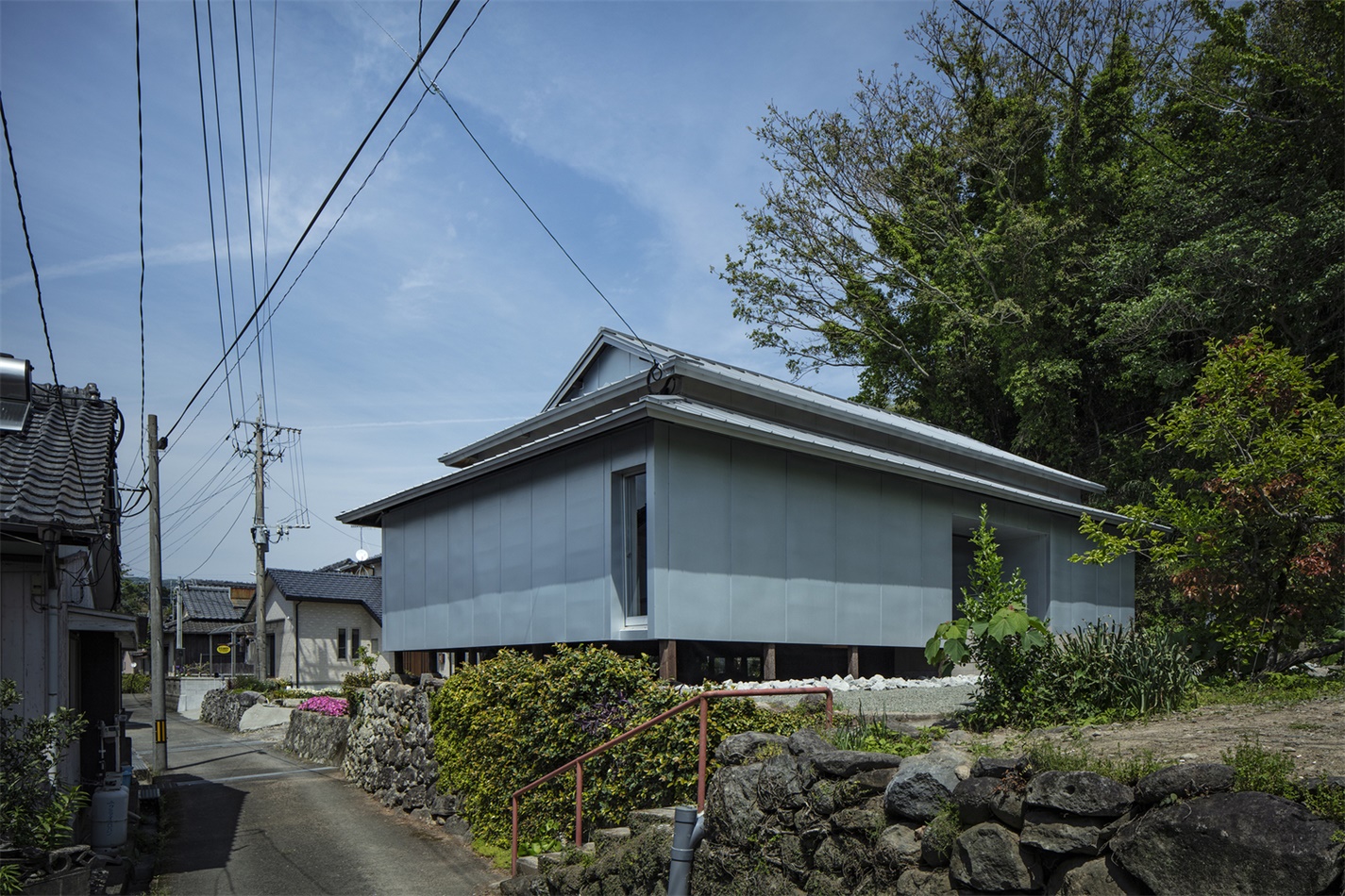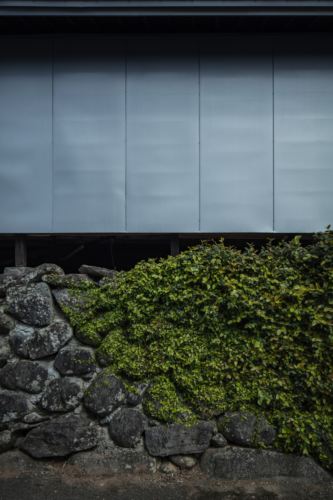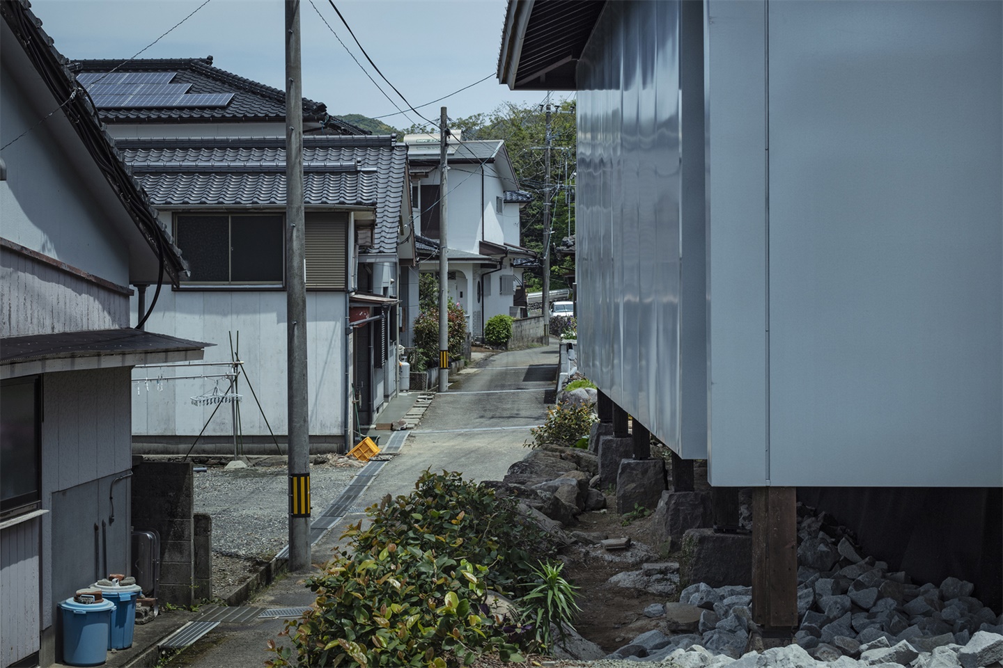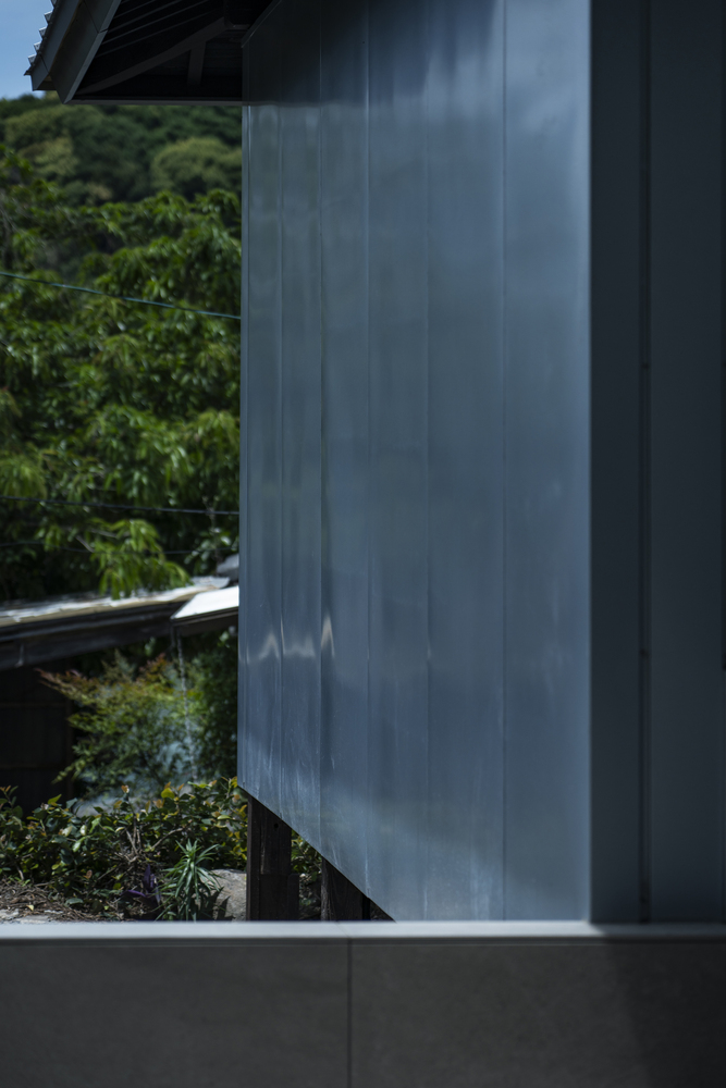 在阿久根渔港堆叠的坚固的银色钢箱给我们留下了深刻的印象。受这些钢箱以及附近海域盛产的青花鱼、沙丁鱼等蓝色鱼类的启发,我们设想用银色钢板包裹这座古老的房子。这个大胆的建筑设计不仅能保护建筑免受沿海恶劣气候的影响,还象征着保护与变革之间的对话,将旧与新融合在一起。