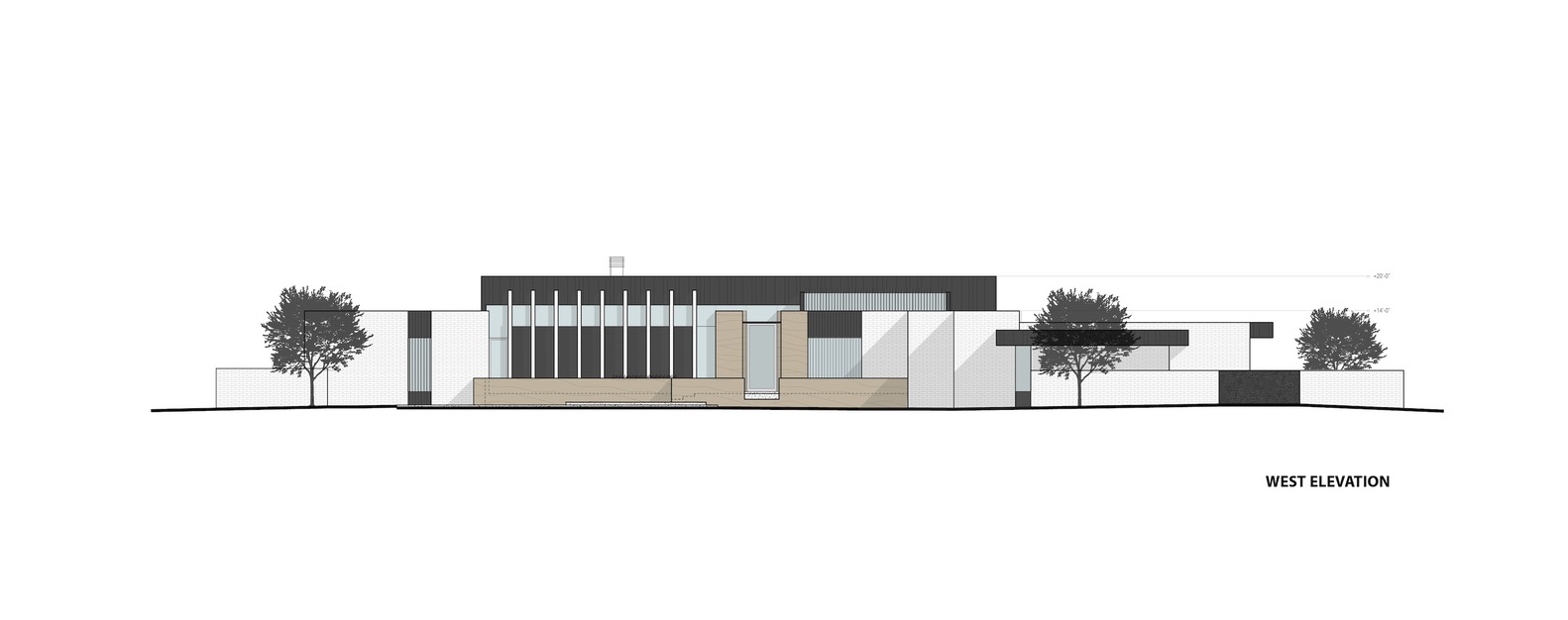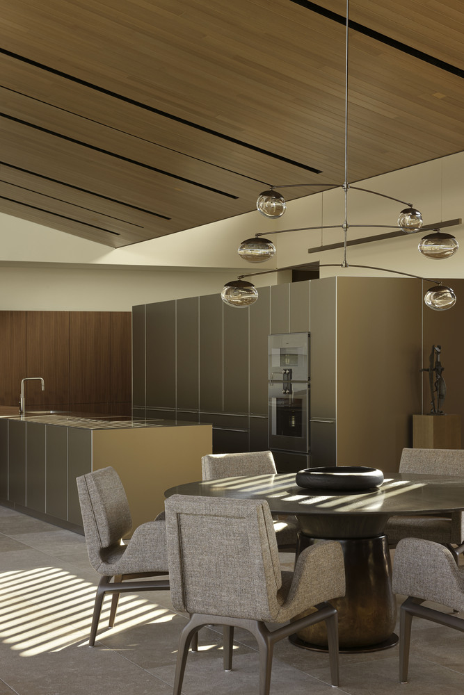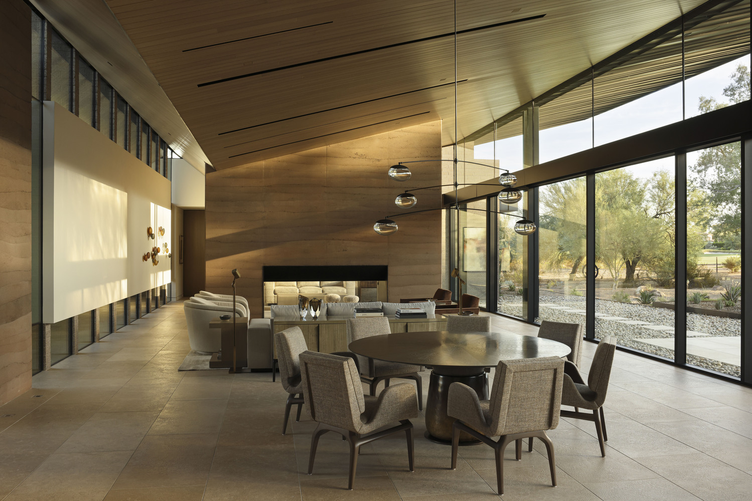 分层土筑成的矮墙引导人们走向前门入口,一座断裂式夯土塔在前门处形成了一个外部门厅,营造出强大而亲切的氛围。有机图案的金属遮阳板在这些墙上投射出有趣的光影,而垂直的格栅则遮挡着室内空间。走进屋内,带肋的金属饰板过渡为温暖的木材,其线条将人们的目光引向外部环境。源自大地的精致材料在室内延续,天然石材地板、夯土装饰墙,以及部分房间内的毛面砌块墙面,尽显自然质感。