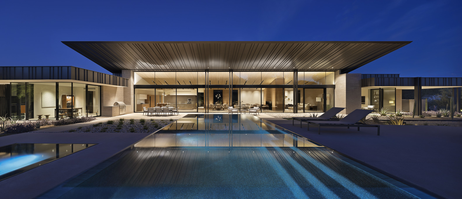 郁郁葱葱的沙漠花园向室内延伸,几乎无框的玻璃墙模糊了边界,拉近了花园与室内的距离。透过多样的节水植物,可以瞥见远处的高尔夫球场,这些植物将远处的山景衬托得更加自然。狭窄的泳池倒映着亚利桑那州湛蓝的天空,同时水流从纹理墙上倾泻而下,构成了一幅声与景的和谐画卷,为户外起居区域营造出凉爽的微气候。