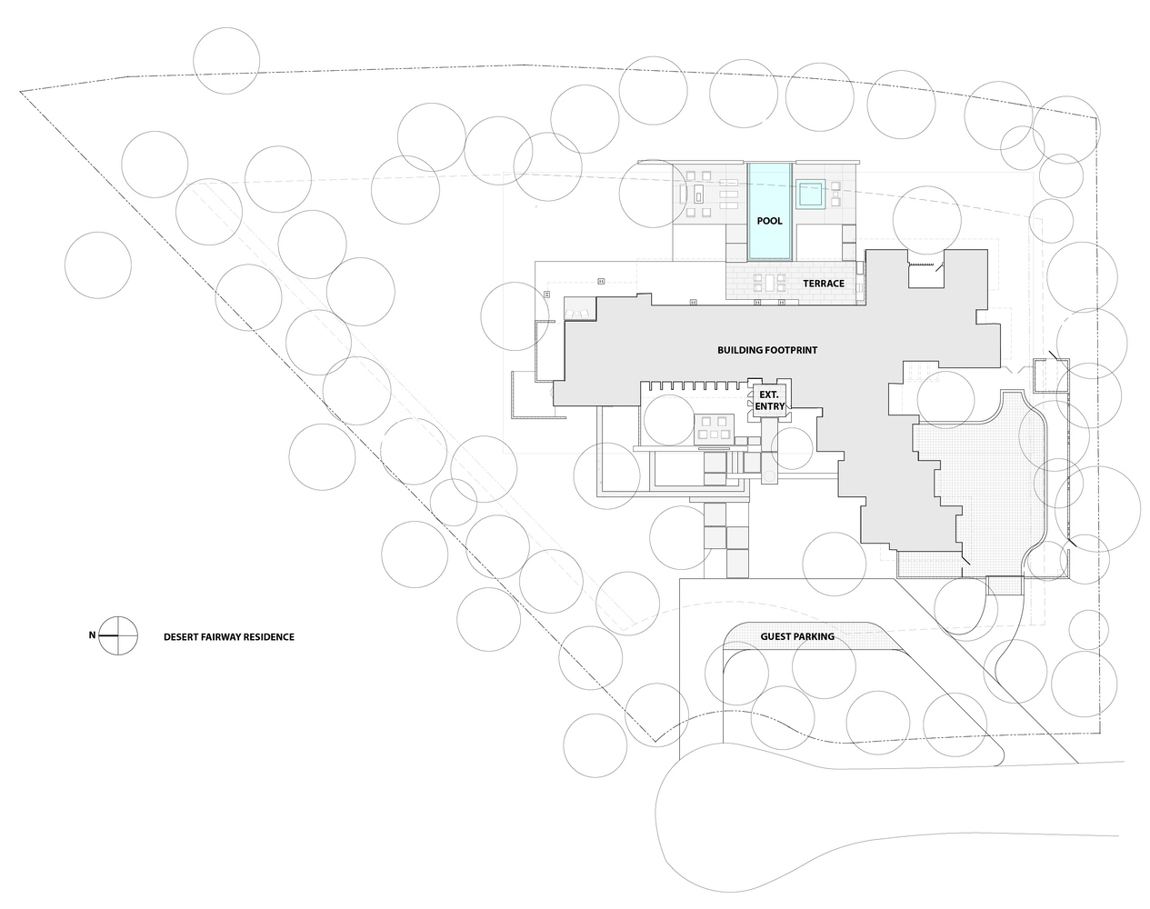 沙漠球道度假别墅设计(Desert Fairway Residence)隐匿在种类丰富的原生植被之中,从繁茂的环境中缓缓显露身姿。它的设计引人注目,低矮的建筑体量界定出私密区域,与为社交区域遮风挡雨的动态折叠金属平面形成鲜明对比。纹理金属不断变化的色调投射出富有韵律的阴影,让人联想起仙人掌的纹理,而有韵律的砖石结构则为室内遮挡西晒的阳光。