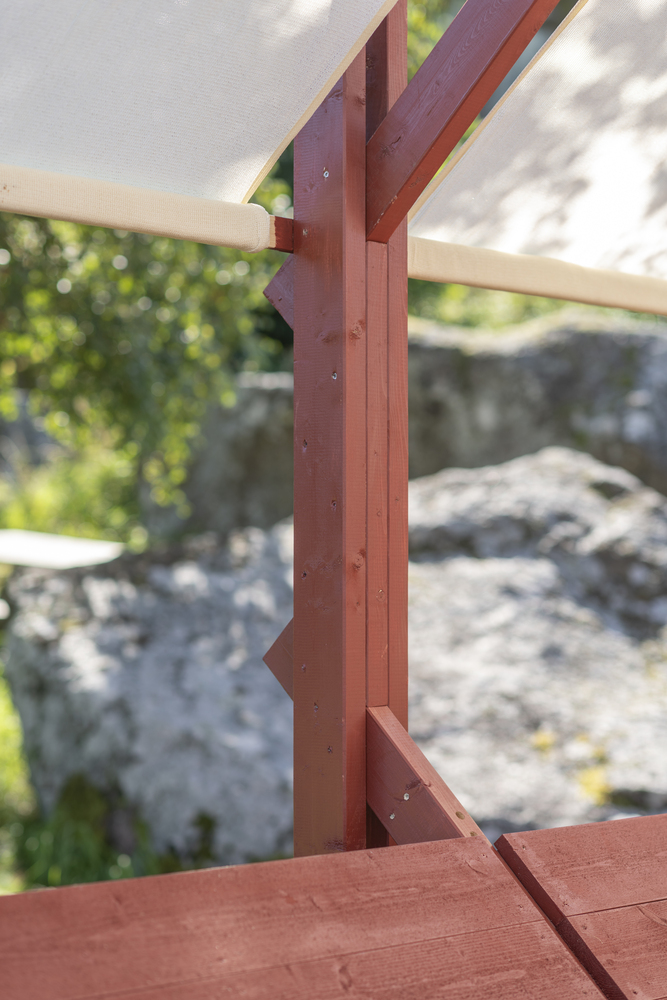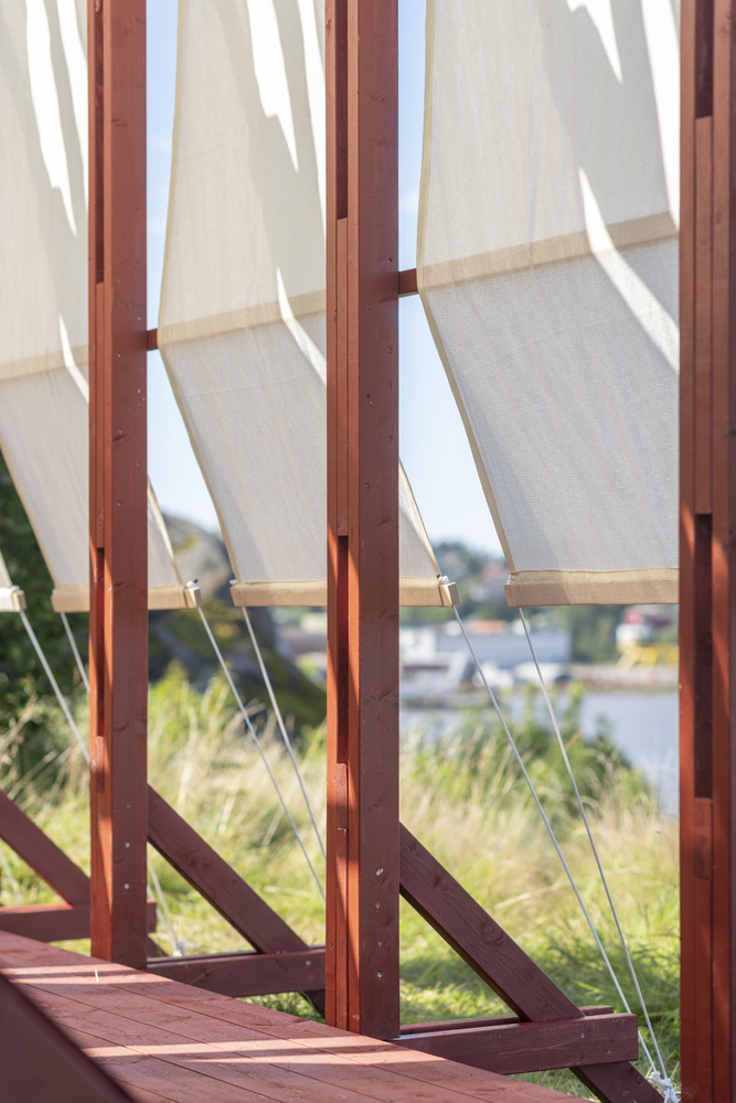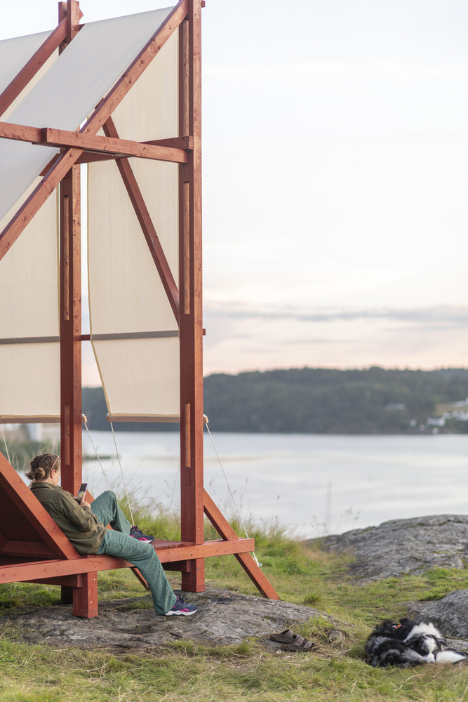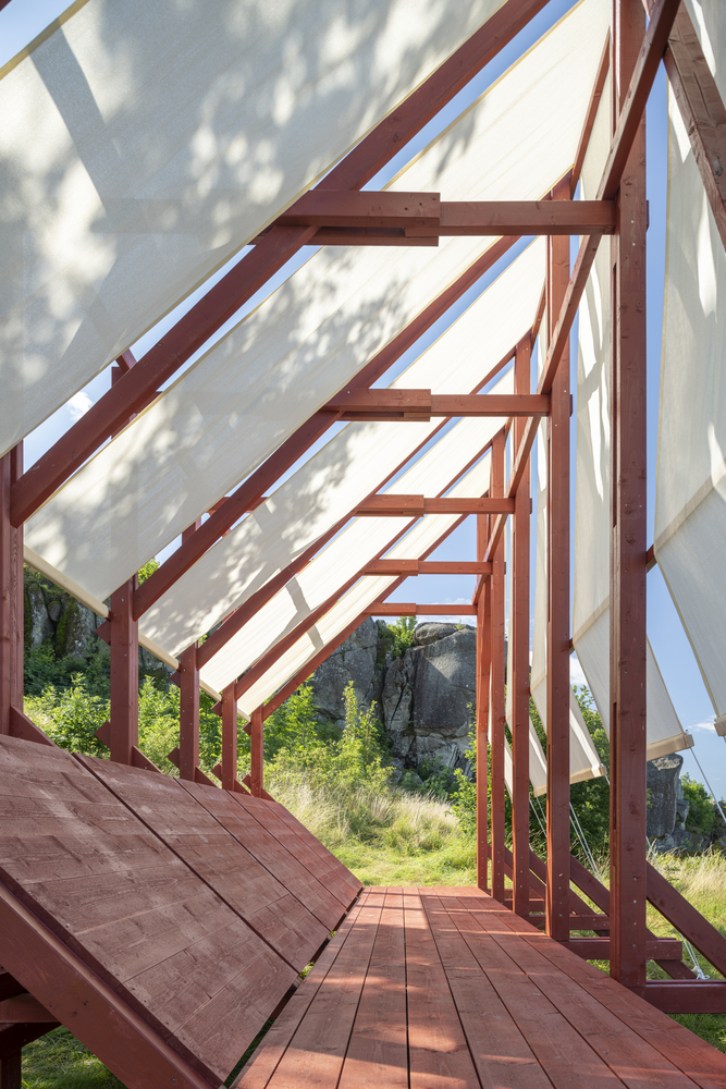 不对称的 “容器 ”躺在岩石上,邀请游客从陆地的角度体验与自然和地平线的亲近感:部分固定在木架结构上的织物让人意识到风的声音和强度的变化,有框架的景观重新建立了人类制造的人工制品与景观之间的关系,而在平静的时刻,可以躺下或坐下来,回味在大自然中可以体验到的沉思和存在感。