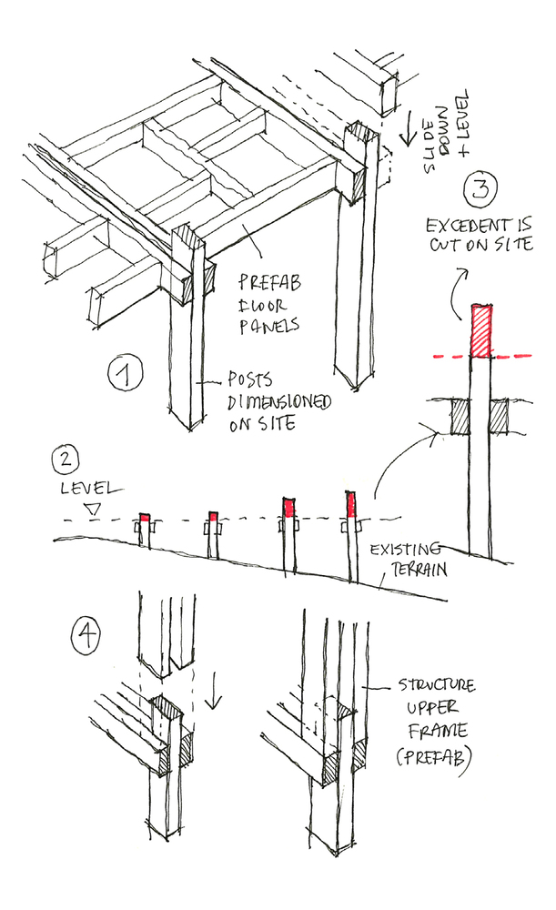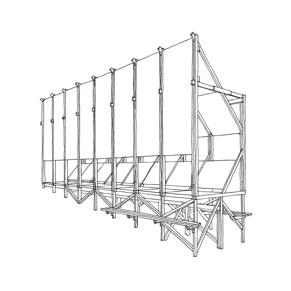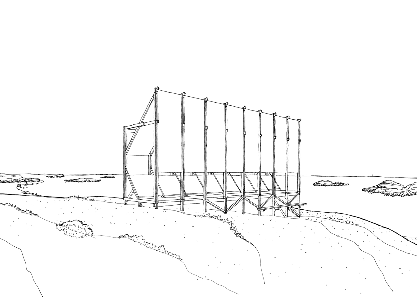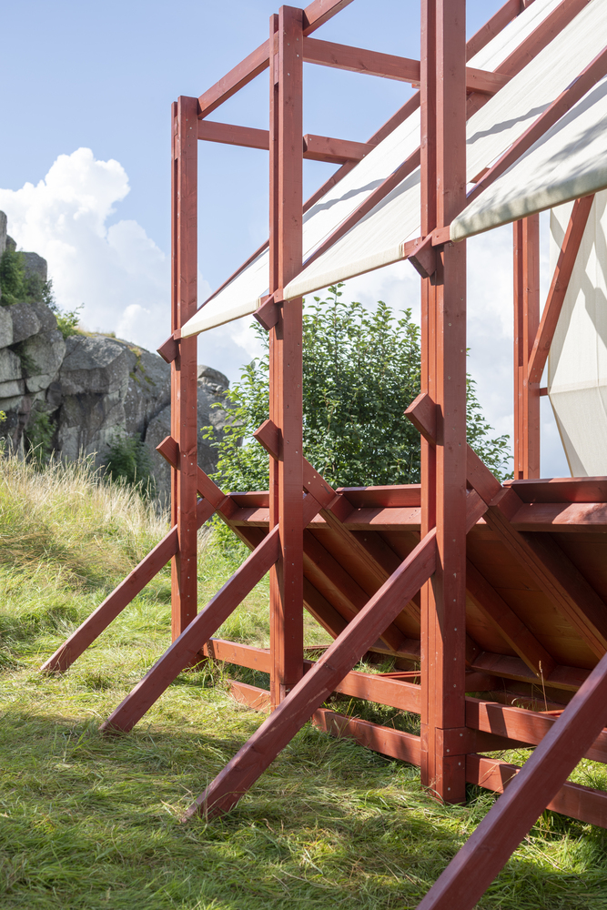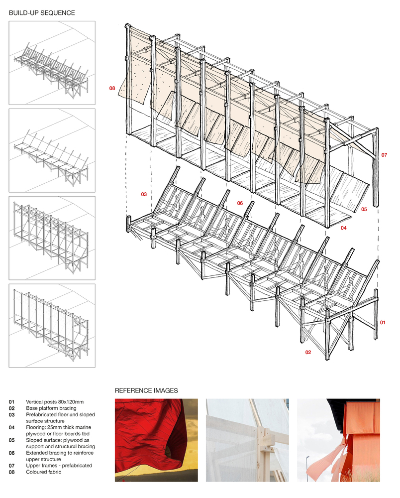 Faerderbiennalen 提议的地点位于 Slottsfjelletmuseet(城市历史遗产博物馆)内。该遗址受到保护,地面上可能到处都有维京人的考古遗迹。因此,必须在没有地基的情况下将结构简单地矗立起来,并避免所有可能的穿透土壤的情况。此外,针对地形的不规则性,该提案旨在通过一个结构系统来说明其短暂和不稳定的状态,从而在不使用地基的情况下适应地形。