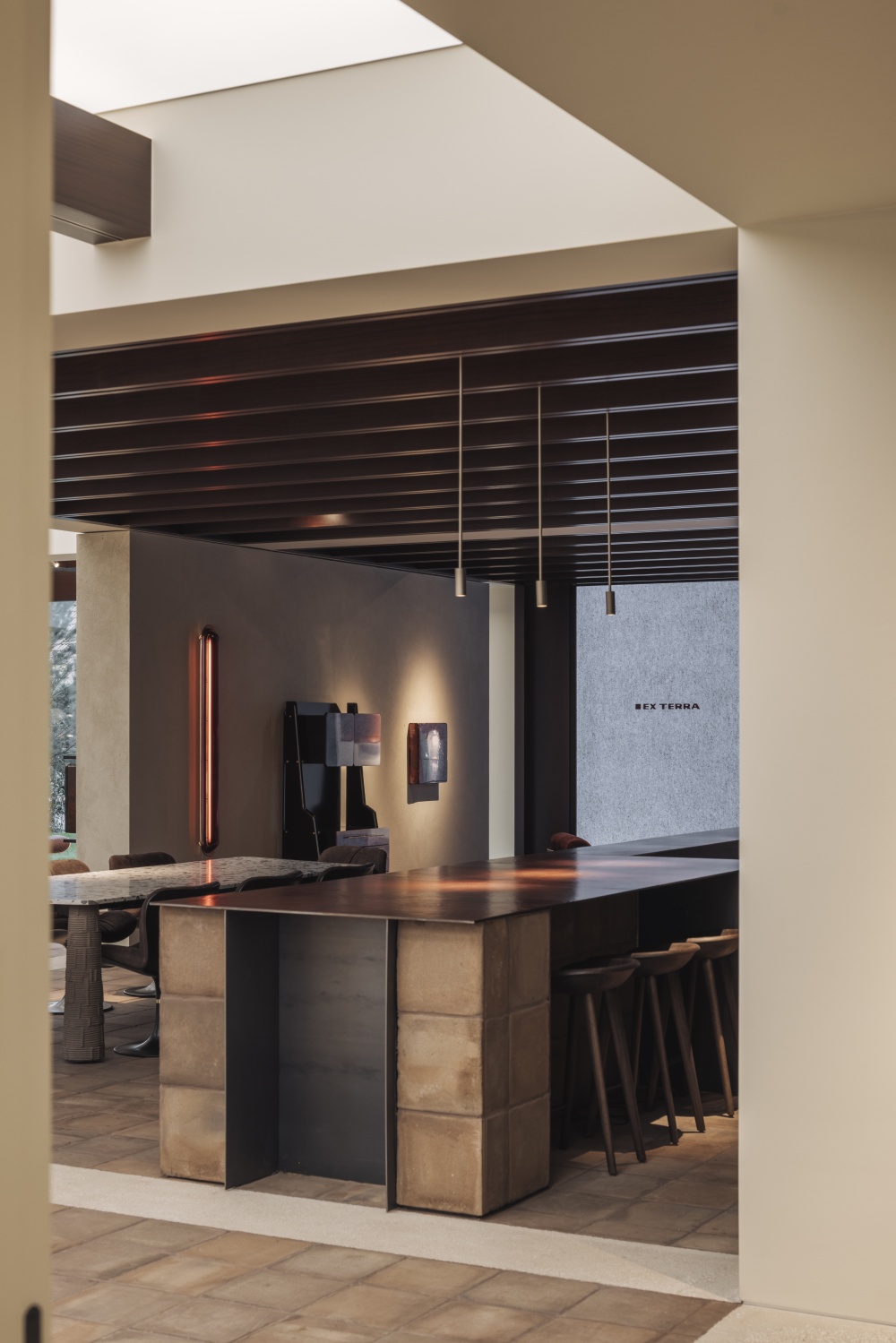 光线设计是 Ex Terra 的灵魂所在,定制的拉伸式柔光天花板成为了空间的 “光影核心”。这种特殊的天花板设计能够散发柔和、均匀的光线,如同将户外的漫射光引入室内,既强化了空间的通透感,又避免了传统照明的生硬与刺眼。全天不同时段,光线会随外界自然环境发生微妙变化:清晨的光线清新淡雅,午后的光线明亮通透,傍晚则逐渐过渡为温暖柔和的暖光,让整个空间始终保持着宁静自然的节奏。自然光与人工光的完美交融,不仅让空间更具层次感与呼吸感,更让置身其中的人能感受到 “与自然共生” 的松弛感,完美诠释了 “当代静谧奢华” 的核心内涵。
