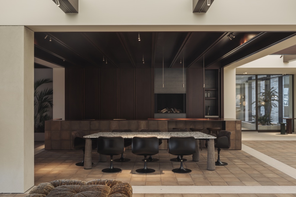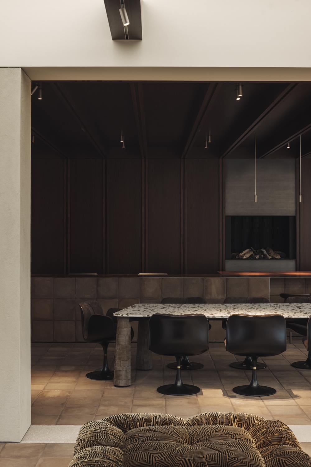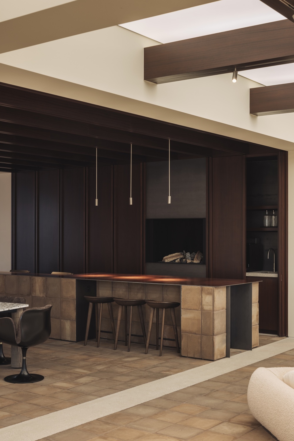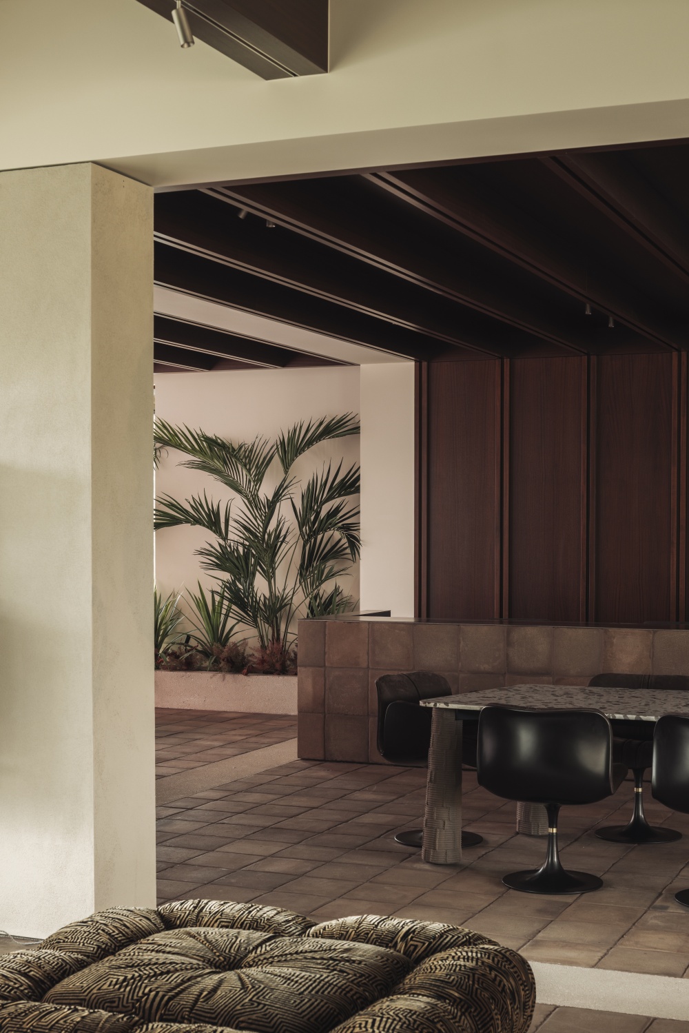 材质的选择是空间氛围营造的核心,设计团队通过不同质感与风格的材质碰撞,实现了室内外、传统与现代的和谐共生。温暖的陶土色地面是空间的 “温度基底”,其柔和的色调与细腻的肌理从室内自然延伸至水磨石混凝土基座,两种材质在触觉上形成 “软与硬” 的对比,却在视觉上达成完美衔接,模糊了室内外的物理边界。萨佩莱木装饰元素的点睛运用,则巧妙呼应了豪尔赫・扎尔苏平(Jorge Zalszupin)所代表的巴西现代主义风格 —— 木材的天然纹理与温润色泽,中和了混凝土的粗犷与陶土的质朴,为空间注入了人文温度,也让现代商业空间与经典设计风格产生了跨越时空的对话,营造出兼具自然气息与艺术质感的独特氛围。