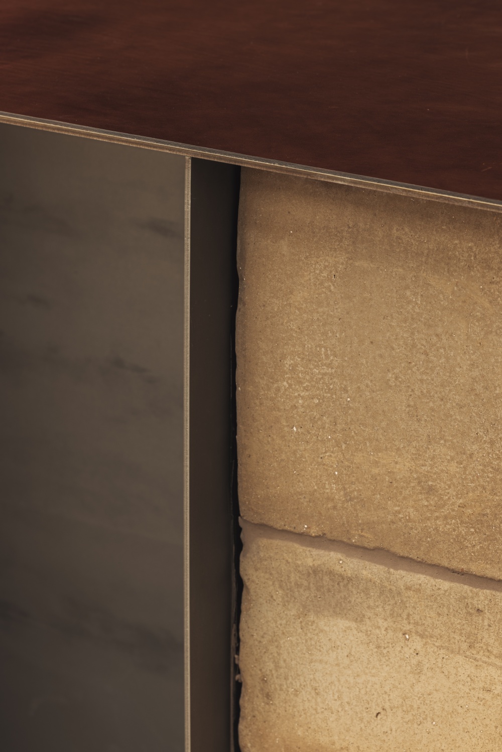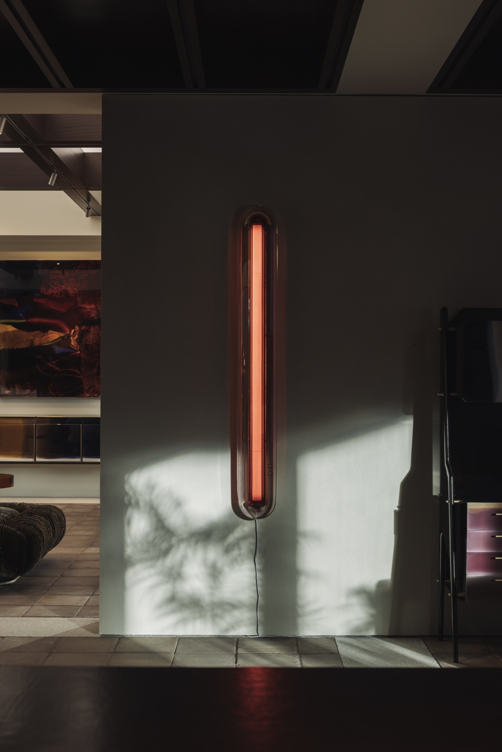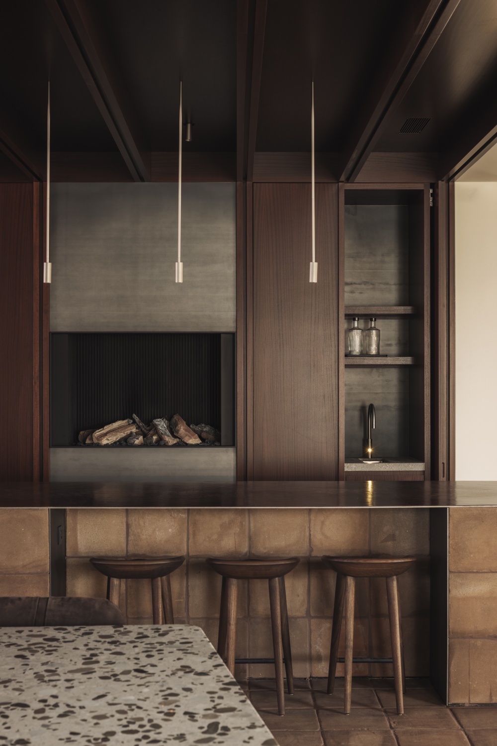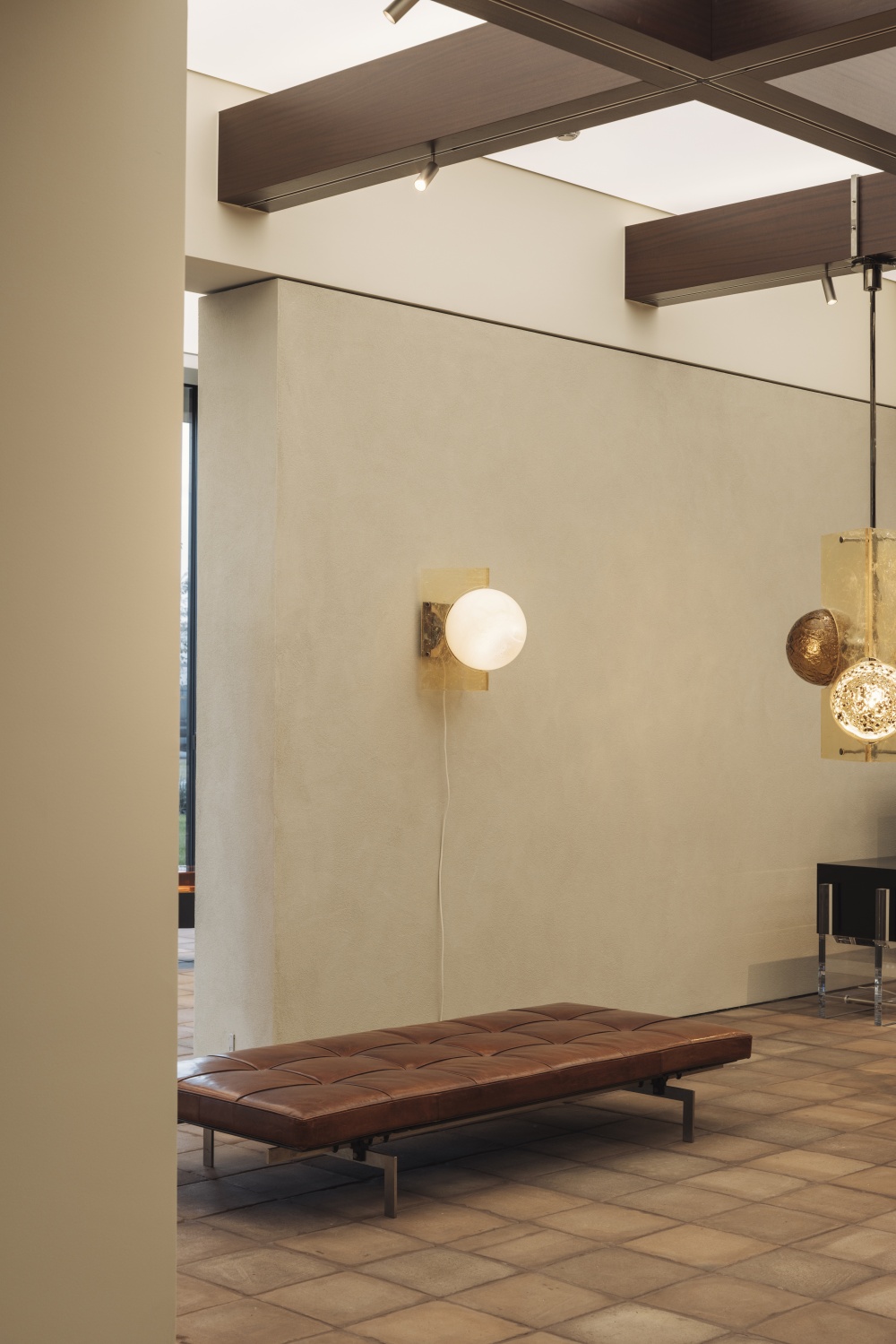 材质的选择是空间氛围营造的核心,设计团队通过不同质感与风格的材质碰撞,实现了室内外、传统与现代的和谐共生。温暖的陶土色地面是空间的 “温度基底”,其柔和的色调与细腻的肌理从室内自然延伸至水磨石混凝土基座,两种材质在触觉上形成 “软与硬” 的对比,却在视觉上达成完美衔接,模糊了室内外的物理边界。萨佩莱木装饰元素的点睛运用,则巧妙呼应了豪尔赫・扎尔苏平(Jorge Zalszupin)所代表的巴西现代主义风格 —— 木材的天然纹理与温润色泽,中和了混凝土的粗犷与陶土的质朴,为空间注入了人文温度,也让现代商业空间与经典设计风格产生了跨越时空的对话,营造出兼具自然气息与艺术质感的独特氛围。