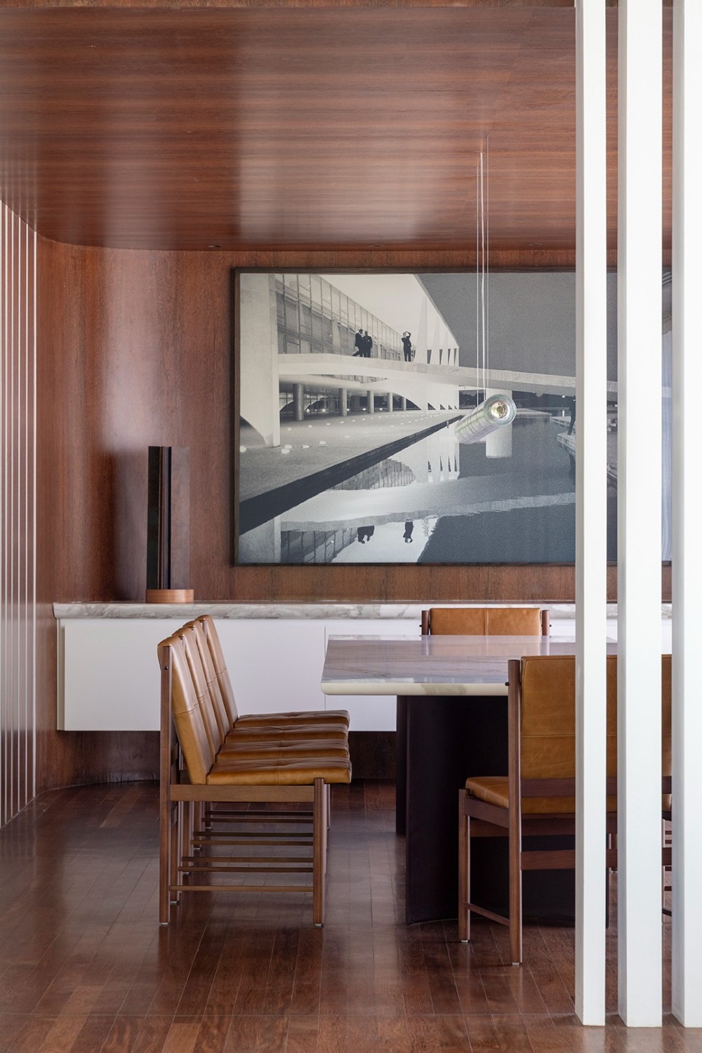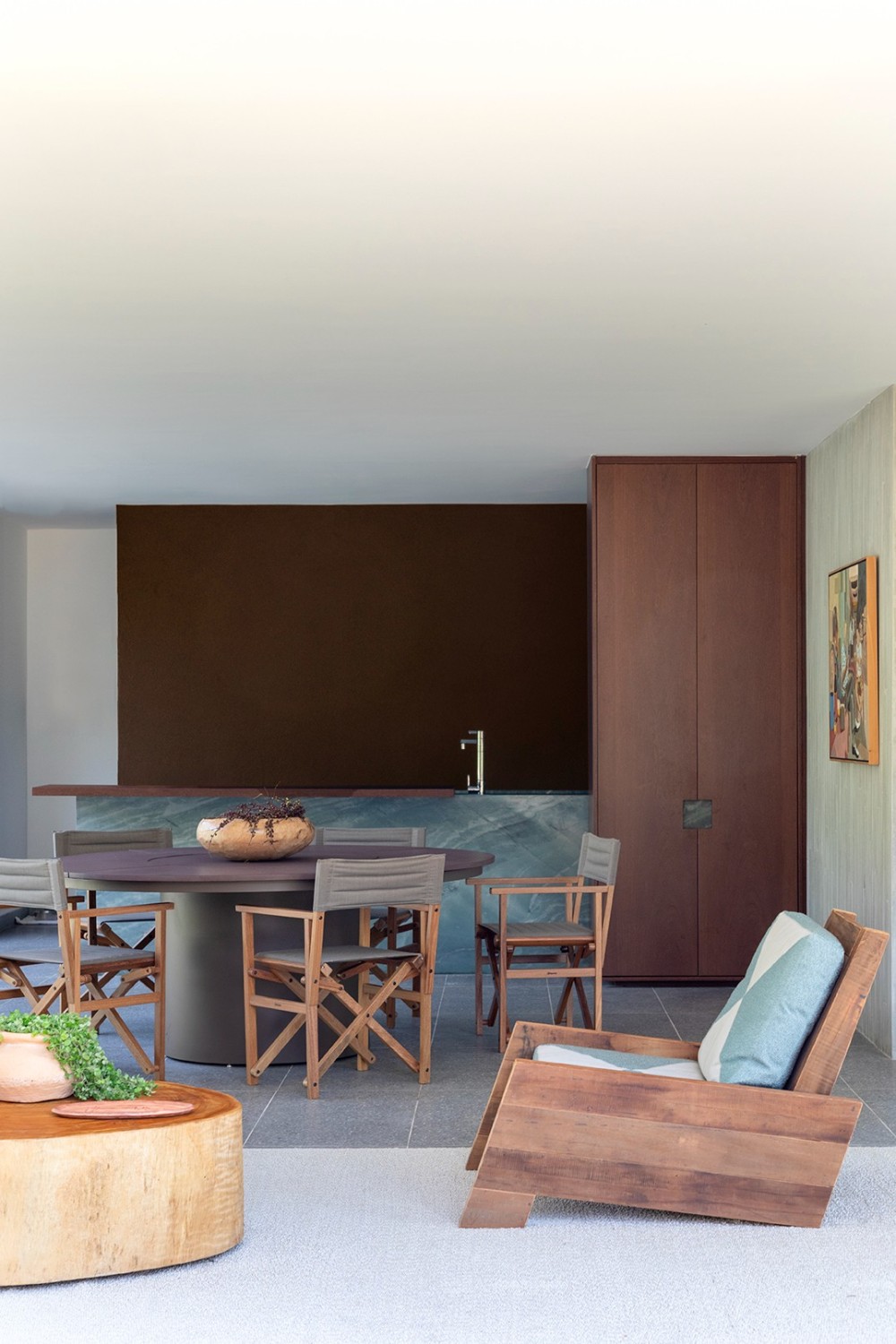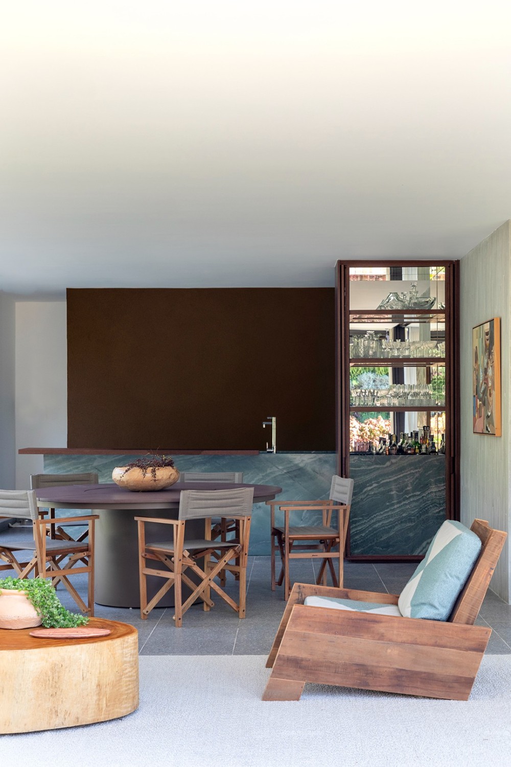 在当代室内设计的语境中,“艺术感” 与 “烟火气” 的平衡始终是核心命题。这套住宅设计以 “材质的对话” 与 “空间的诗性” 为线索,将艺术收藏、天然材质与功能布局编织成一场沉浸式的生活体验 —— 每一处细节都在诉说着 “克制中的奢华,简约里的深度”。餐厨区的蓝绿色大理石中岛如艺术雕塑般矗立,既承担备餐功能,又成为视觉焦点;与之相连的圆形餐桌搭配折叠式木质餐椅,营造出 “可聚可散” 的社交场景。一旁的隐藏式酒柜设计尤为精妙 —— 闭合时是深色实木的简洁立面,开启后则是玻璃展柜与酒水的精致陈列,让 “收纳” 也成为空间的艺术装置。