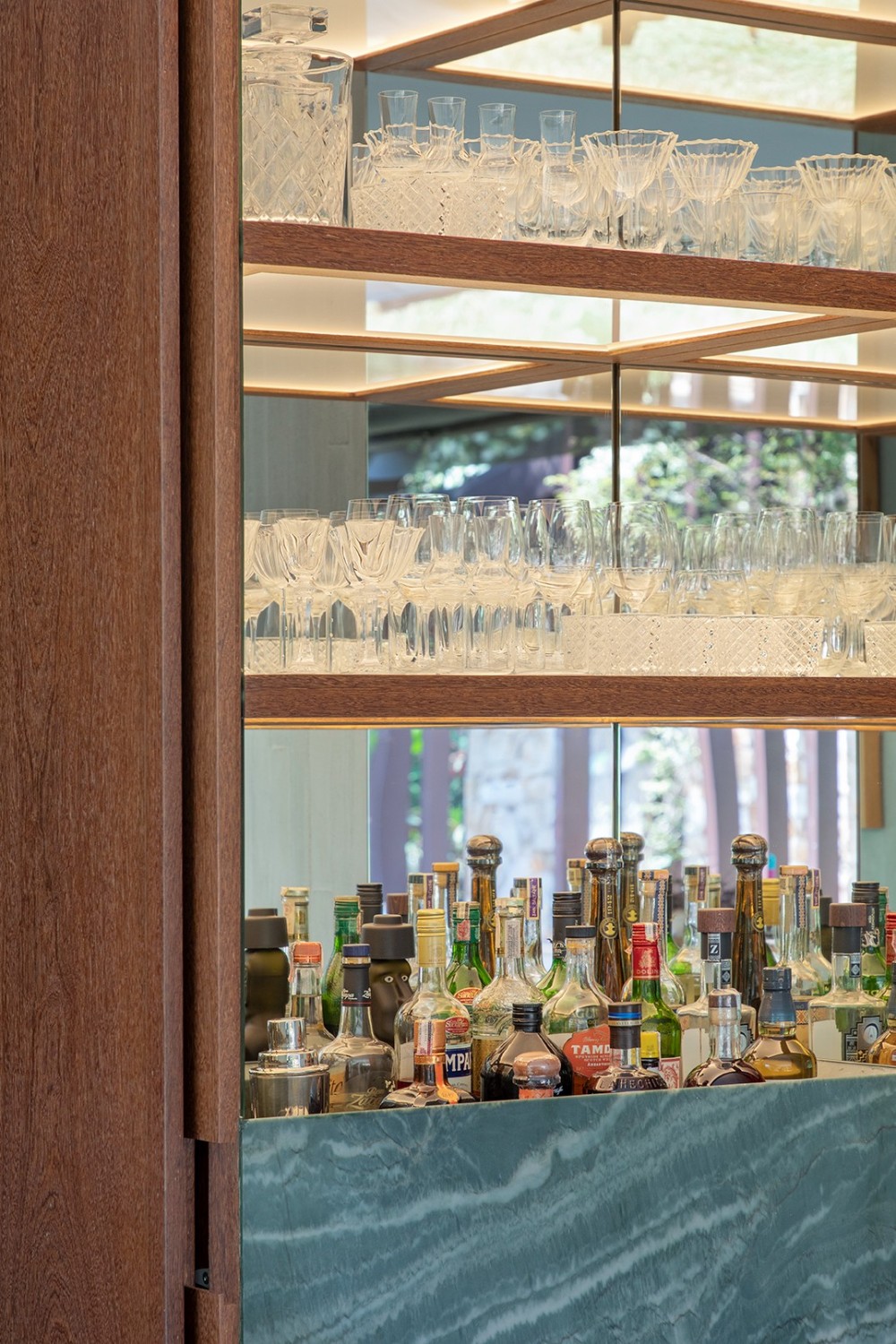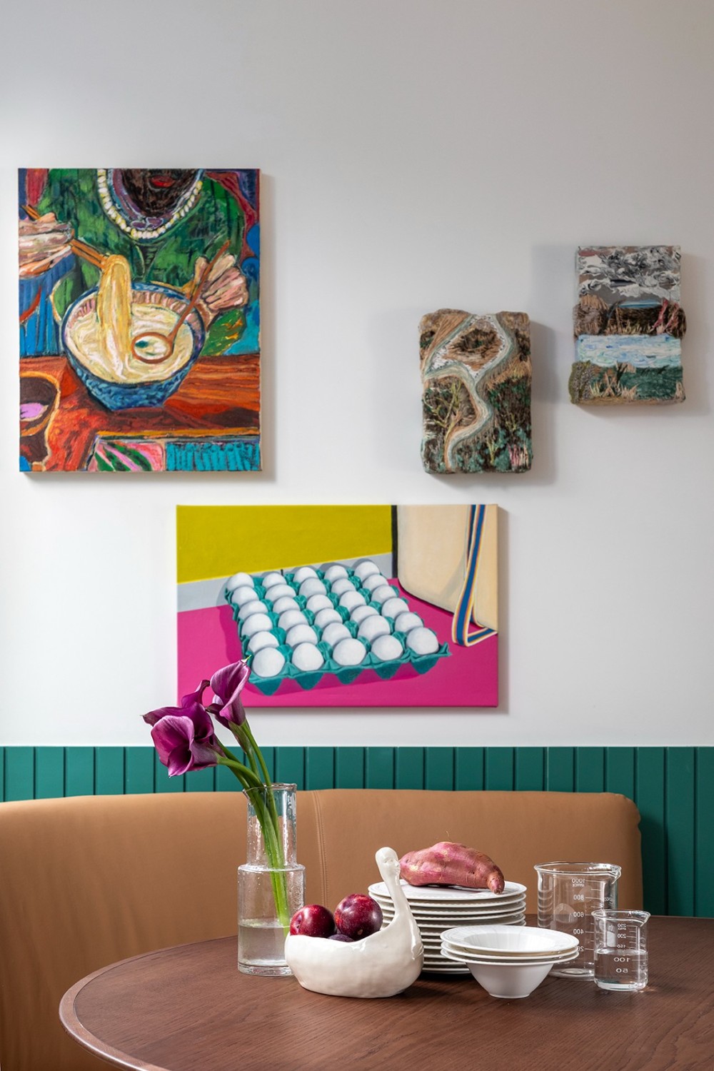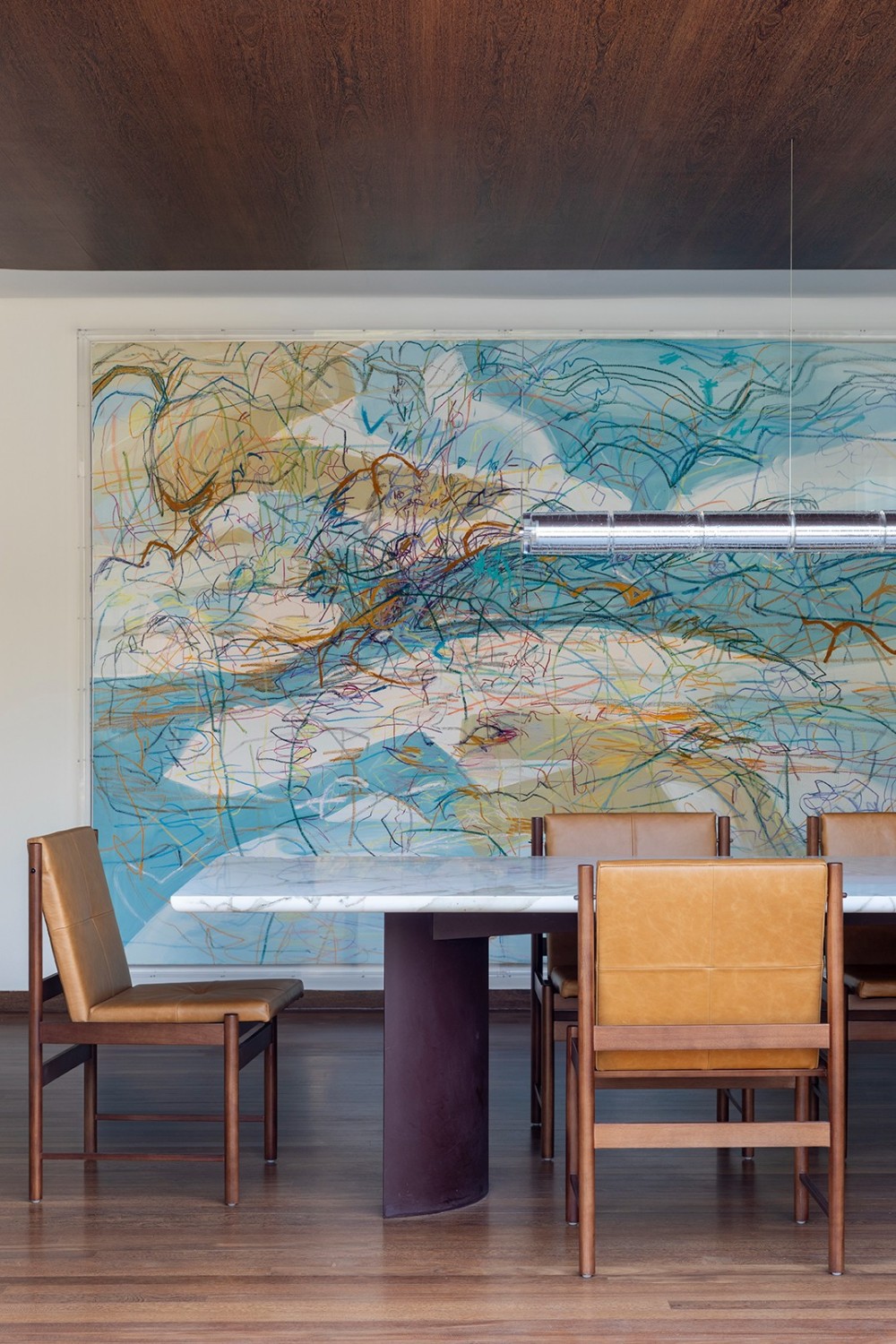 在当代室内设计的语境中,“艺术感” 与 “烟火气” 的平衡始终是核心命题。这套住宅设计以 “材质的对话” 与 “空间的诗性” 为线索,将艺术收藏、天然材质与功能布局编织成一场沉浸式的生活体验 —— 每一处细节都在诉说着 “克制中的奢华,简约里的深度”。餐厨区的蓝绿色大理石中岛如艺术雕塑般矗立,既承担备餐功能,又成为视觉焦点;与之相连的圆形餐桌搭配折叠式木质餐椅,营造出 “可聚可散” 的社交场景。一旁的隐藏式酒柜设计尤为精妙 —— 闭合时是深色实木的简洁立面,开启后则是玻璃展柜与酒水的精致陈列,让 “收纳” 也成为空间的艺术装置。