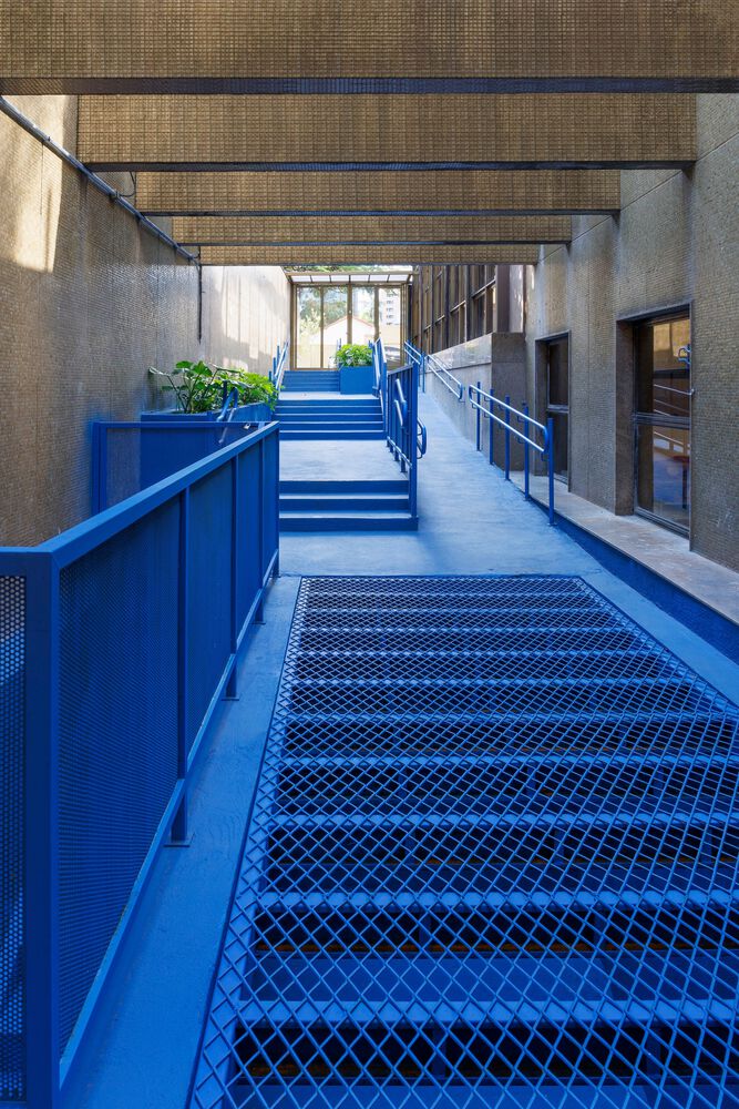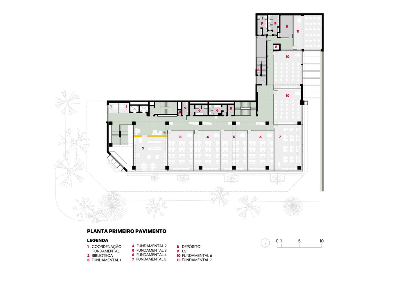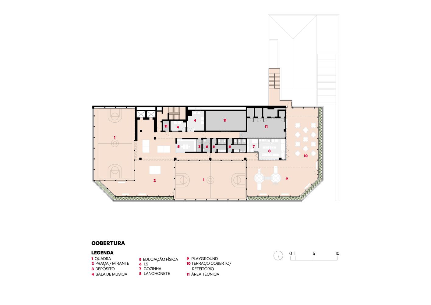 礼堂内,塞尔吉奥・罗德里格斯(Sérgio Rodrigues)设计的标志性长排座椅被保留并修复。该空间还改善了通道,添加了色彩(新地毯和天花板涂料),带来了舒适的感觉和良好的声学效果。地下室的实验室和幼儿教室设计了不同尺寸的开口,促进了各环境之间的视觉和功能整合,同时不影响空间的流动性。地下室还设有一个为幼儿教育设计的室内运动场地,战略性地靠近教室,方便幼儿出入。