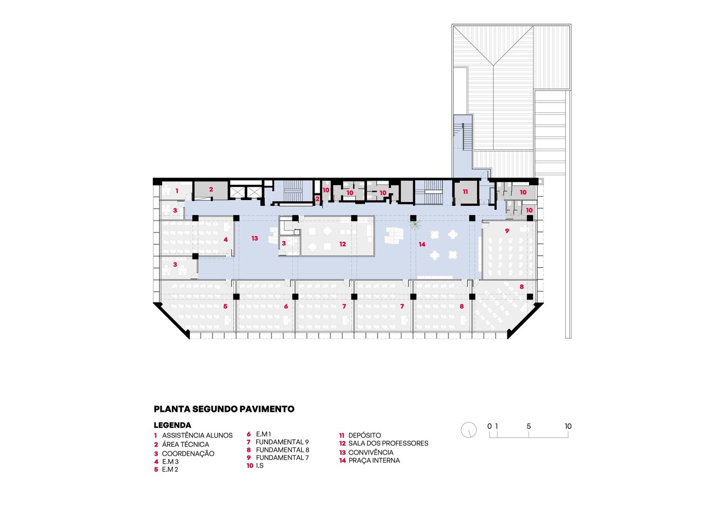 玛格南学校设计卢尔德校区(Colégio Magnum Unidade Lourdes)位于自由广场附近,其校舍是一栋标志性建筑,由爱迪生・穆萨(Edison Musa)于 20 世纪 80 年代设计,最初是为一家银行而建。这栋建筑的翻新改造是一项重大挑战:既要保留其历史和建筑价值,又要使其适应现代学校的需求。改造后的空间向城市开放,设有公共活动和休闲区域,同时为学生和教职工提供了安全、舒适的环境。