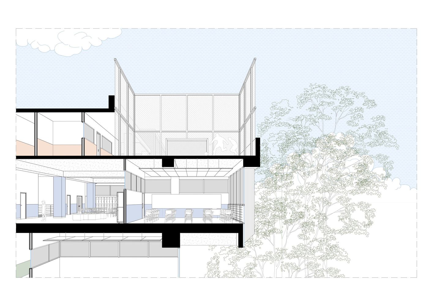 最后,屋顶被改造成一个运动和公共活动广场,可俯瞰城市,且光照充足 —— 这是一个真正的休闲和融合空间。该项目不仅尊重和珍视建筑的历史,还带来了创新、功能性,并对建筑在学校环境中的作用有了新的认识。最终呈现出的是一所充满活力、富有启发性且与城市及其居住者紧密相连的学校。