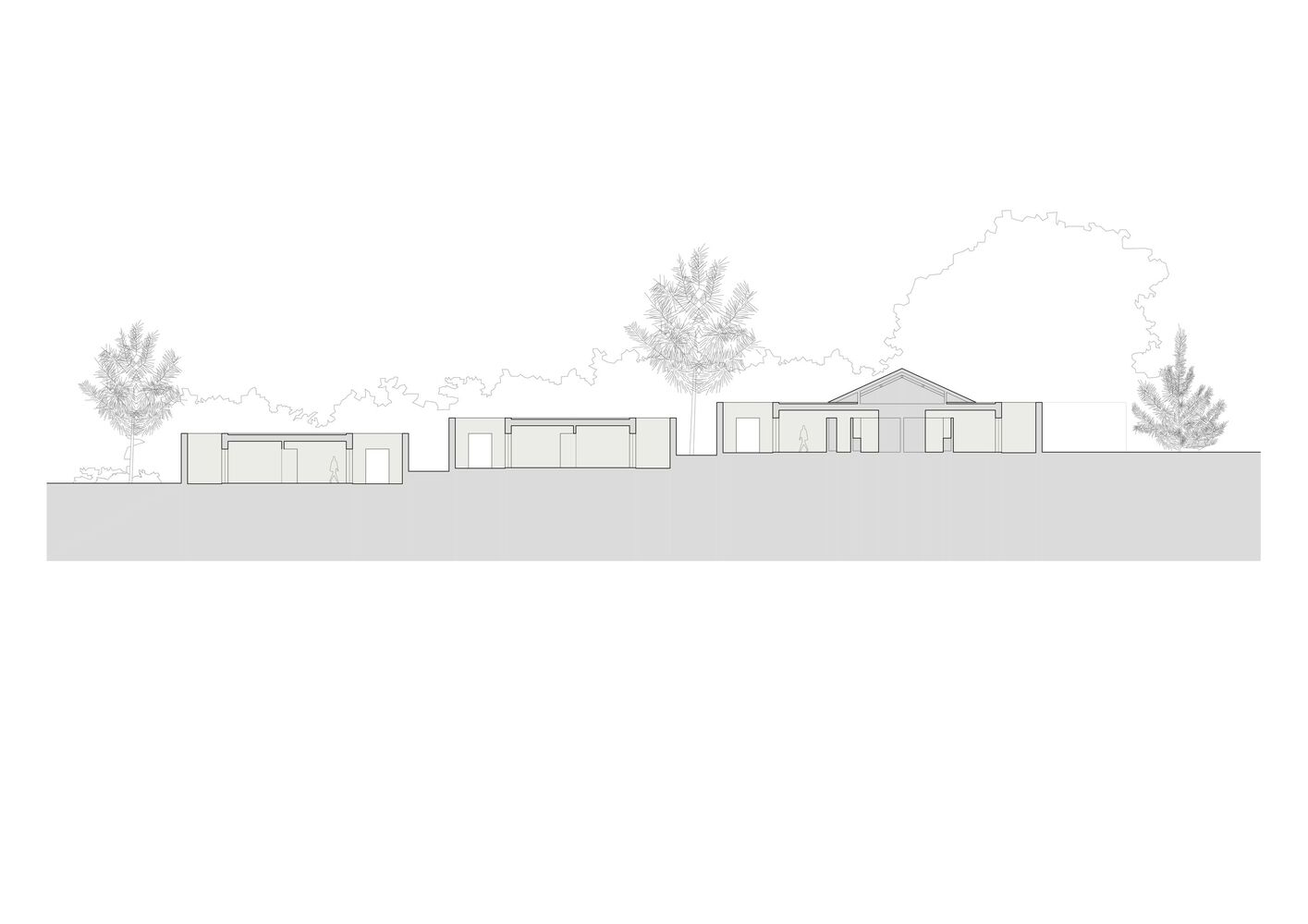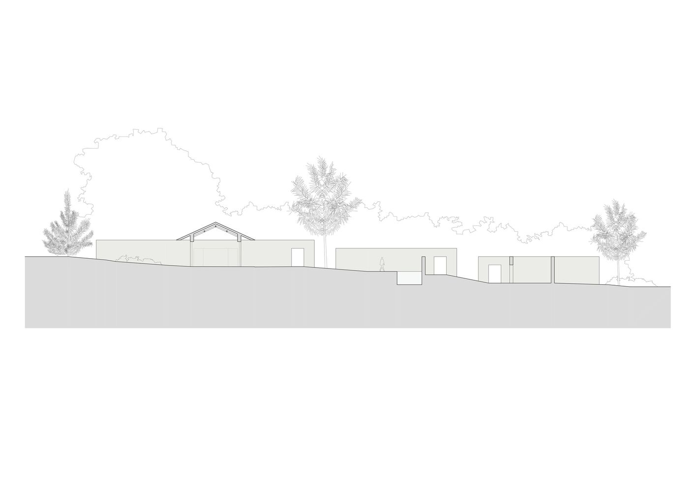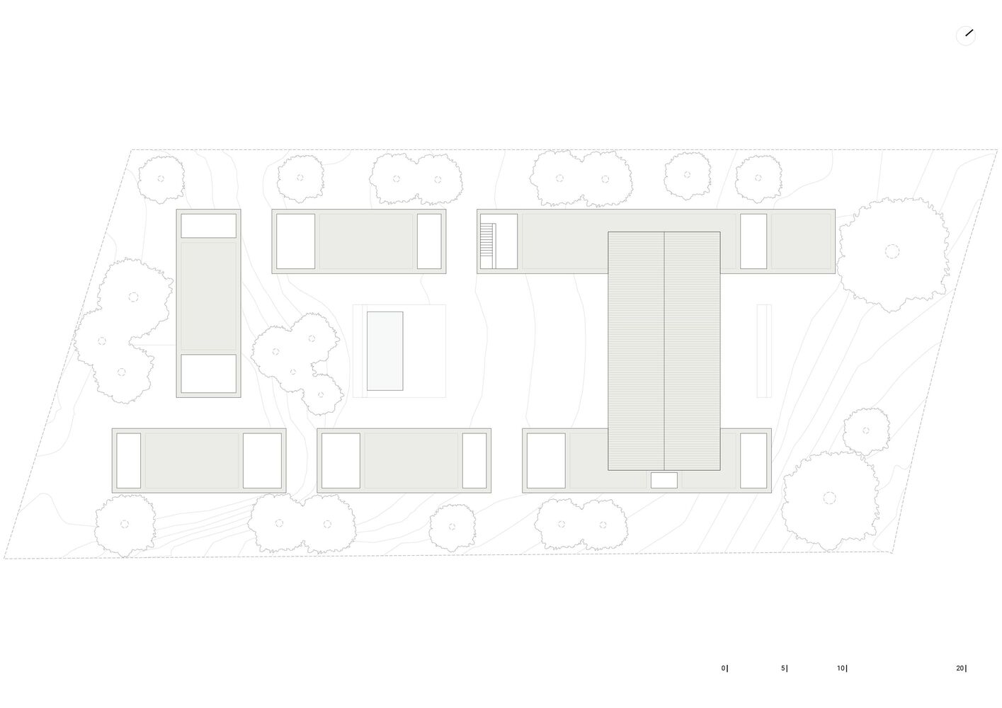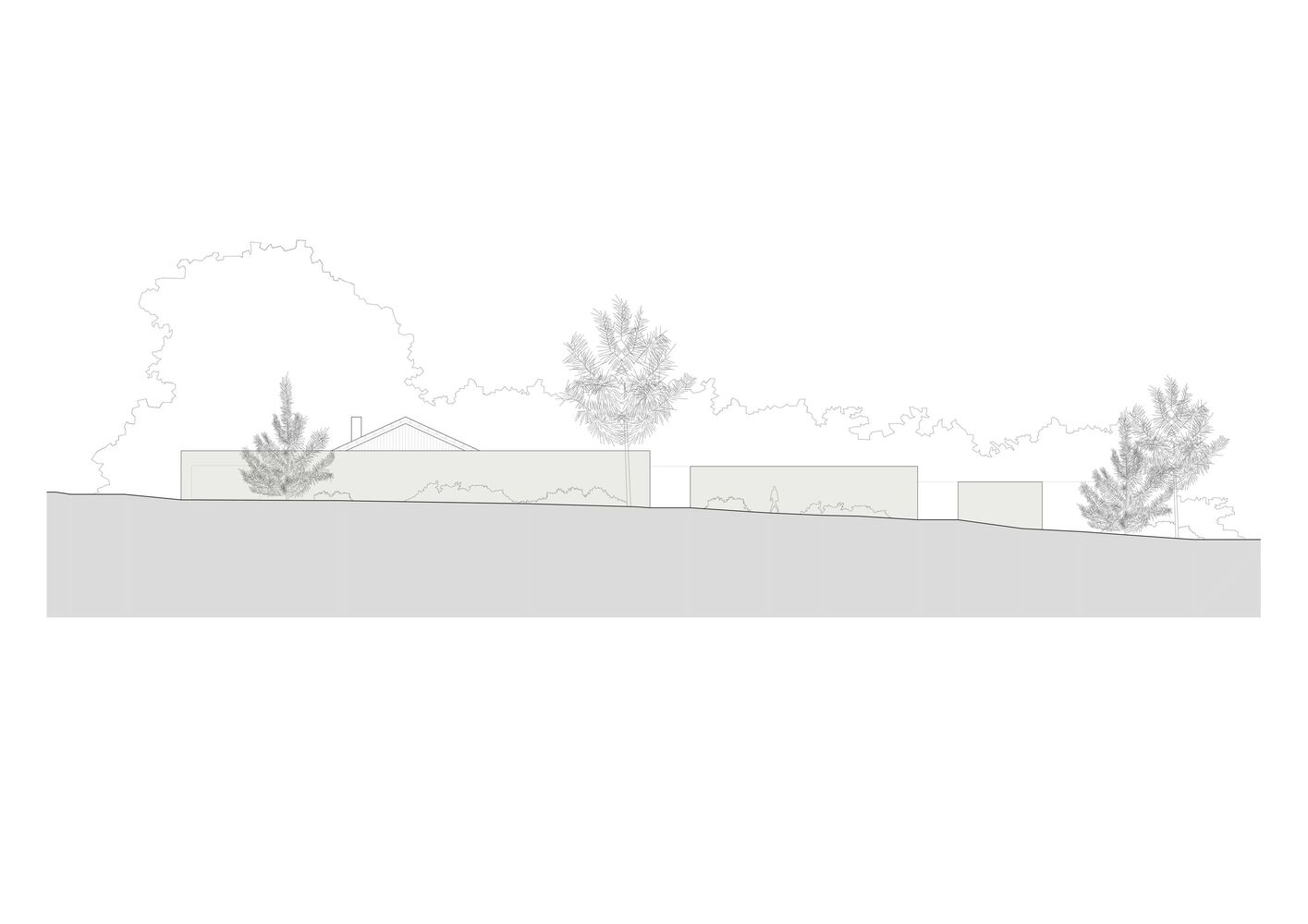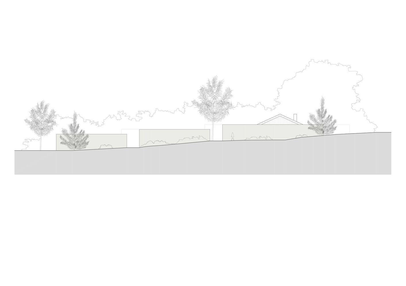 住宅本身就是边界,是框定视野的设计表达。针对碎片化的功能布局,设计以统一的造型与之相对。那些近乎封闭的建筑体量以一定节奏排列,构成了空间的外围。每个单元 —— 卧室、庭院,都是一处隐秘的休憩之地。