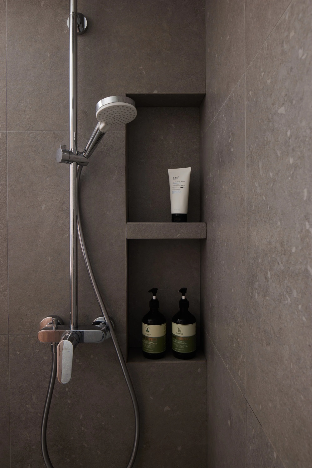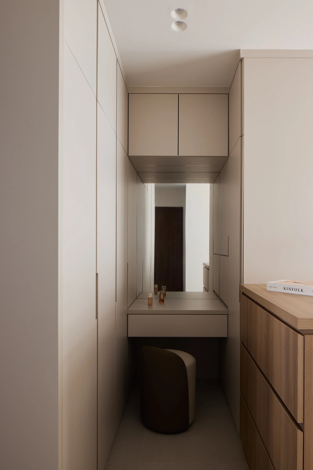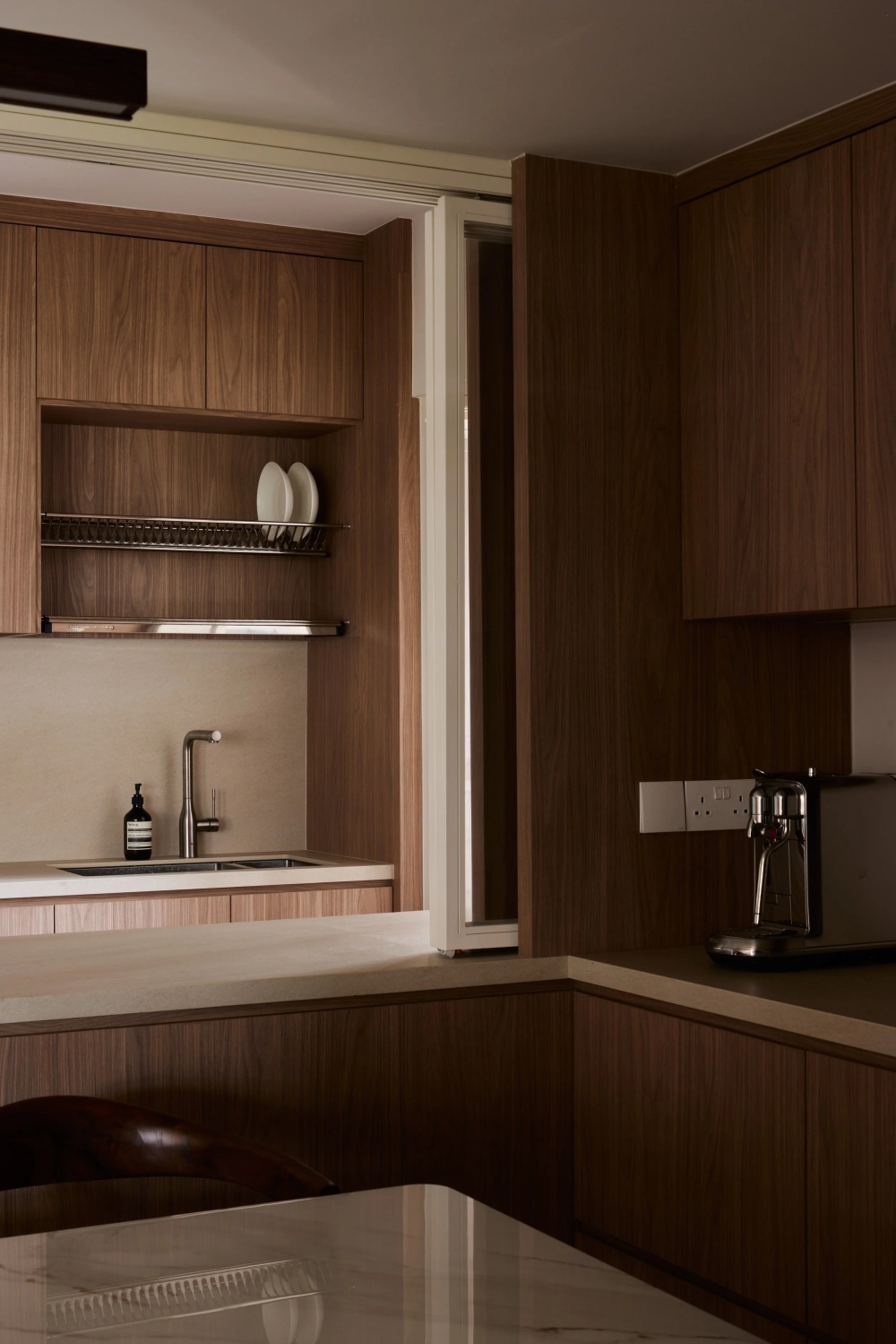公共区域的柜台选用黑核桃层压板,木质的天然纹理与温润色泽,中和了瓷砖与石材的冷硬,传递出居家的暖意;厨房与浴室的台面分别采用 Crema Limestone(奶油石灰石)与 Cement Light Grey(水泥浅灰)烧结石,细腻的肌理中透着高级感,且抗污耐磨,完美适配高频使用场景;主卧室则切换为更轻盈的浅木色调与中性层压材料,搭配柔软的床品与窗帘,营造出 “卸下所有疲惫” 的休憩氛围。