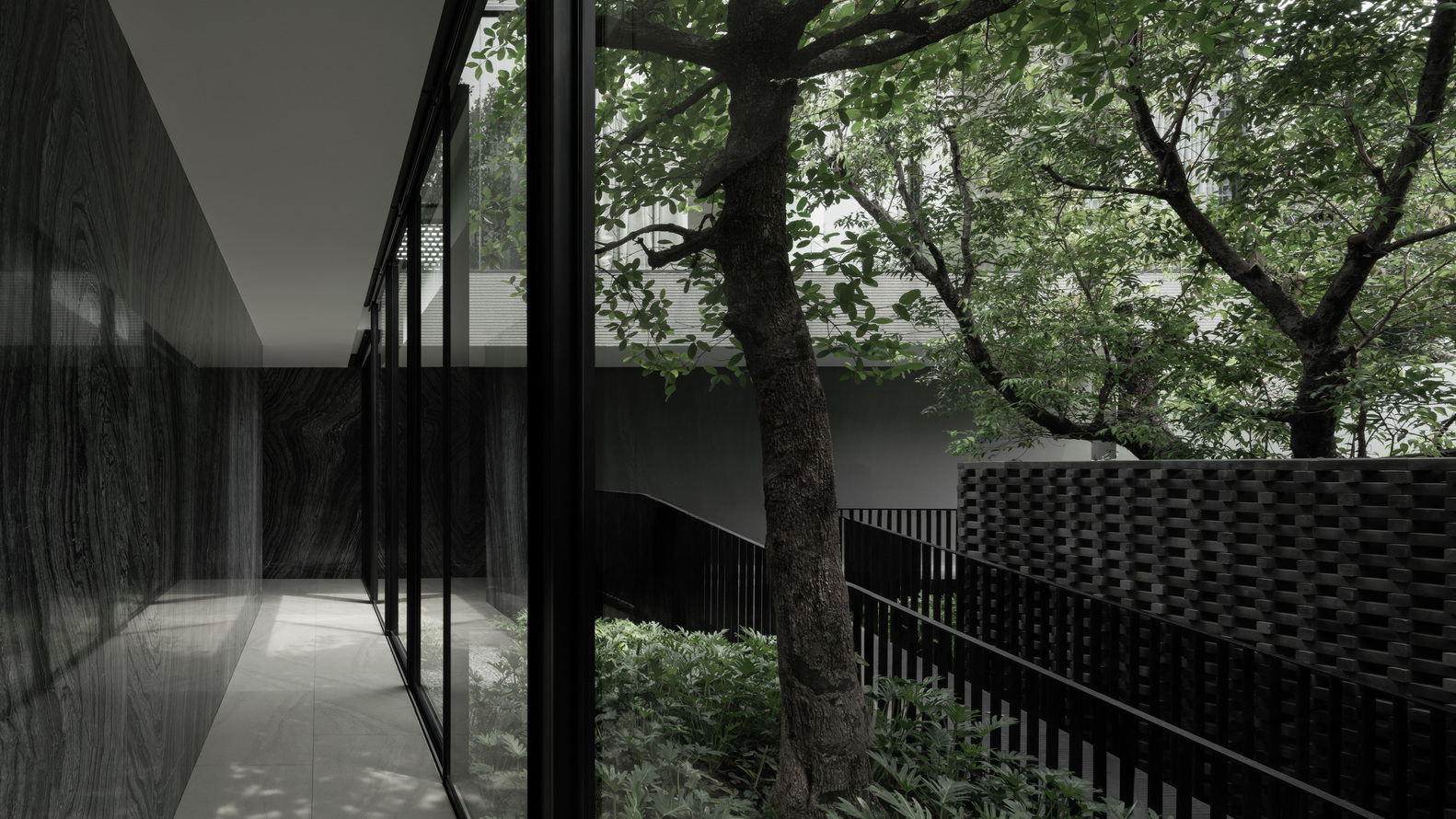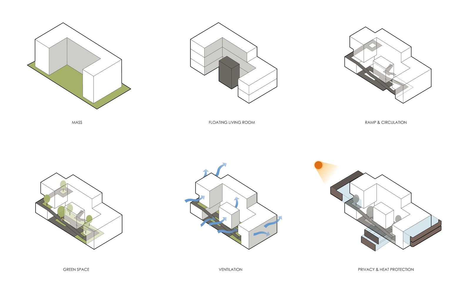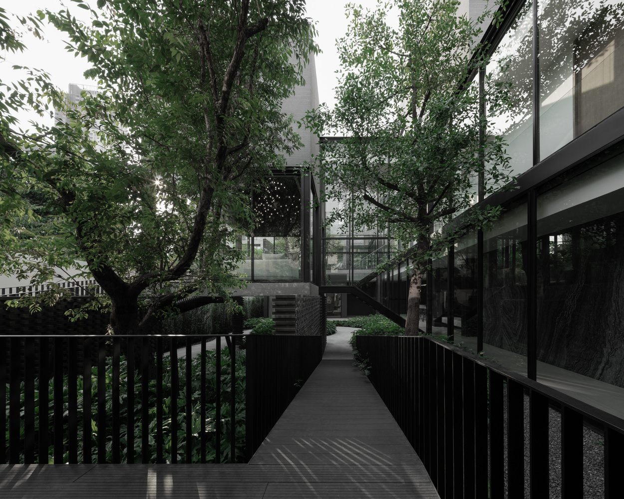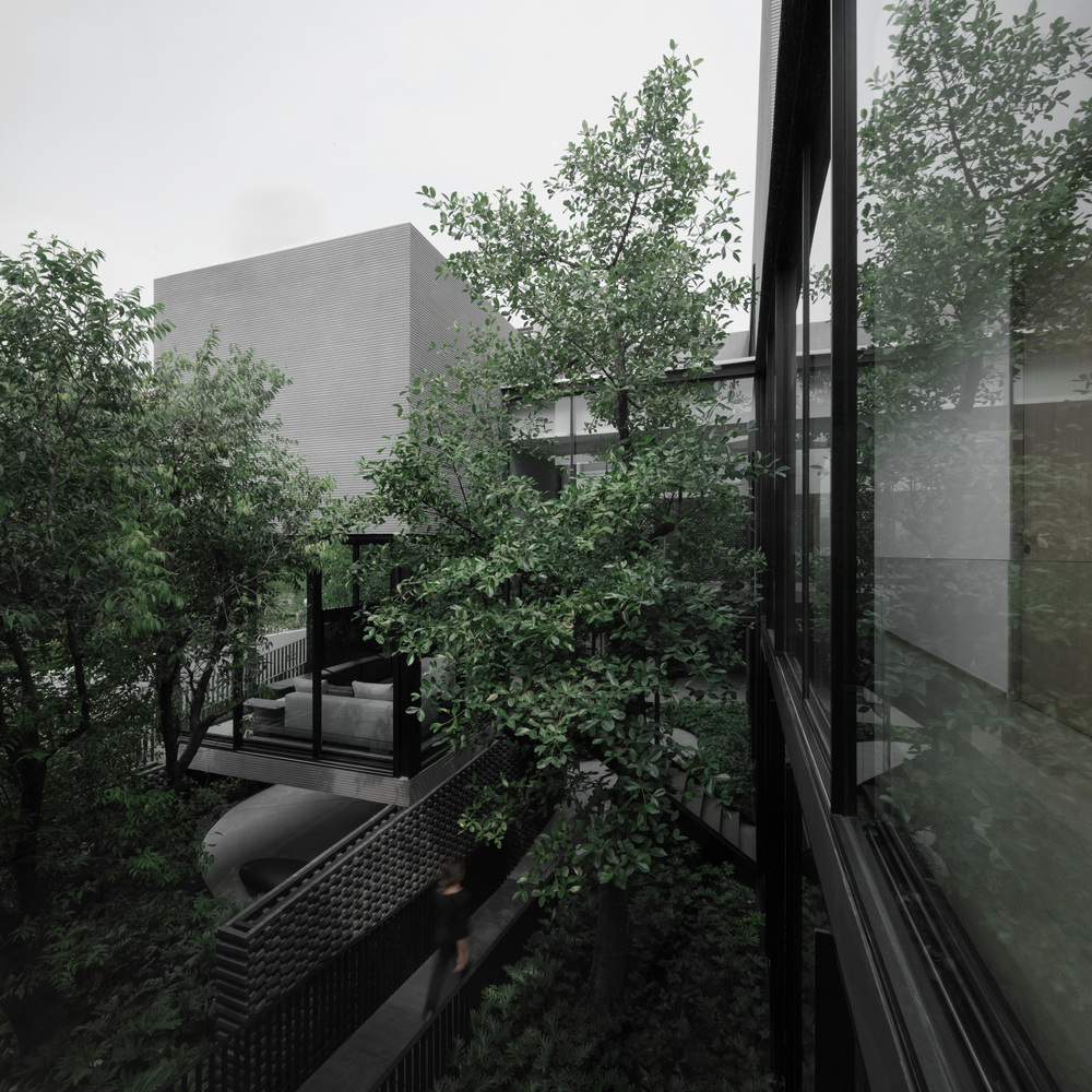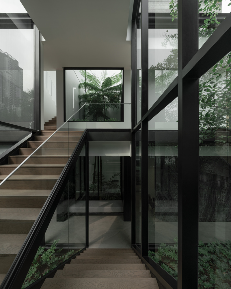 在外立面设计上,朝向庭院的墙体采用全透明处理,以最大化各功能区域的视觉可达性。项目同时注重连接室内外活动,并确保建筑内部获得充足的自然光。住宅外侧紧邻大型桥梁与公路,因此朝向这些周边区域的外墙采用封闭设计,以保障居住私密性;同时,考虑到曼谷炎热潮湿的气候,这些外墙又具备通风功能,以适应当地气候条件。