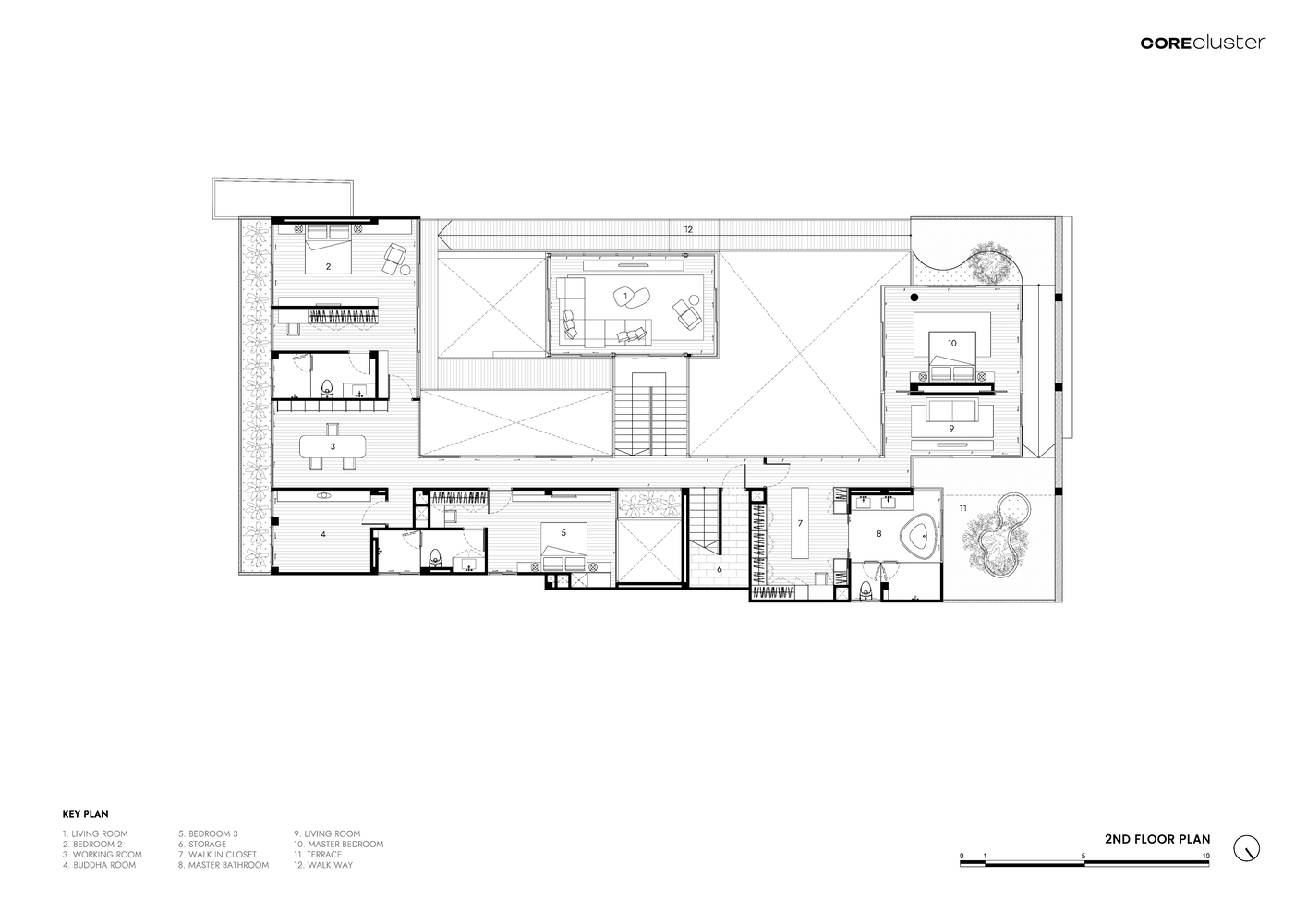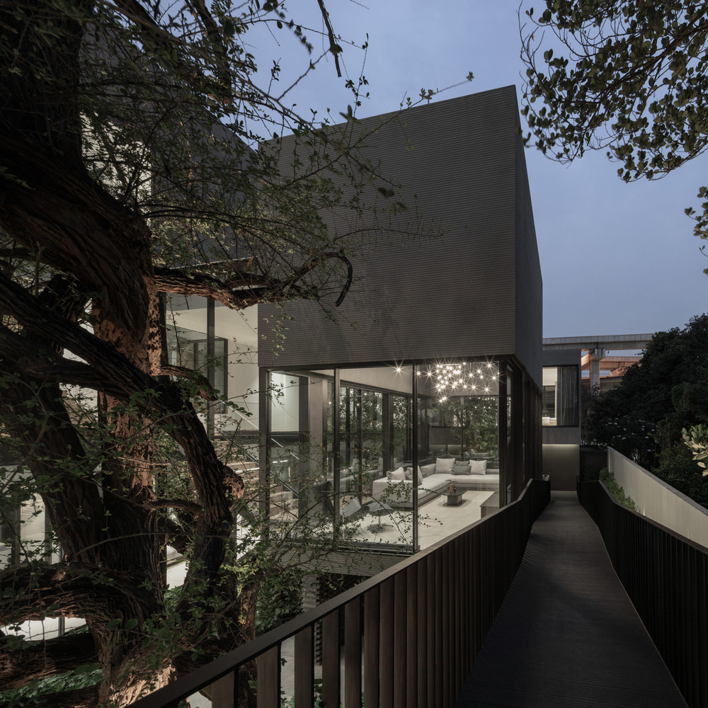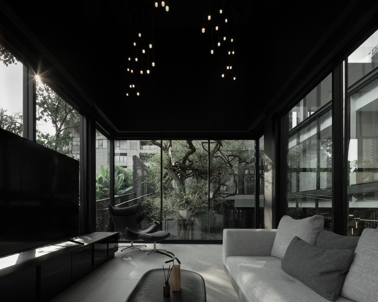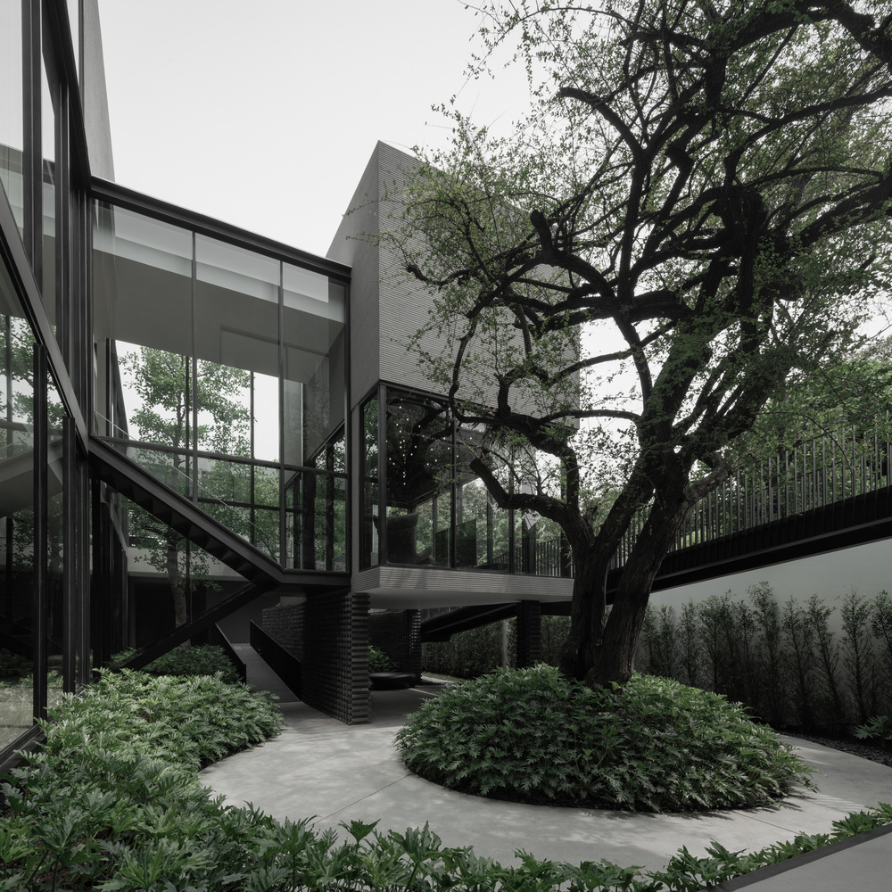 “U” 形平面自然围合出中央空间,该区域由庭院与客厅构成。这座悬浮于半空的挑高客厅,不仅在其下方预留了额外的跑步空间,还能与其他功能区域及庭院形成视觉连通 —— 庭院内的植被经过高度整理,进一步提升了视觉体验。客厅四周采用全玻璃设计,既强化了这种空间连通性,又营造出 “共享空间” 的通透感。从功能关系来看,尽管客厅与其他功能区域处于独立的建筑体量中,但其功能定位与位置布局,仍将 “家” 的理念融入了住宅建筑设计之中。