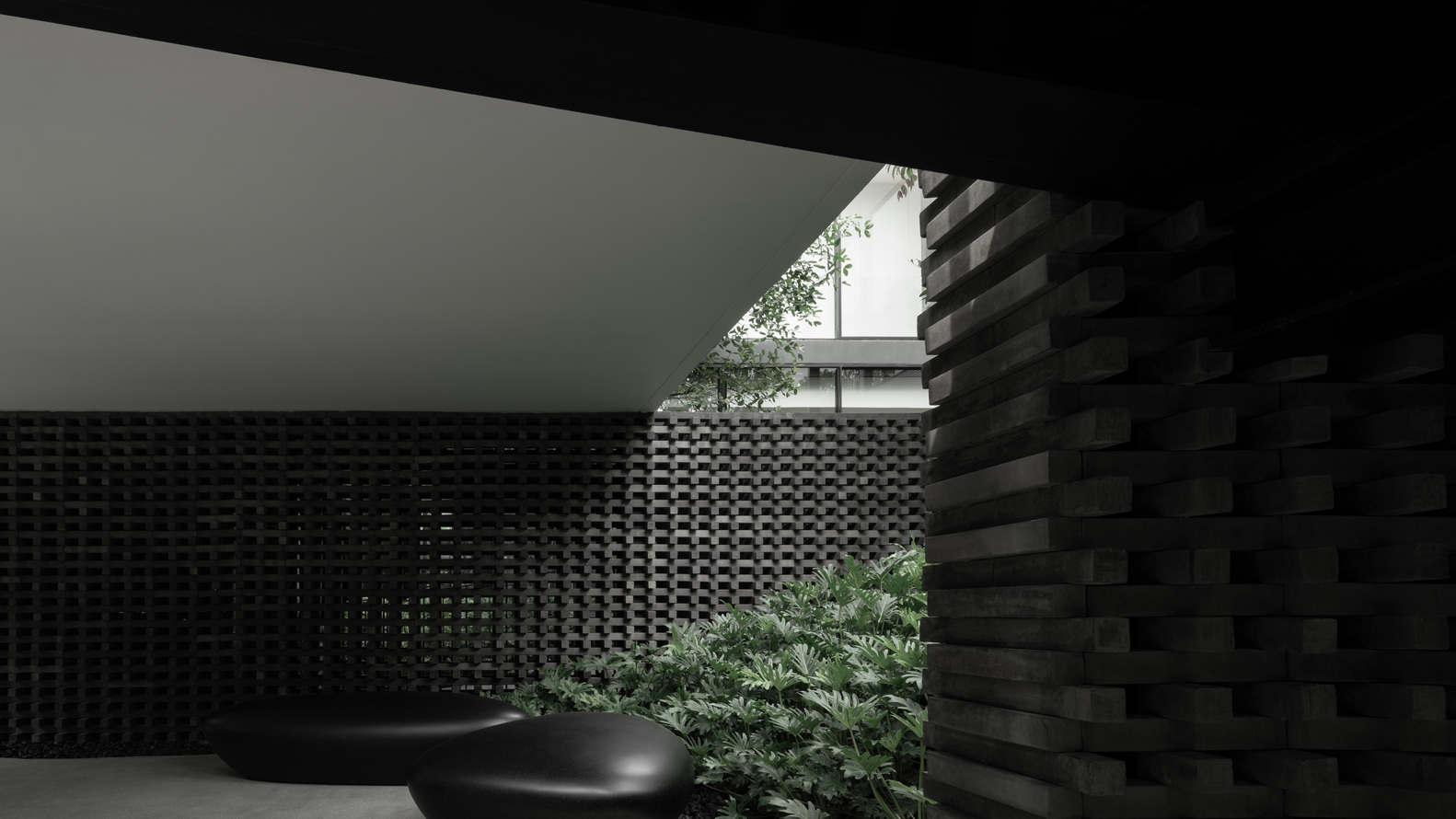 该住宅采用双层外立面设计,主要建筑材料选用灰色烧结砖。两块瓷砖呈对角线交错排列,形成连续的单元,造就了外立面独特的纹理图案。这种图案既能过滤热量、保障隐私,又能在阳光照射下形成独特的光影效果。烧结砖不仅维护成本低,其色泽会随时间推移自然变化,这种变化也被纳入设计考量 —— 住宅借此与自然风化的过程形成了和谐共生的关系。