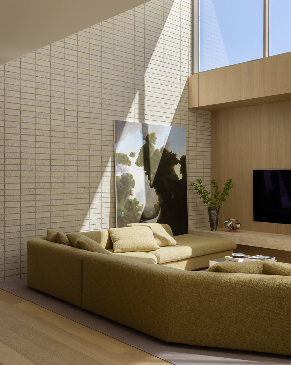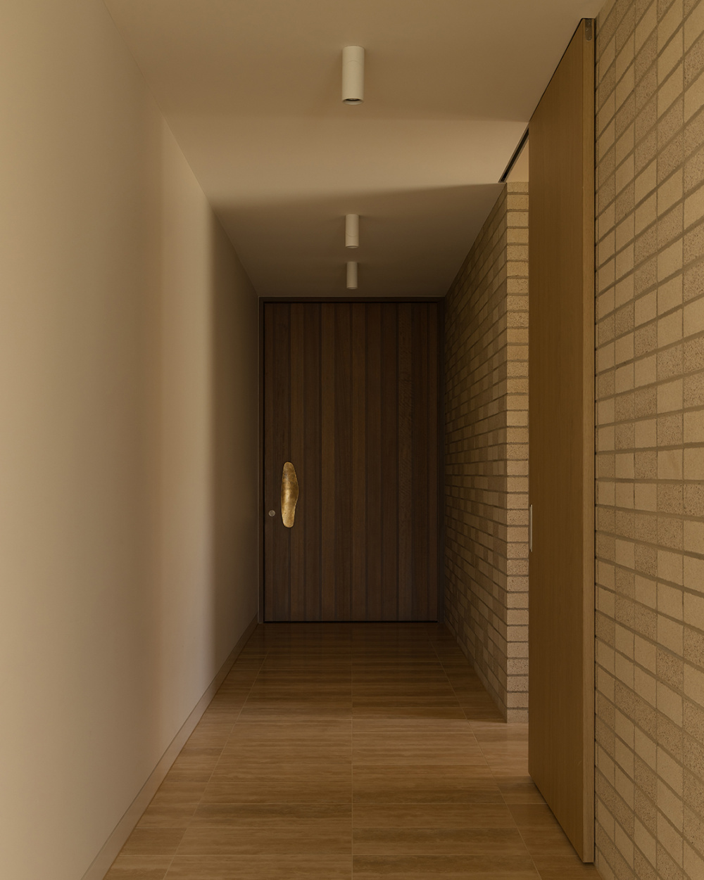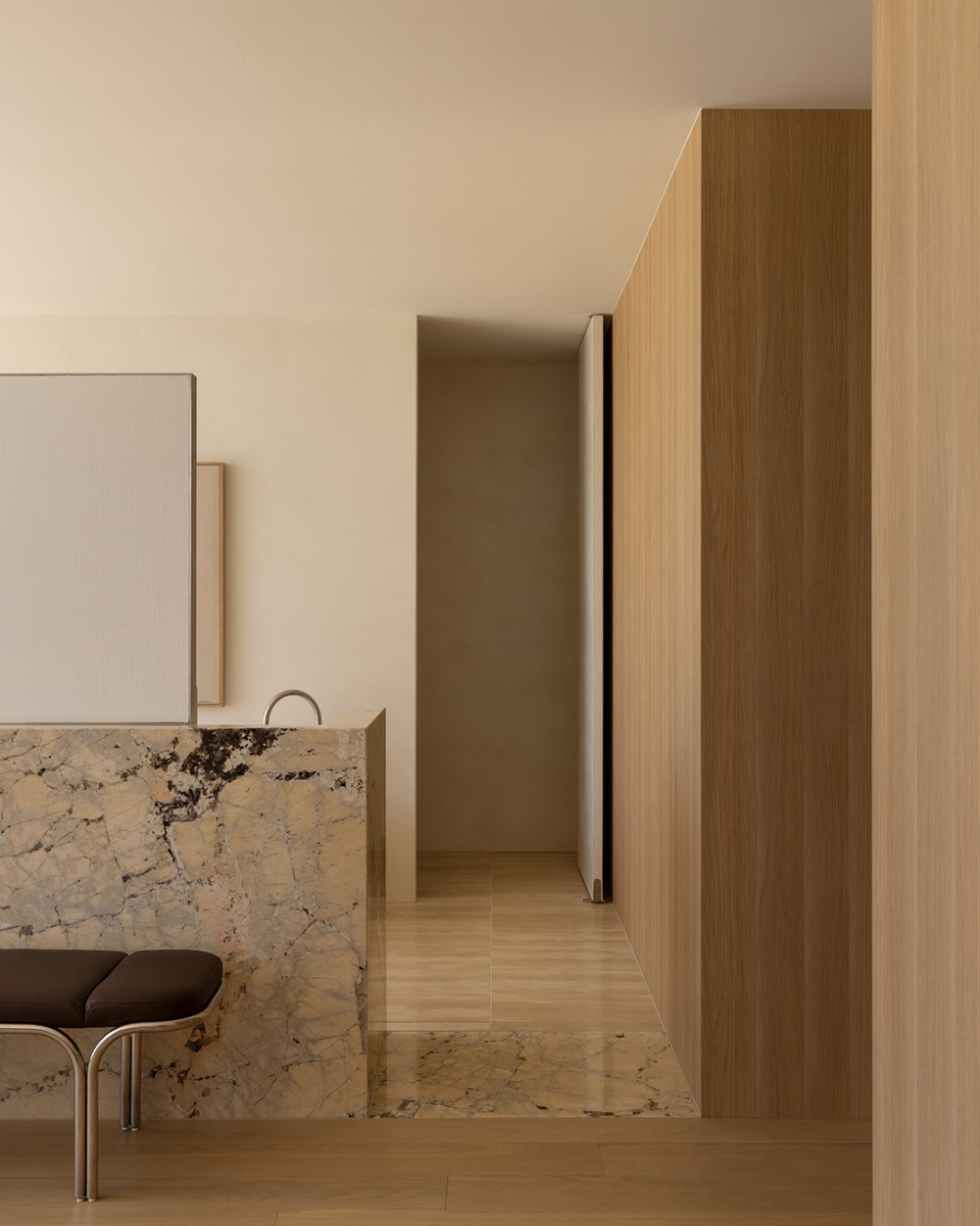 天然耐用的材料被赋予规整的几何形态,砖石的坚固、木材的温暖、混凝土的纯粹,在时光的沉淀中会愈发醇厚。它们共同构筑的不仅是一座建筑,更是一部 “可触摸的时间简史”—— 每一道纹理的加深、每一处色泽的变化,都是岁月赋予建筑的独特勋章,让它在时代的浪潮中始终保持着经典的姿态。规整的几何美学从外立面延伸至空间布局,造就了开阔通透、采光充沛的室内叙事。入口门厅以奢华宽幅的姿态展开,洞石地板的天然纹理如大地的脉络,为整座住宅奠定了 “自然奢华” 的基调,让归家的仪式感在第一步就被精准唤醒。