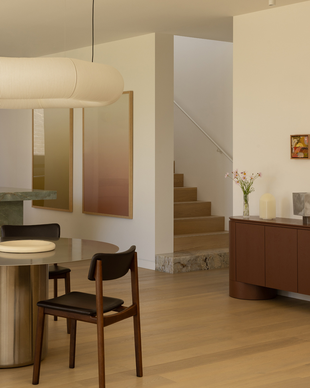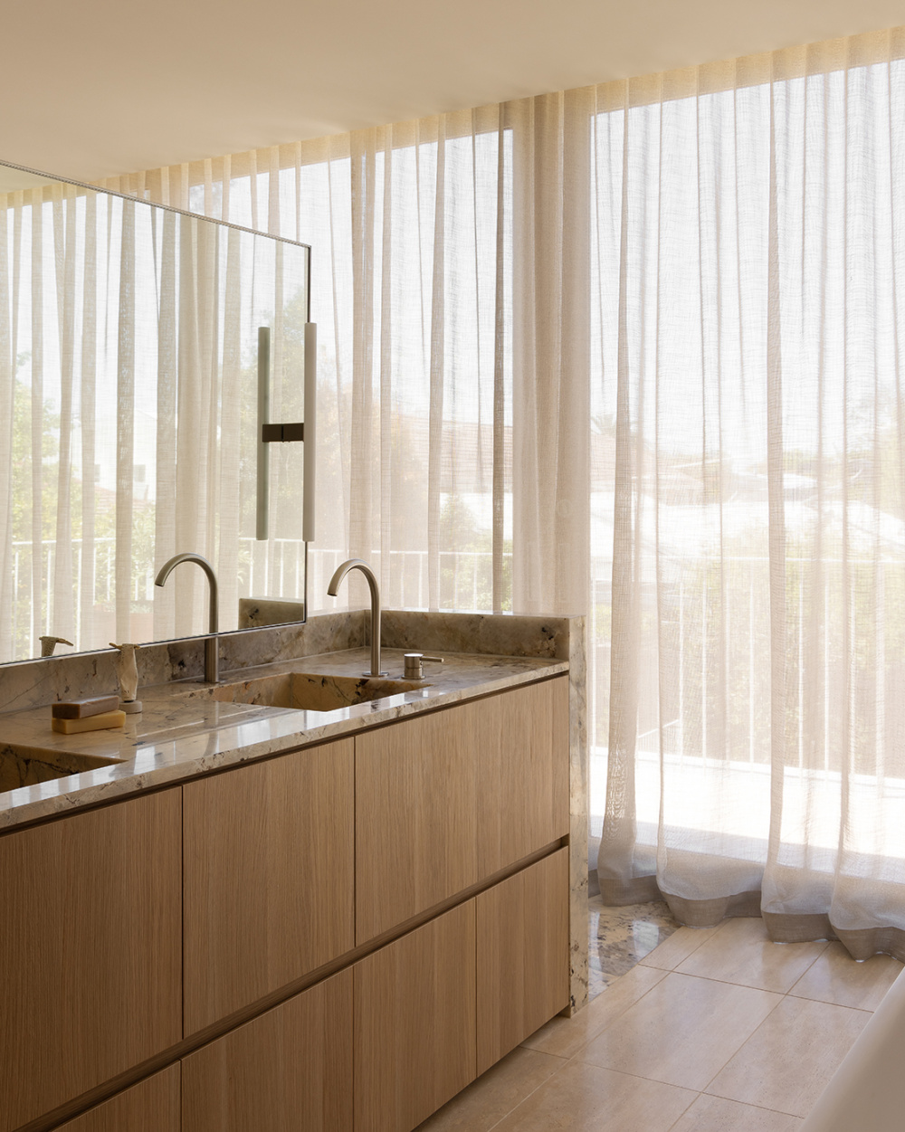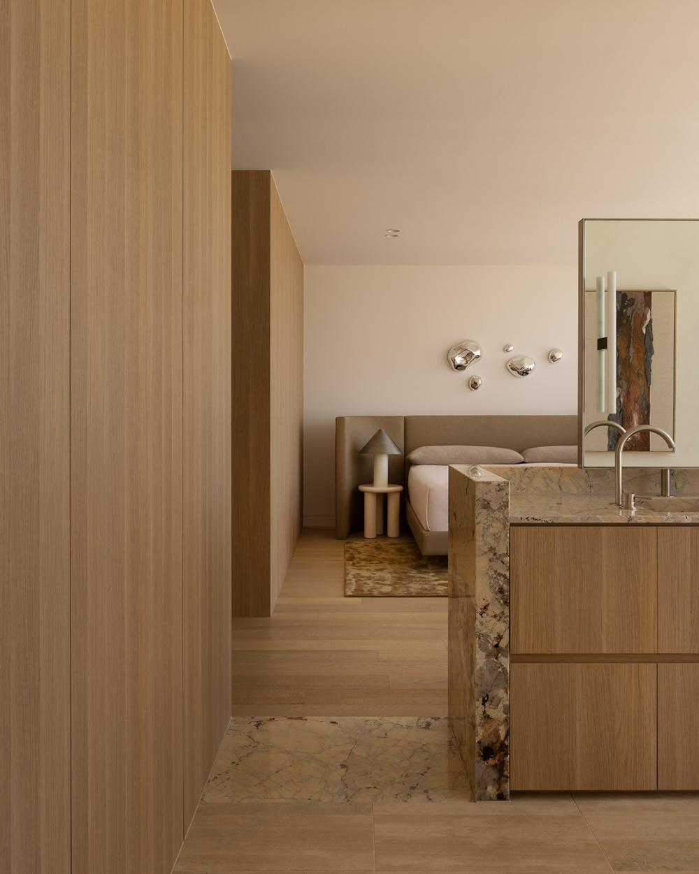 天然耐用的材料被赋予规整的几何形态,砖石的坚固、木材的温暖、混凝土的纯粹,在时光的沉淀中会愈发醇厚。它们共同构筑的不仅是一座建筑,更是一部 “可触摸的时间简史”—— 每一道纹理的加深、每一处色泽的变化,都是岁月赋予建筑的独特勋章,让它在时代的浪潮中始终保持着经典的姿态。规整的几何美学从外立面延伸至空间布局,造就了开阔通透、采光充沛的室内叙事。入口门厅以奢华宽幅的姿态展开,洞石地板的天然纹理如大地的脉络,为整座住宅奠定了 “自然奢华” 的基调,让归家的仪式感在第一步就被精准唤醒。