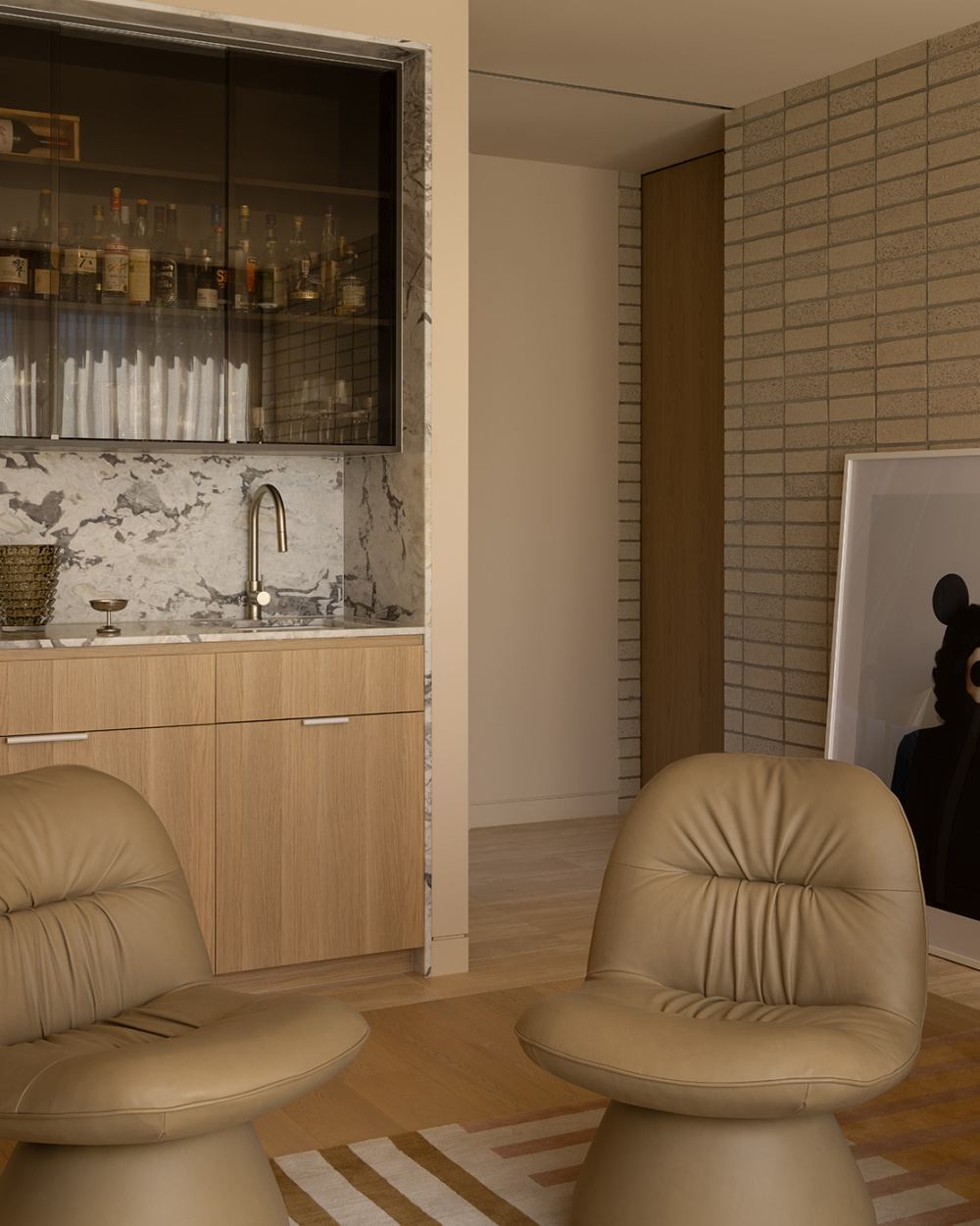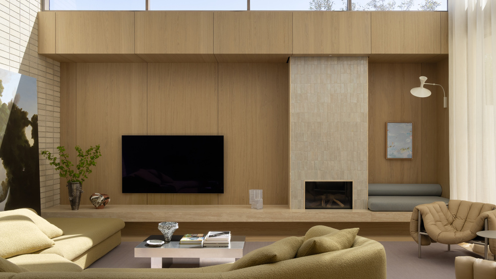 挑高两层的客厅与泳池呈直线排布,形成极具冲击力的视觉轴线。薄纱窗帘在光线中轻舞,木质墙板传递着温暖的触觉,柔和的色调与材质的对比(洞石的冷硬与木材的温润),让客厅成为 “静谧舒适的休憩之所”。而石英岩中岛台则是这方空间的精神核心,它既是家庭烹饪、交流的物理中心,更是 “材质、空间与光线” 三者关系的具象表达 —— 石英岩的坚硬与空间的柔和对话,光线在其表面的反射与折射,让生活的温馨在材质的碰撞中自然流淌。楼下的休息室、书房等空间则转向 “私密与厚重” 的氛围,浓郁的色调与围合的布局,为阅读、冥想等需求提供了专属的静谧场域,实现了 “公共空间的通透” 与 “私密空间的围合” 的完美平衡。